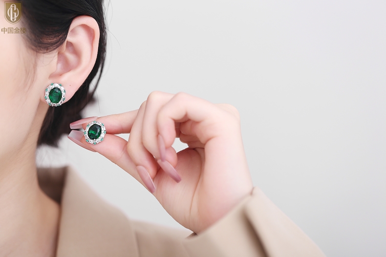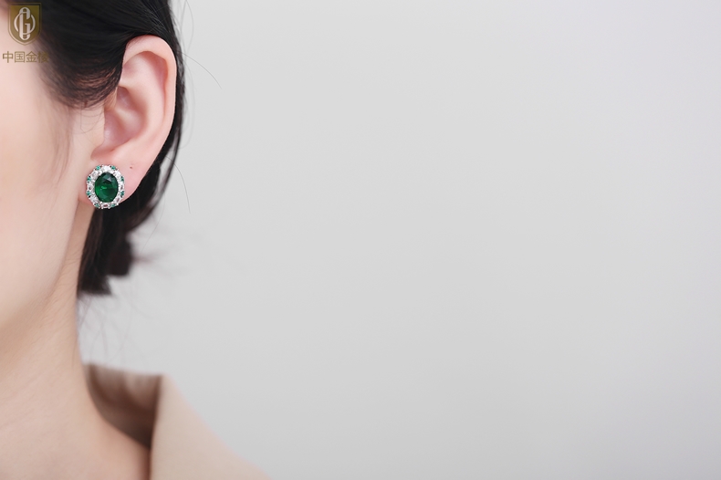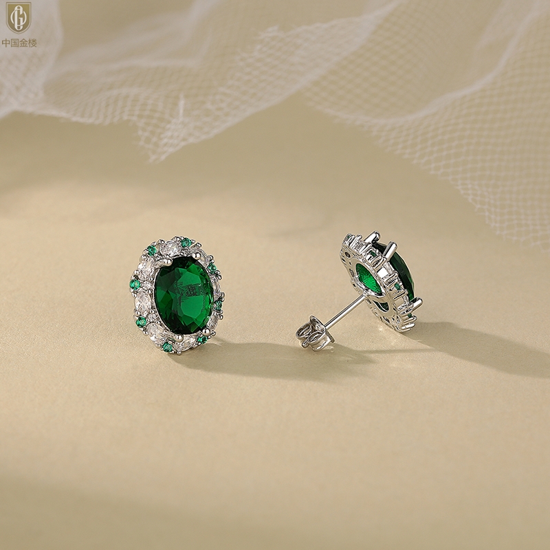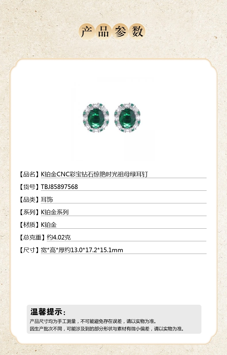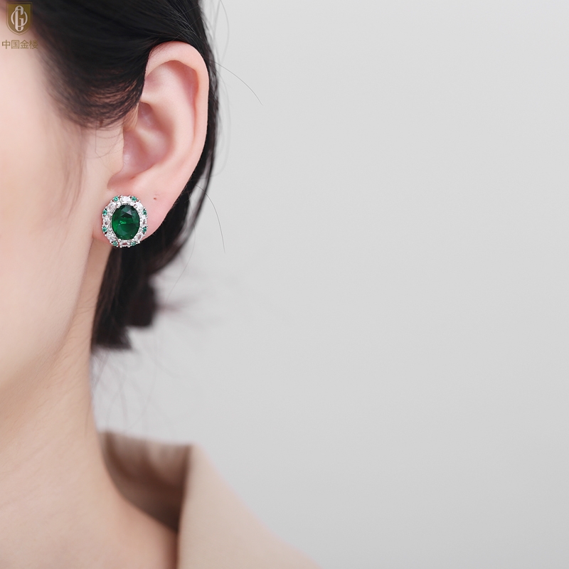 【品名】中国金楼K铂金CNC彩宝钻石惊艳时光祖母绿耳钉