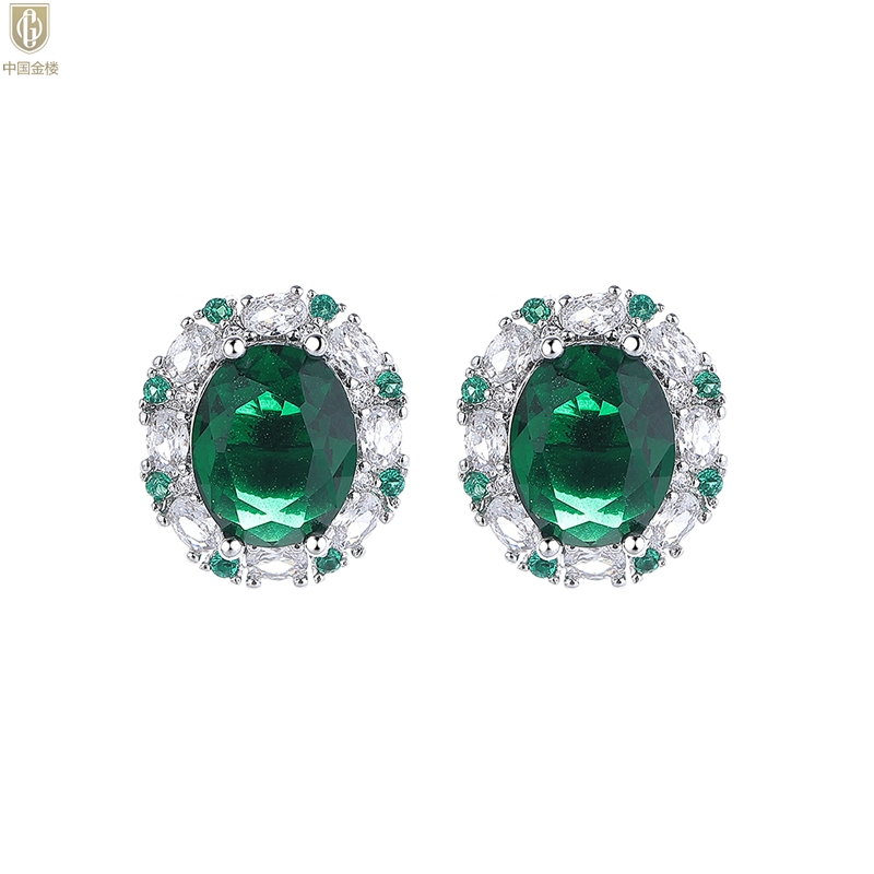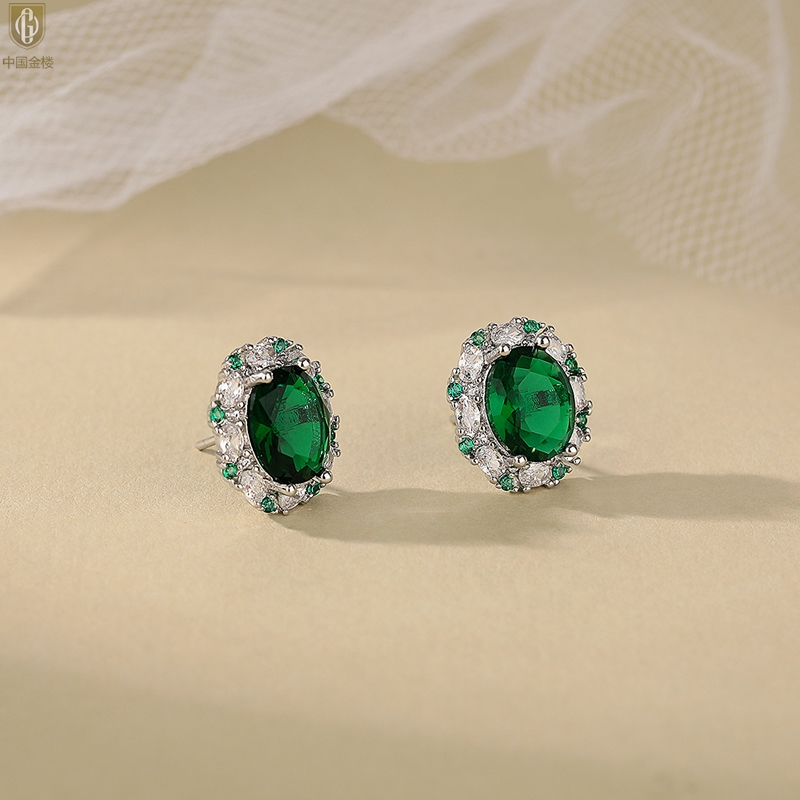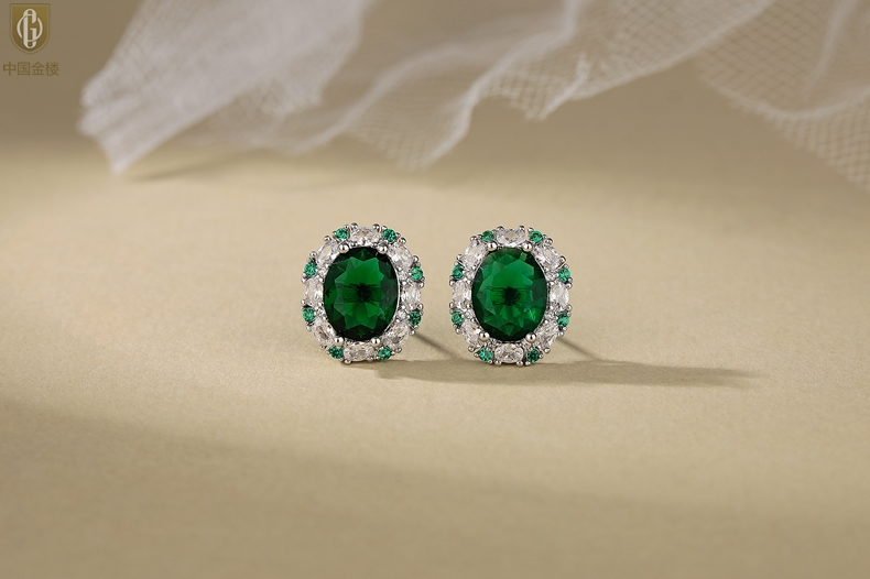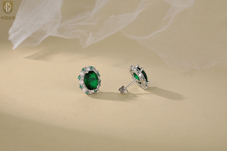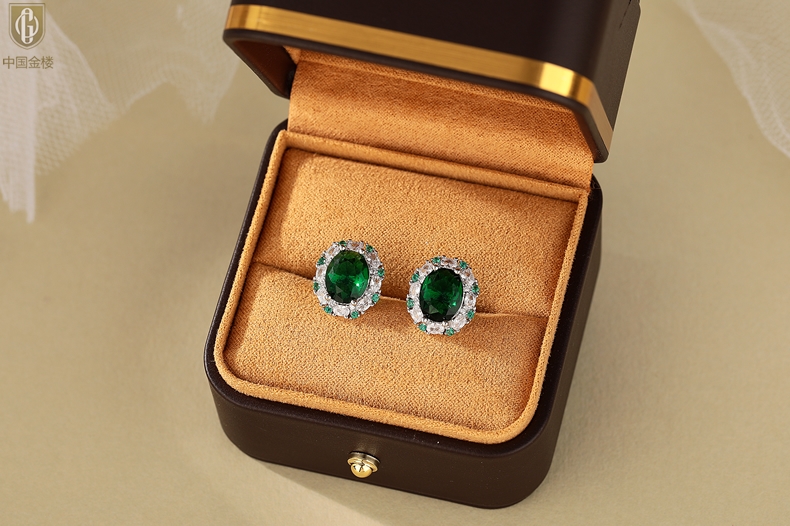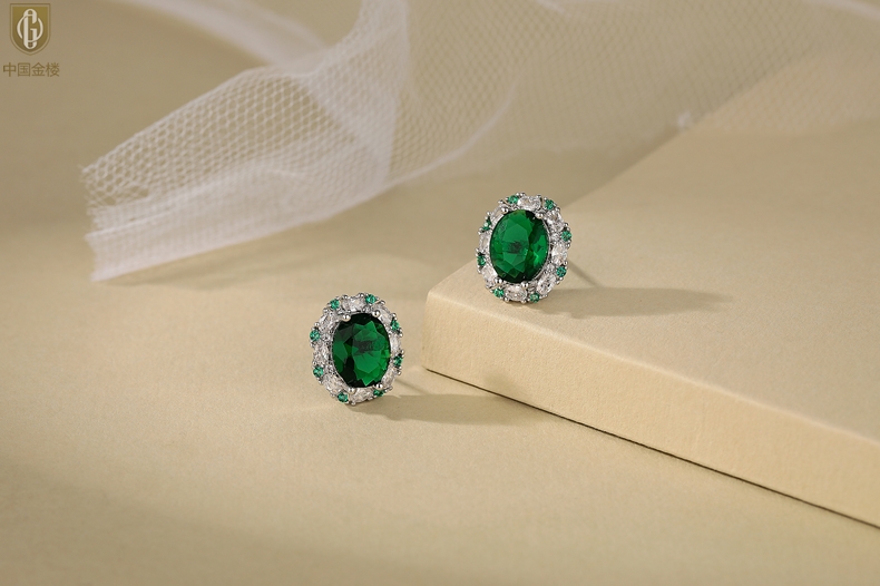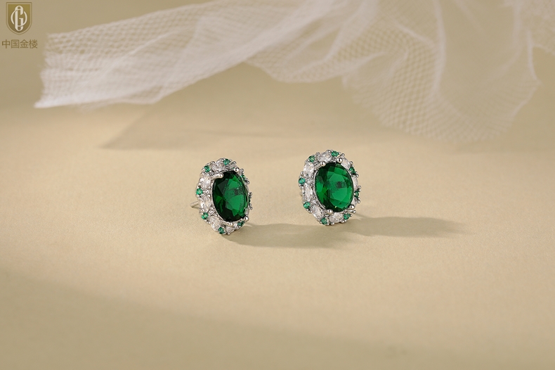 【品名】中国金楼K铂金CNC彩宝钻石惊艳时光祖母绿耳钉