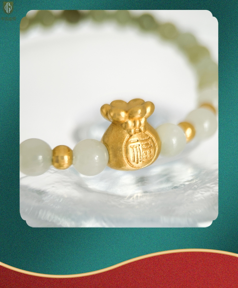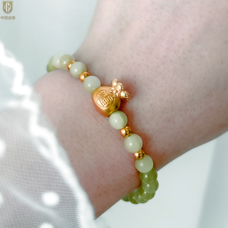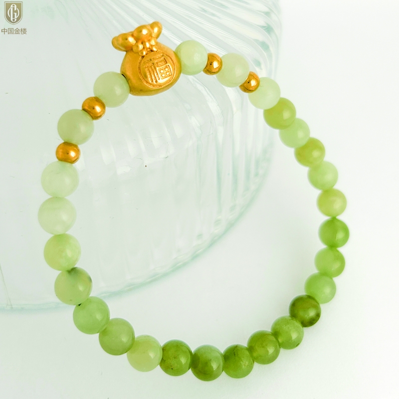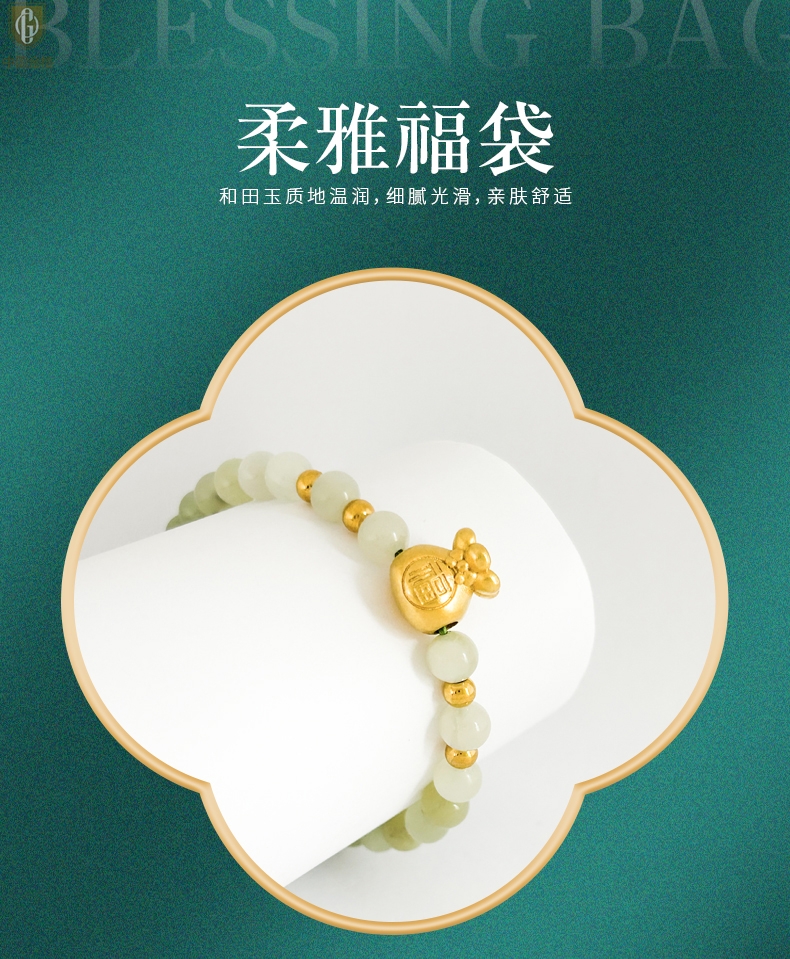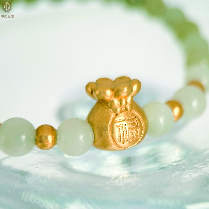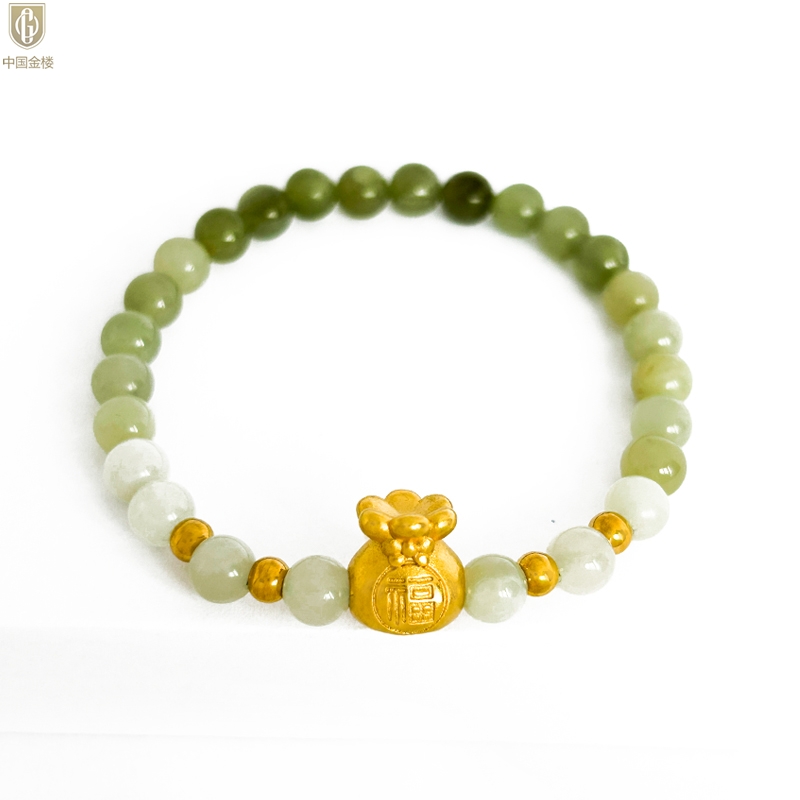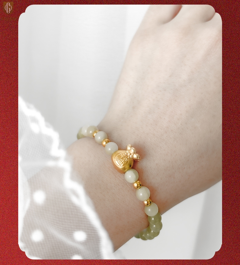 【品名】中国金楼柔雅福袋K金和田玉手串