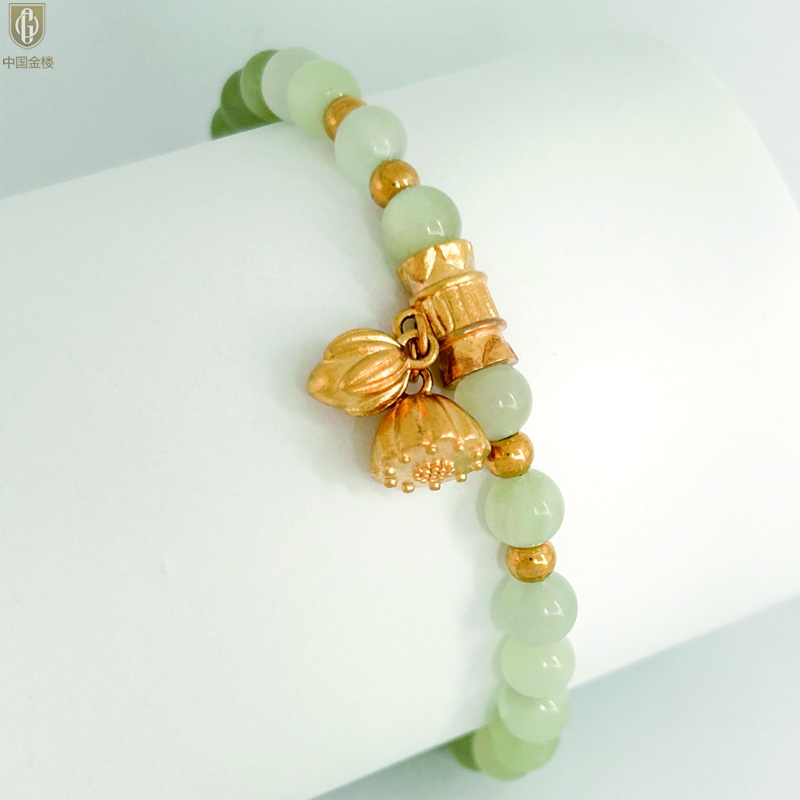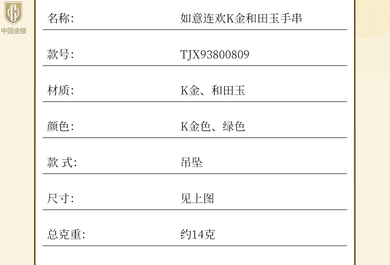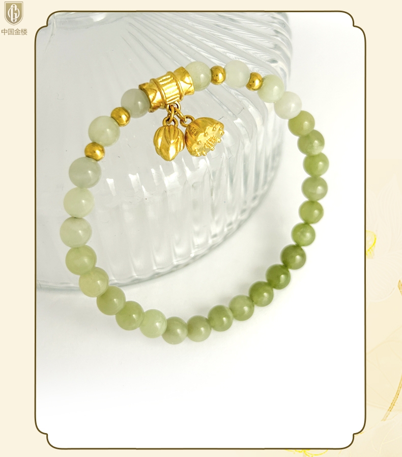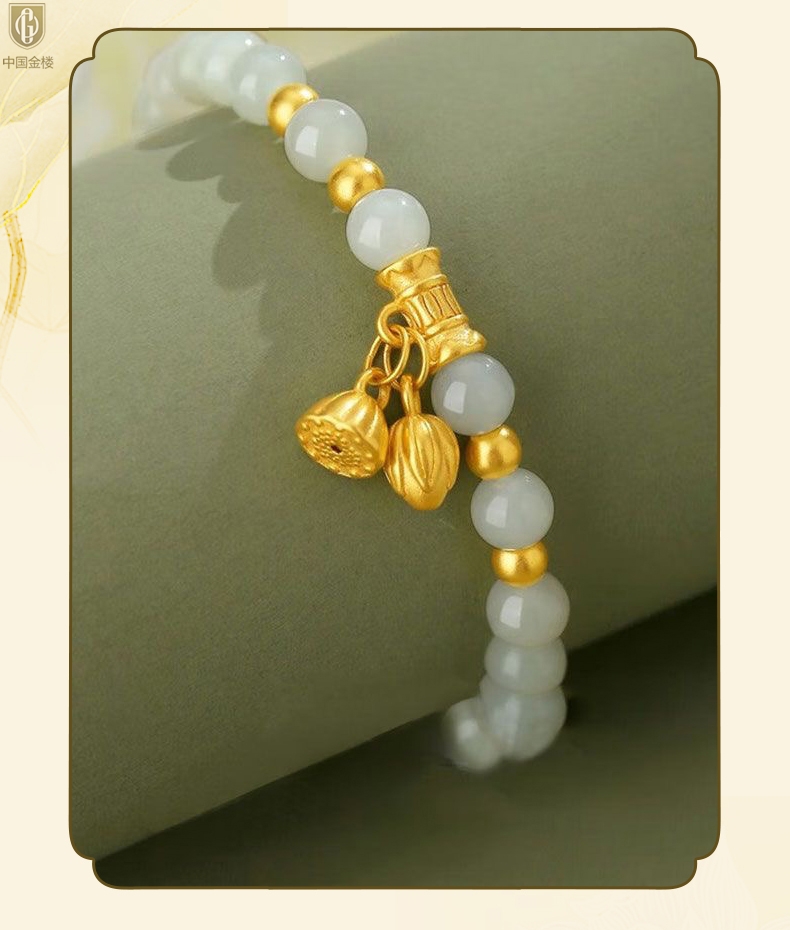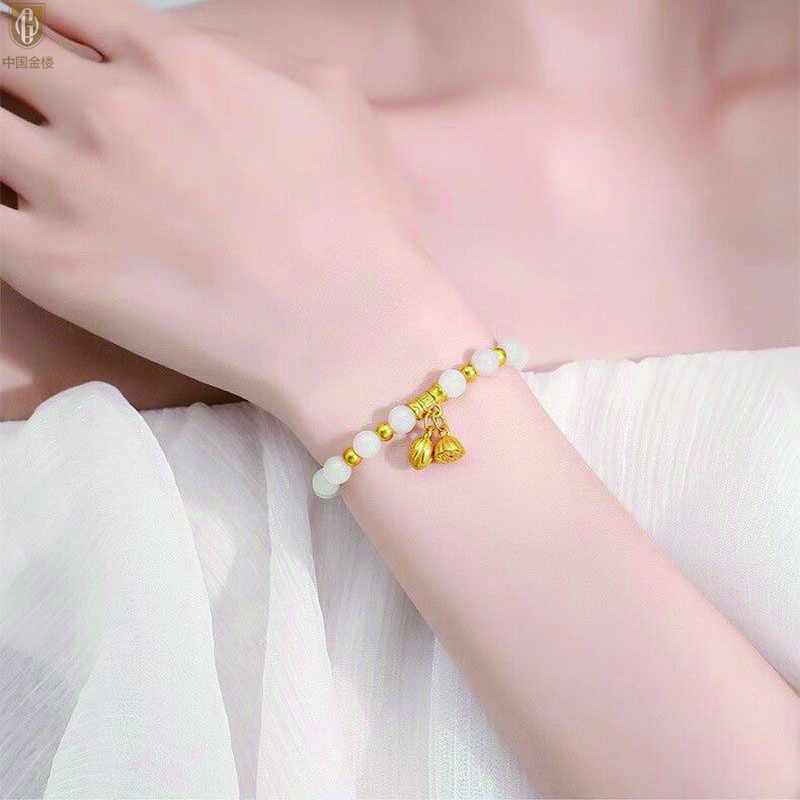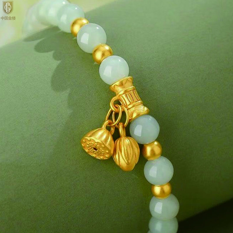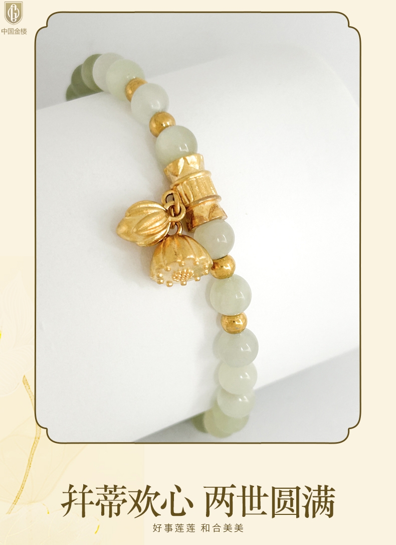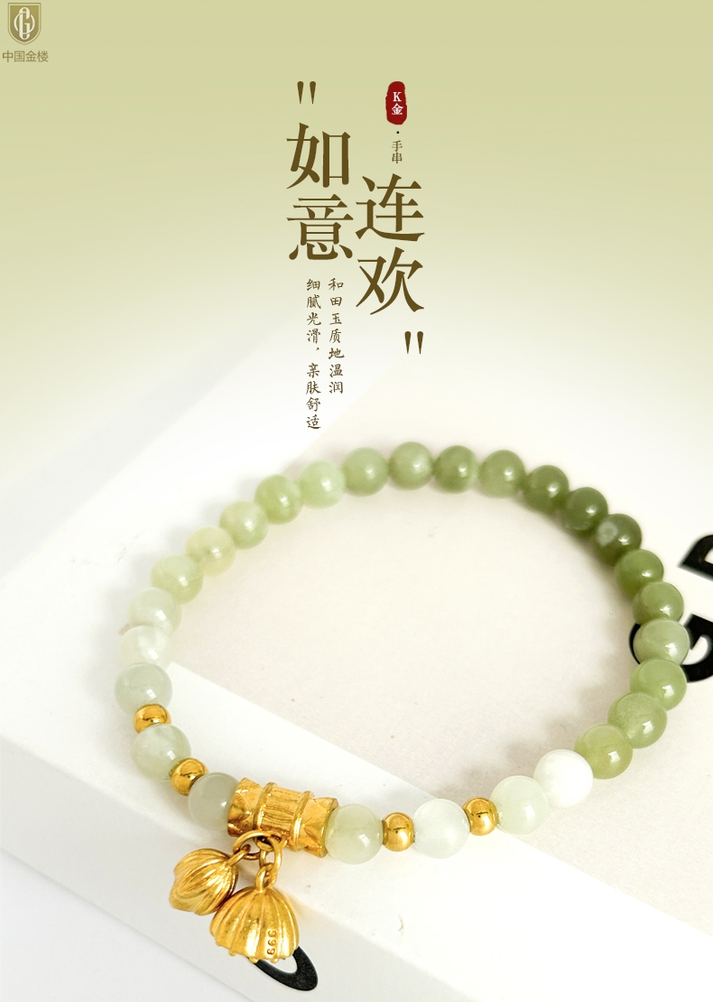 【品名】中国金楼如意连欢K金和田玉手串