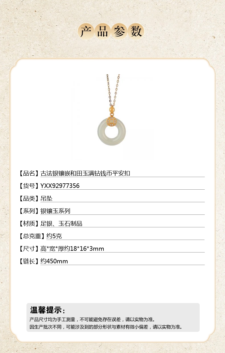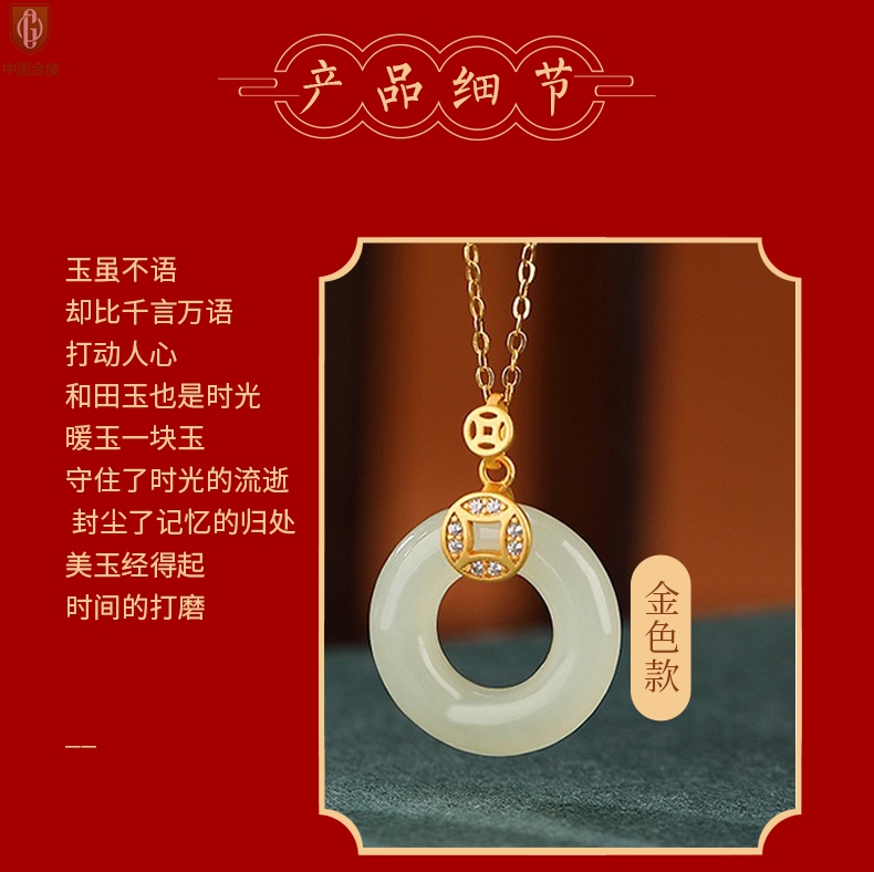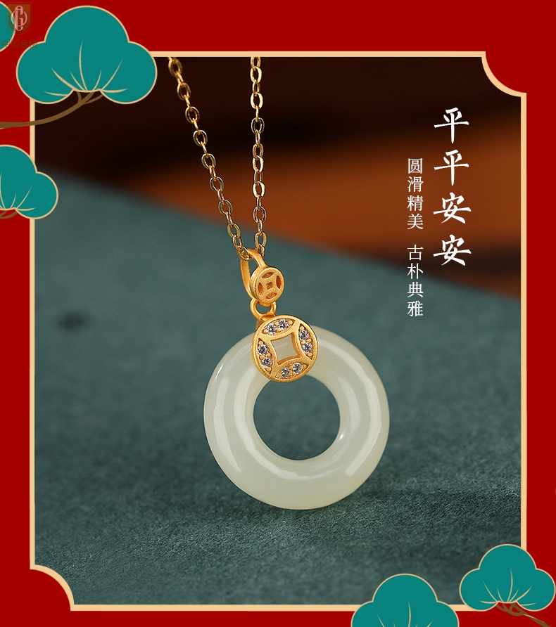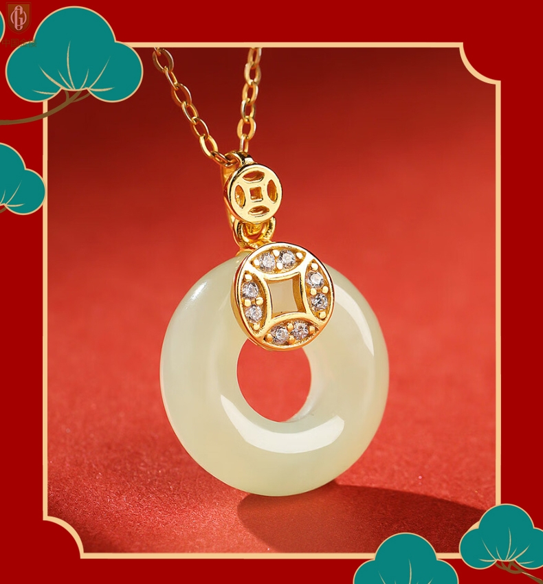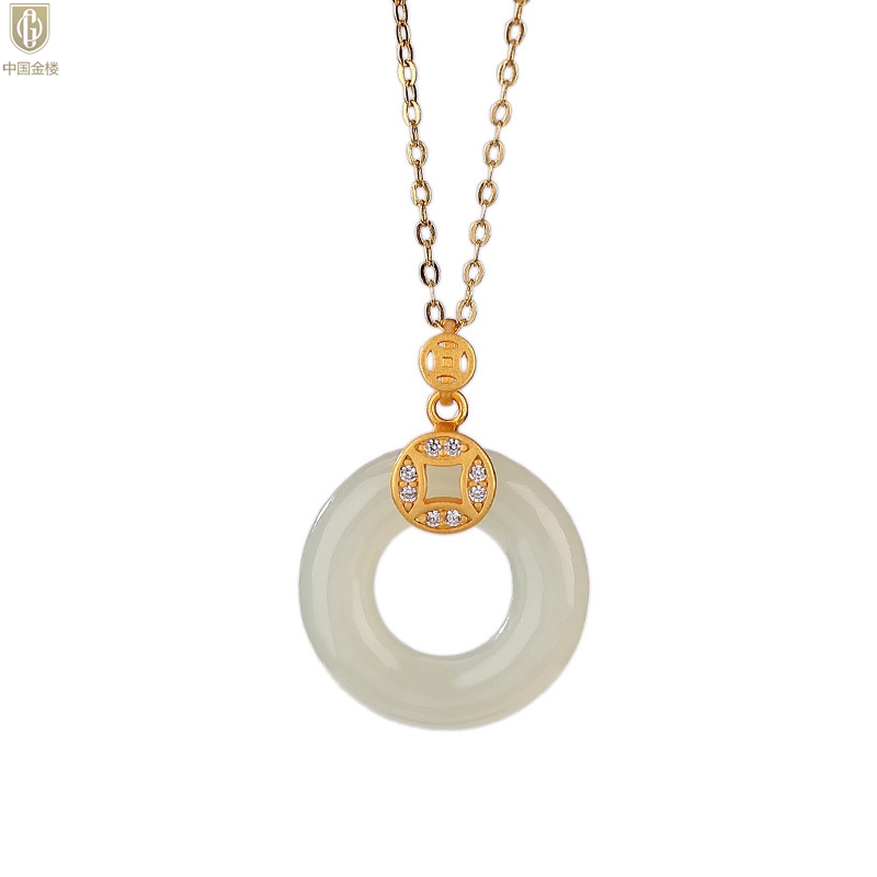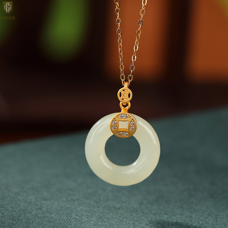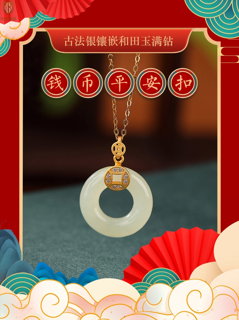 【品名】中国金楼古法银镶嵌和田玉满钻钱币平安扣