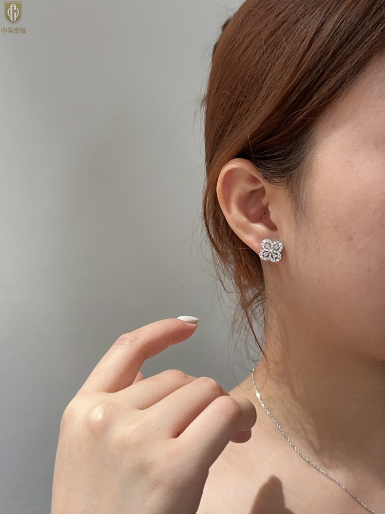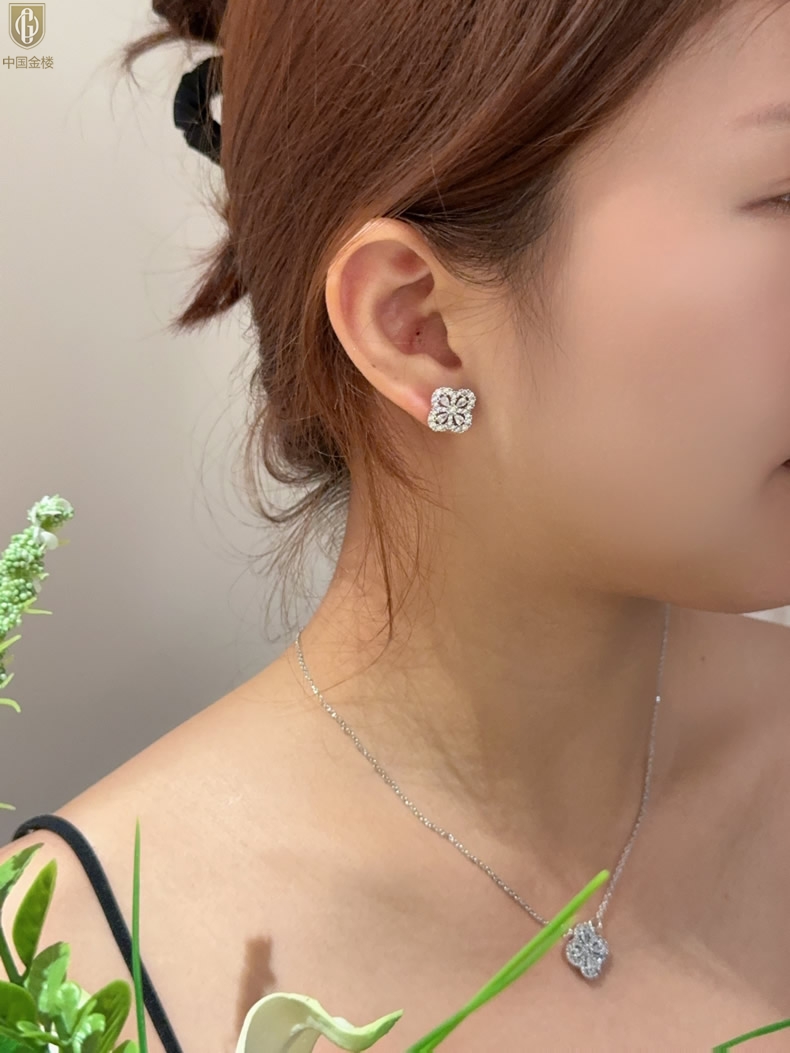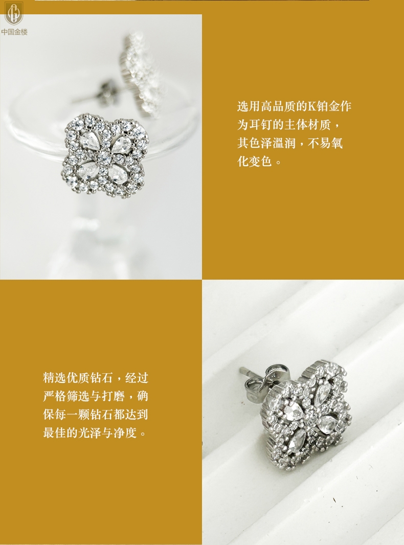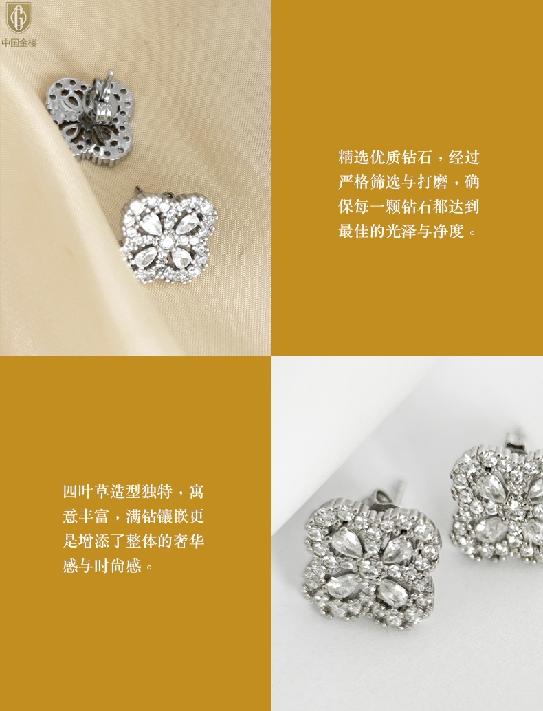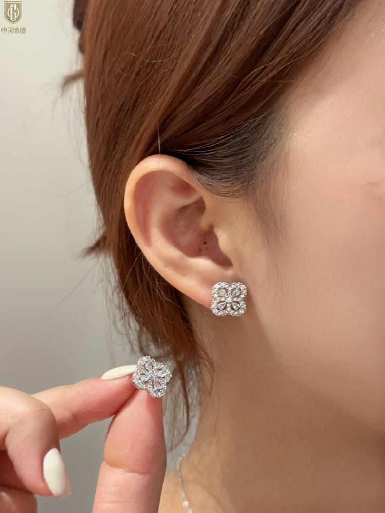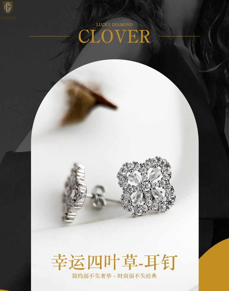 【品名】中国金楼幸运满钻四叶草K铂金耳钉(高定礼盒)