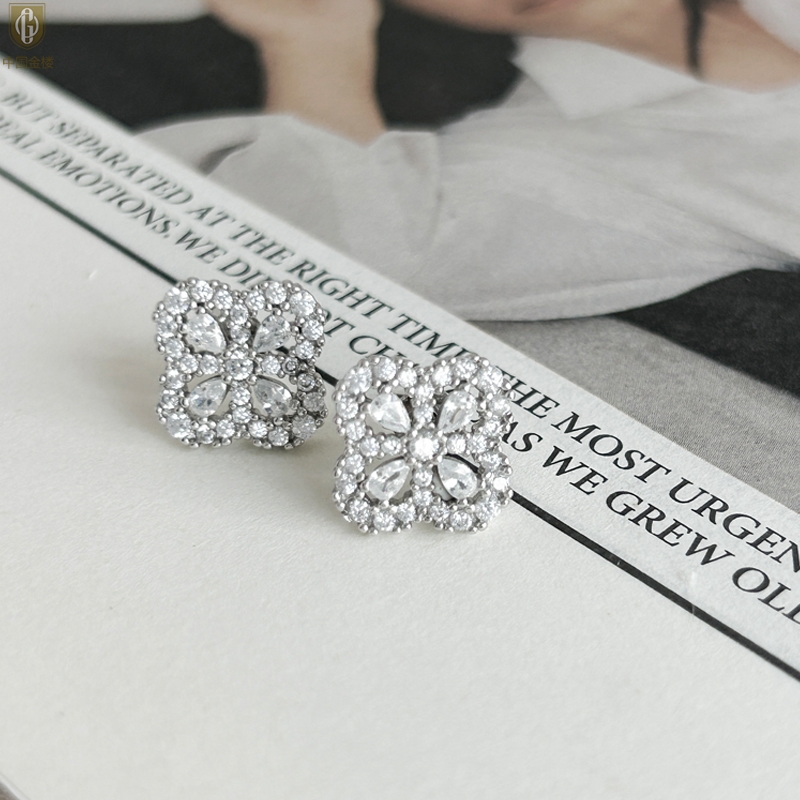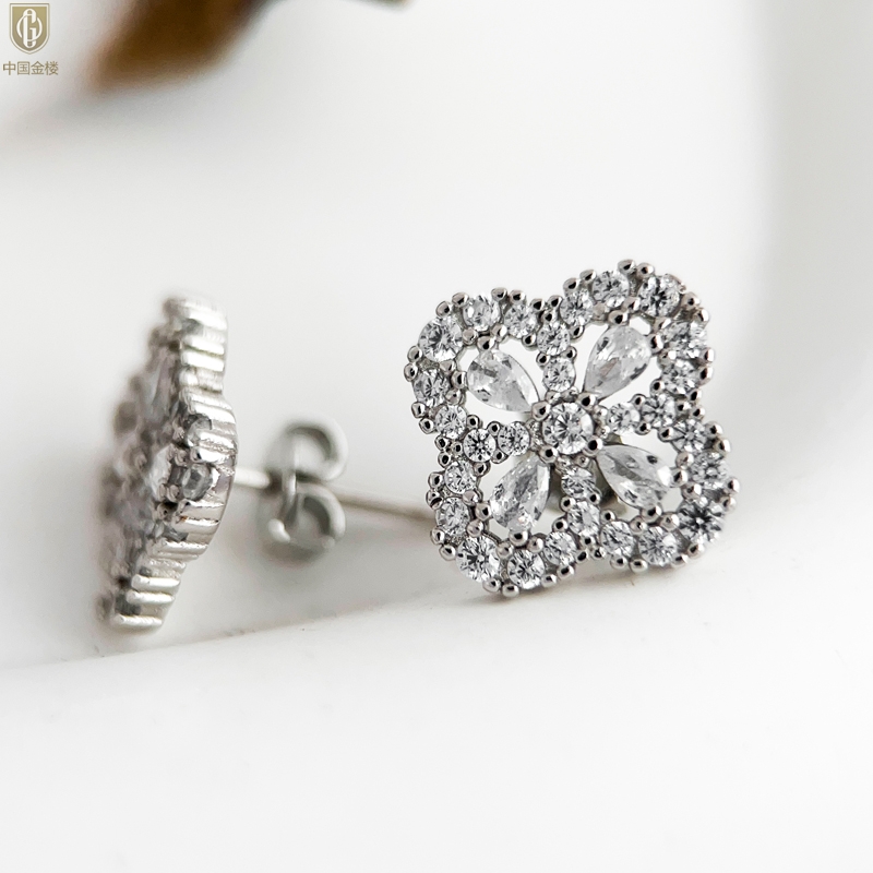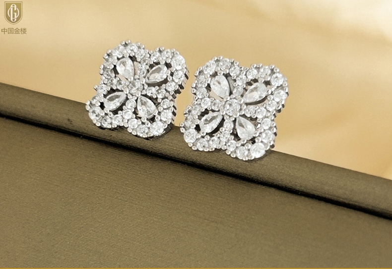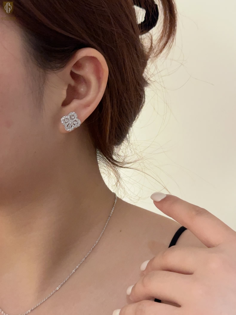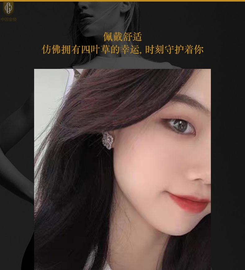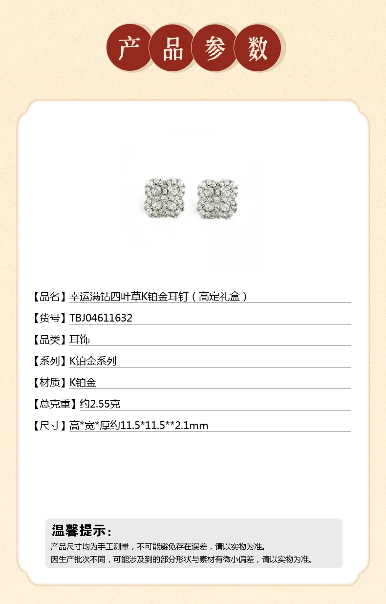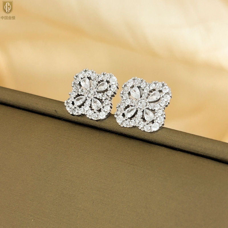 【品名】中国金楼幸运满钻四叶草K铂金耳钉(高定礼盒)