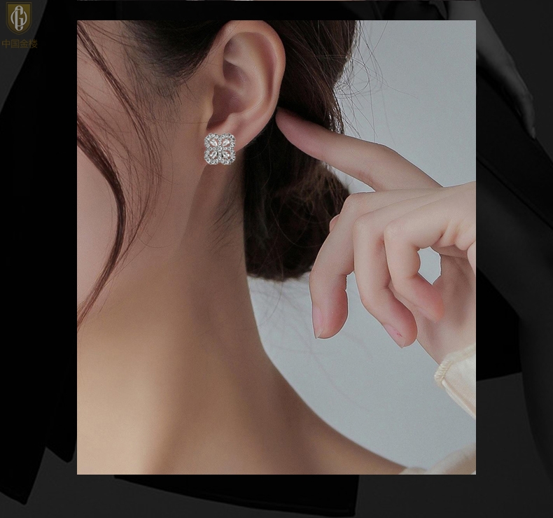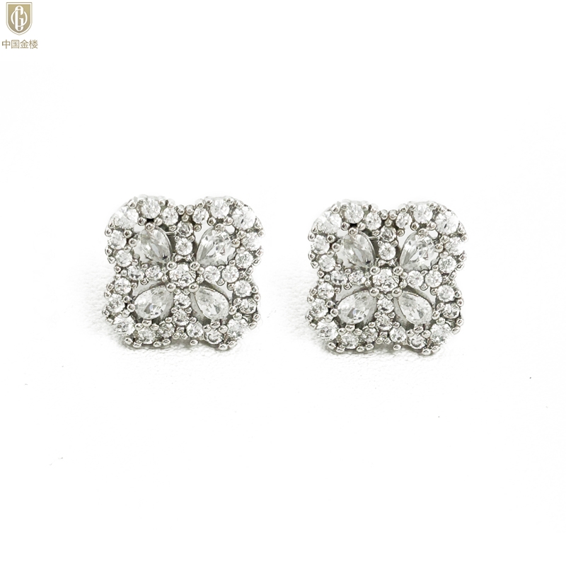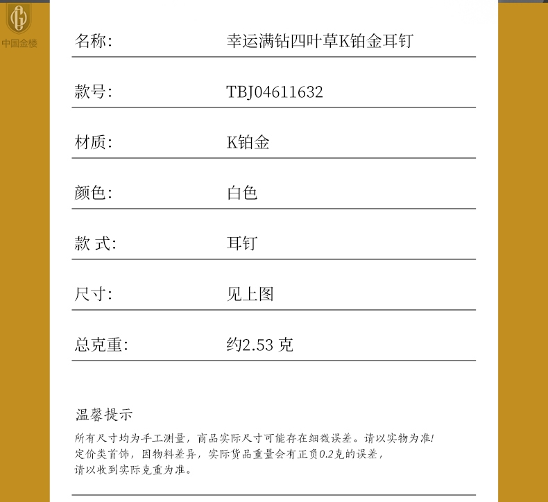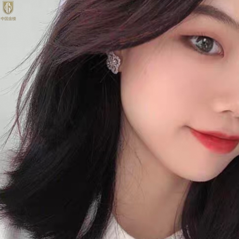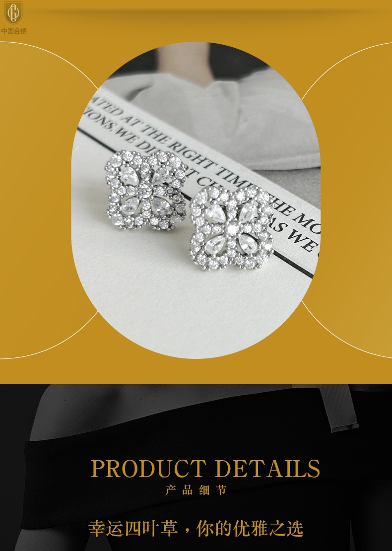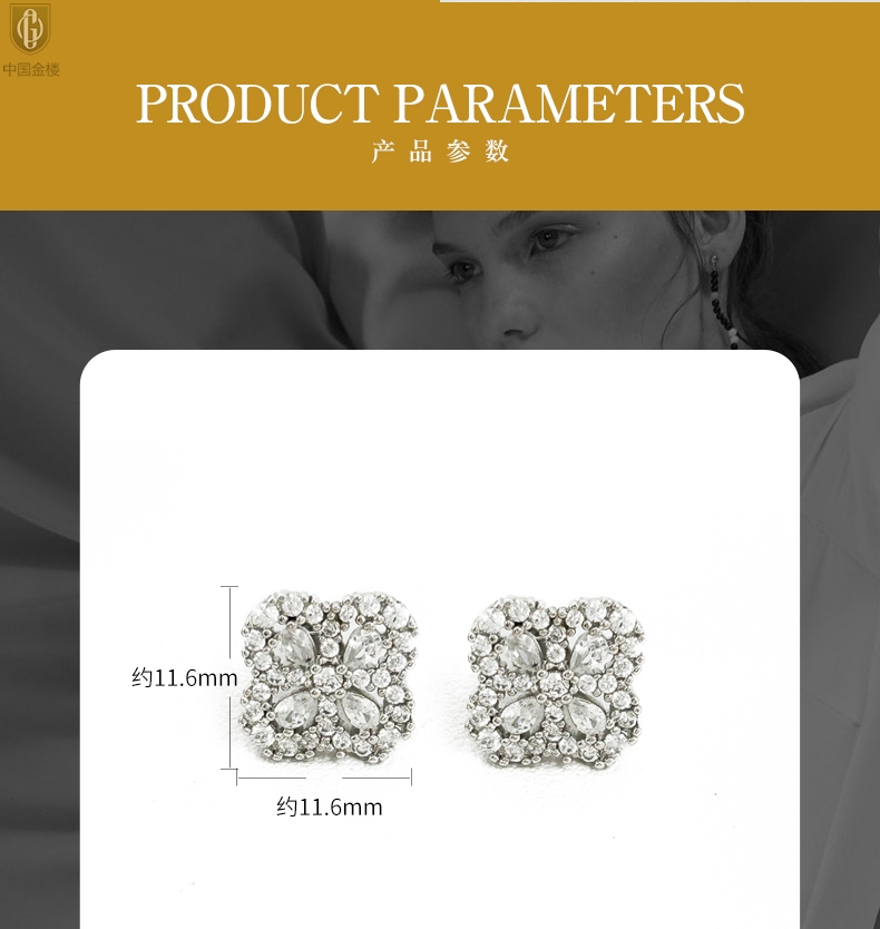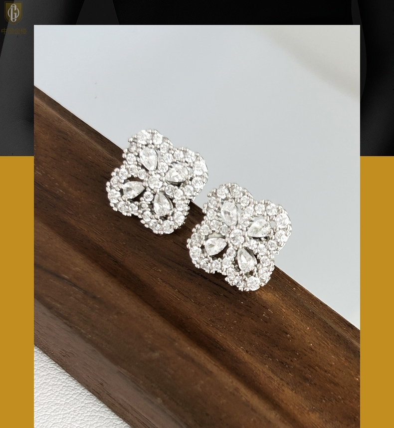 【品名】中国金楼幸运满钻四叶草K铂金耳钉(高定礼盒)