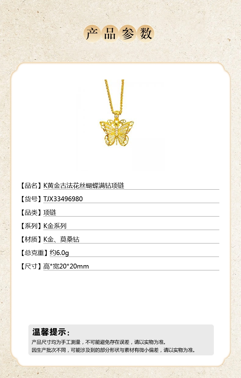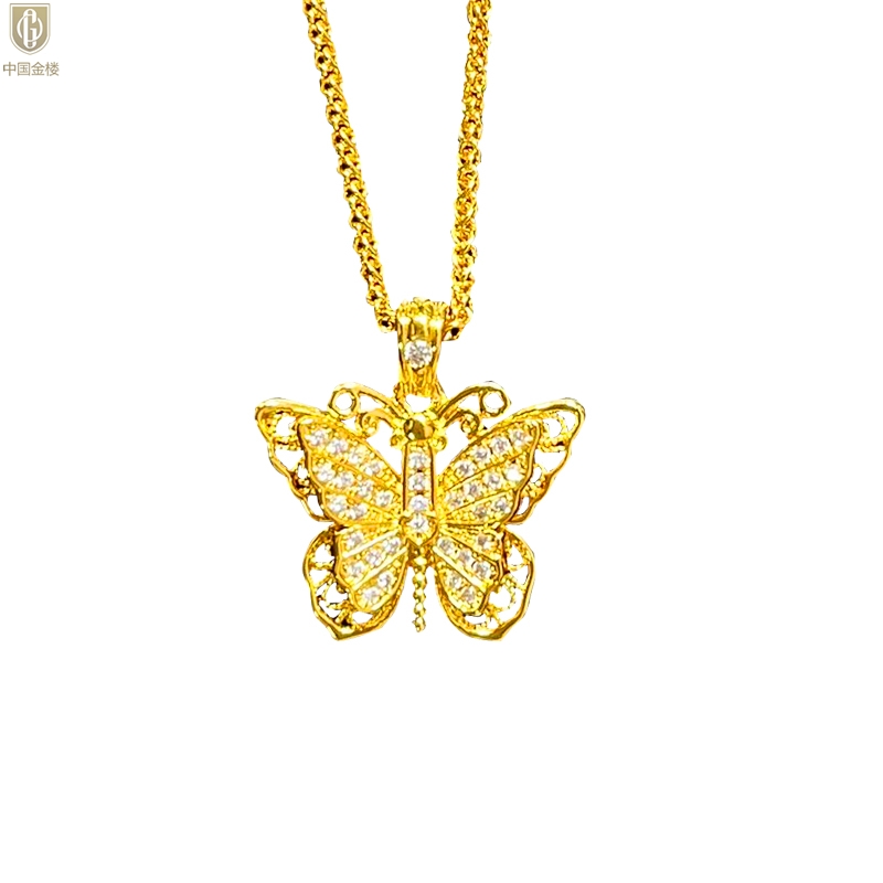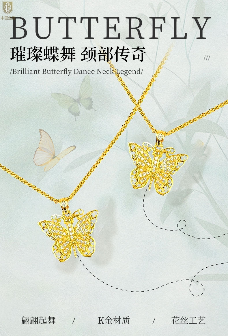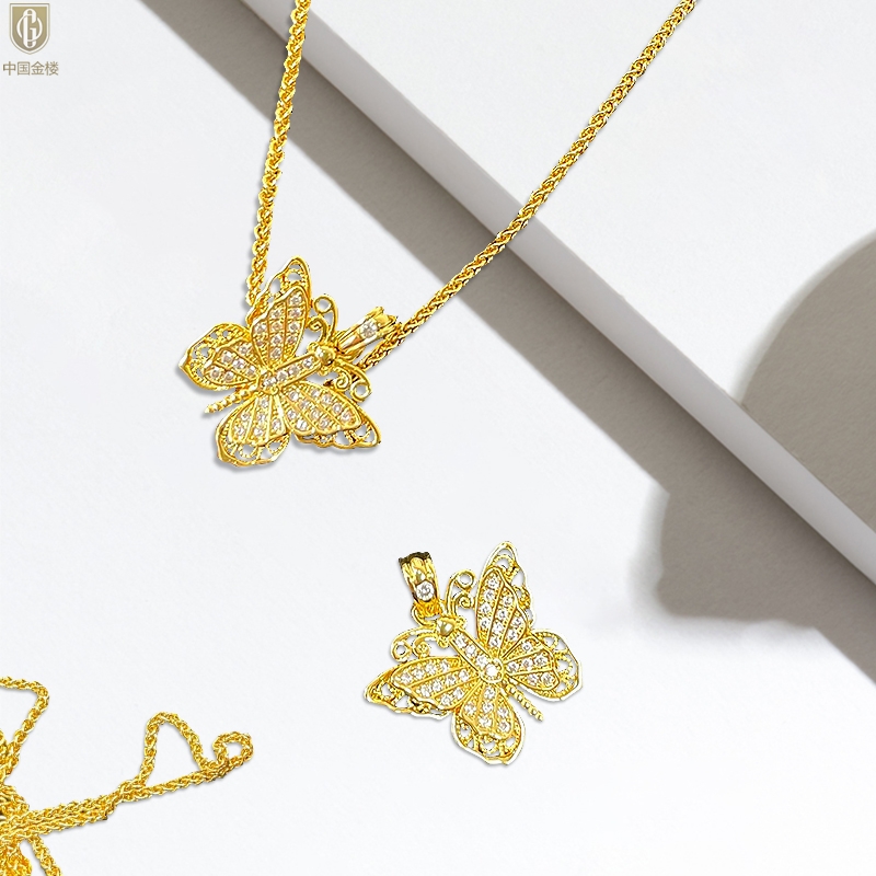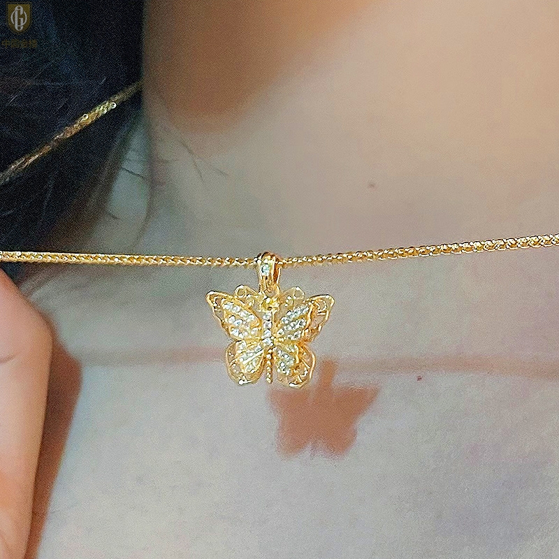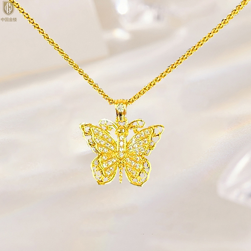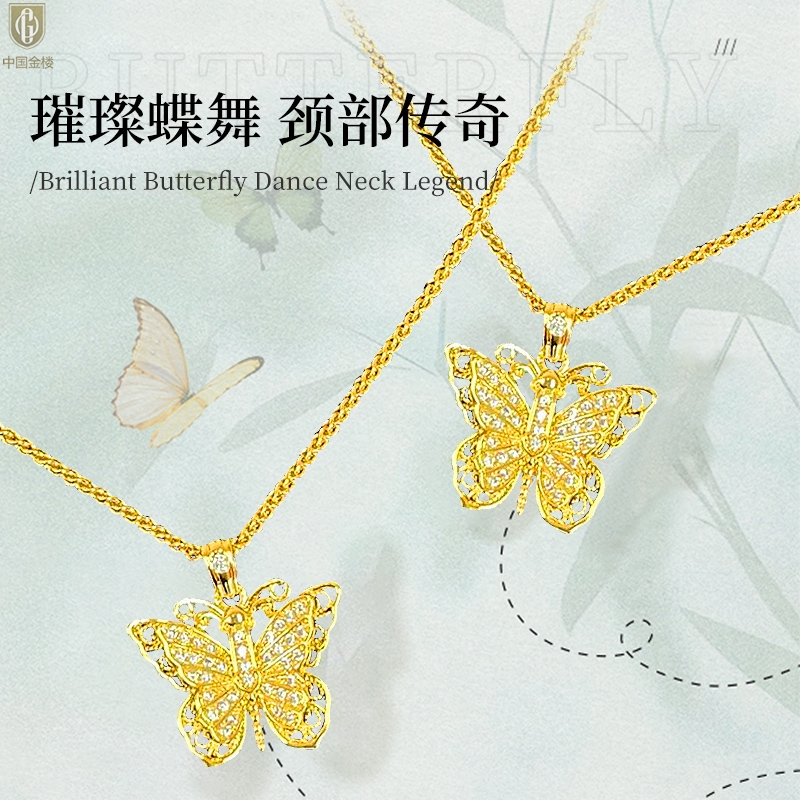 【品名】中国金楼K黄金古法花丝蝴蝶满钻项链