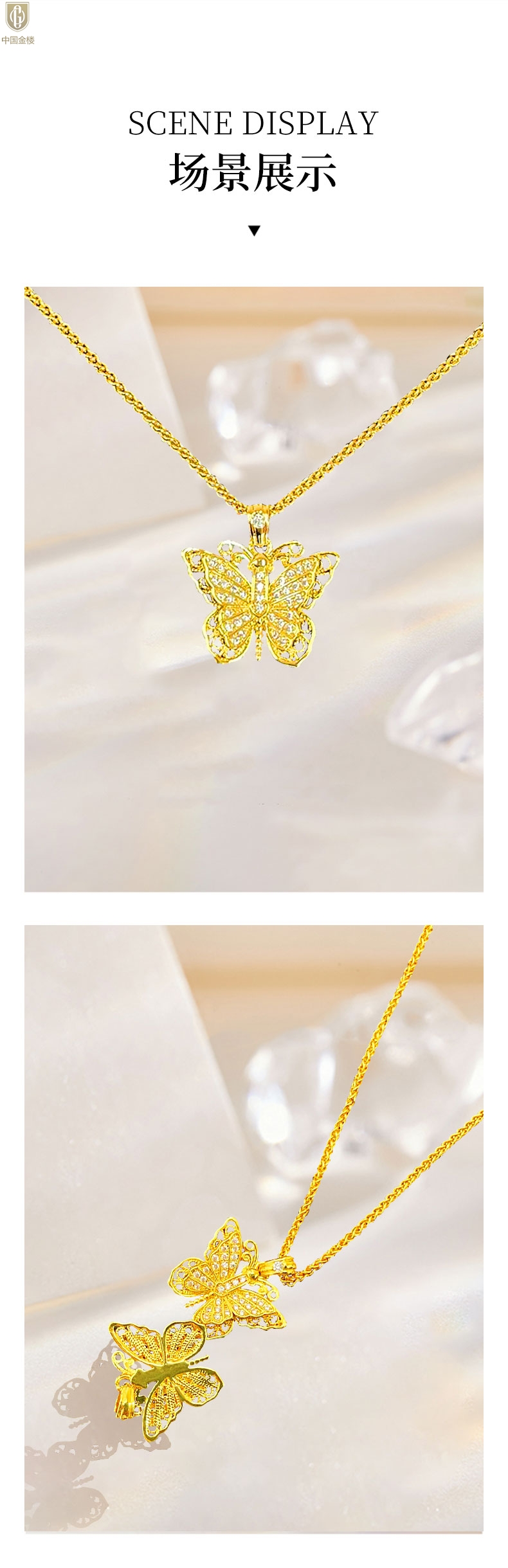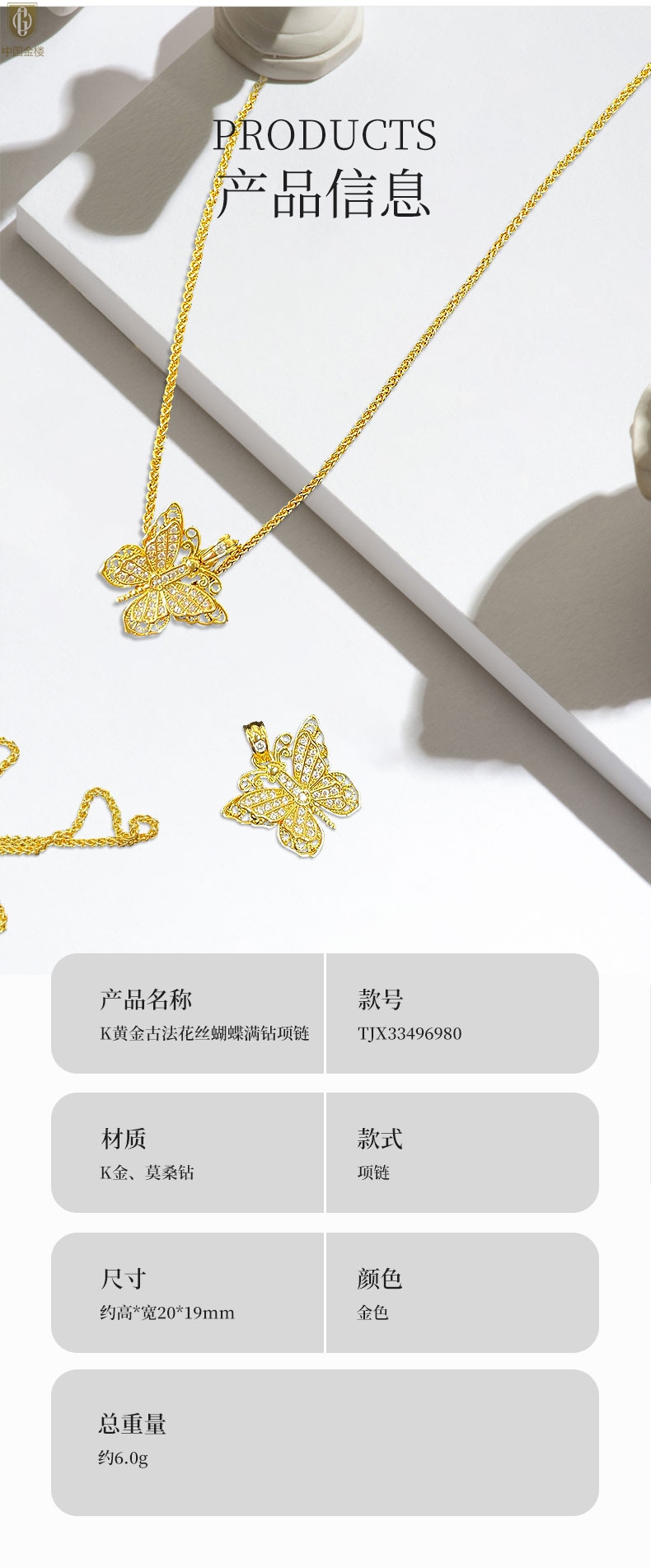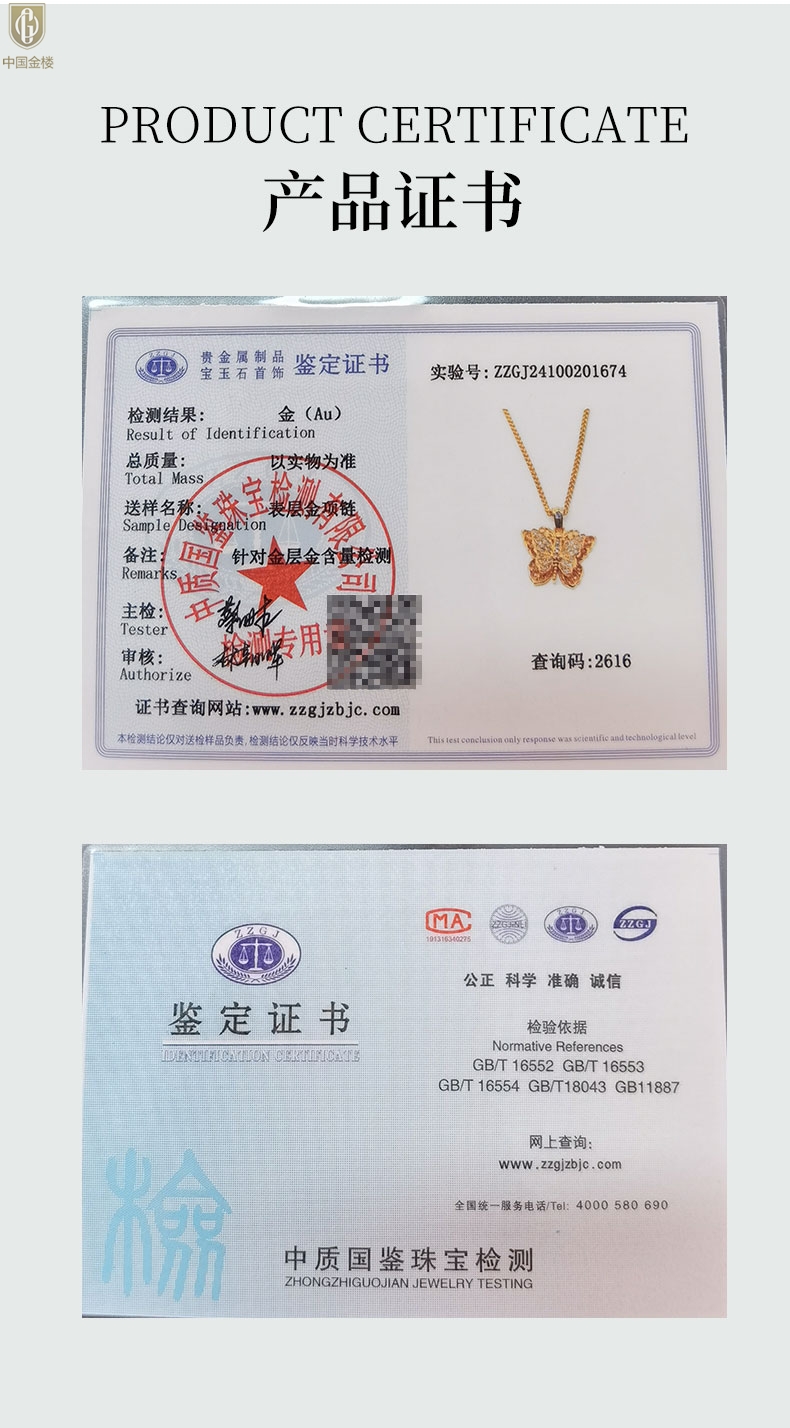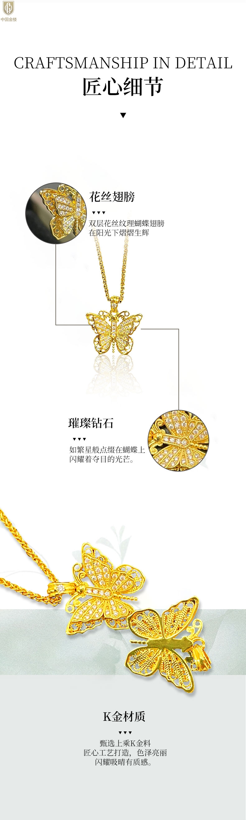 【品名】中国金楼K黄金古法花丝蝴蝶满钻项链