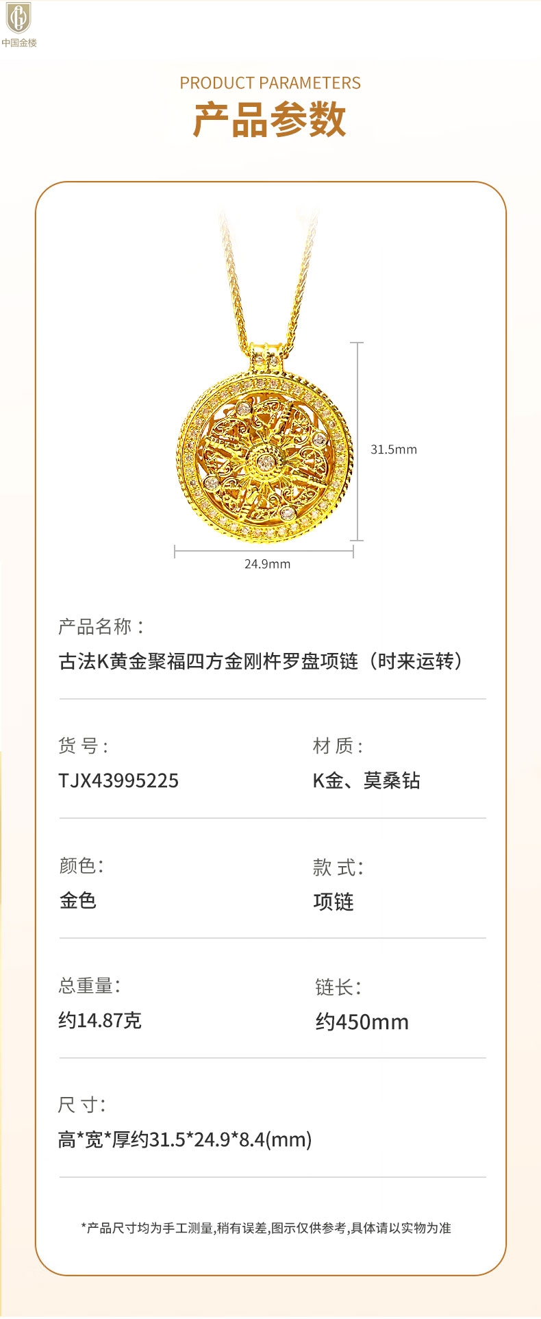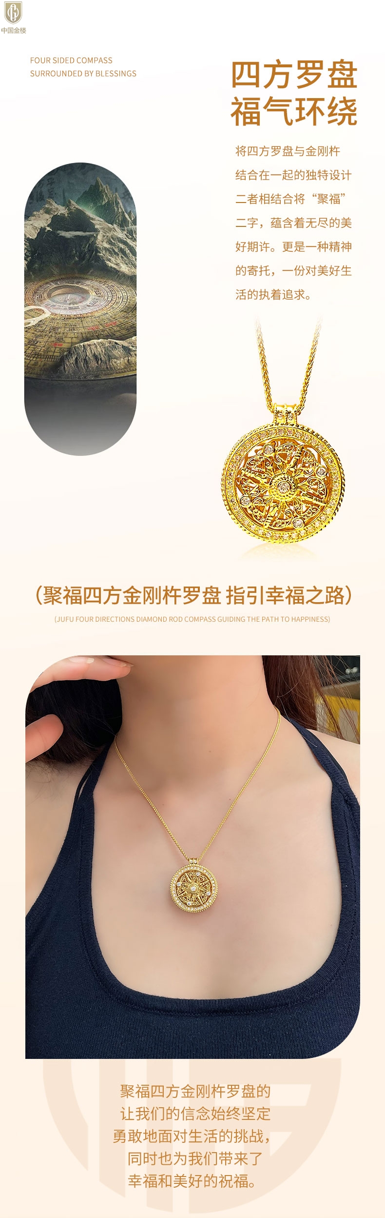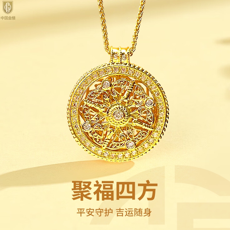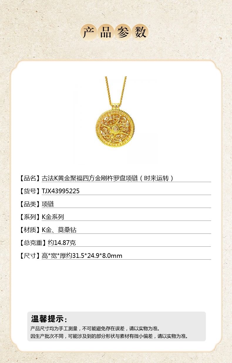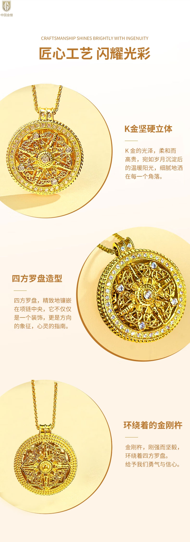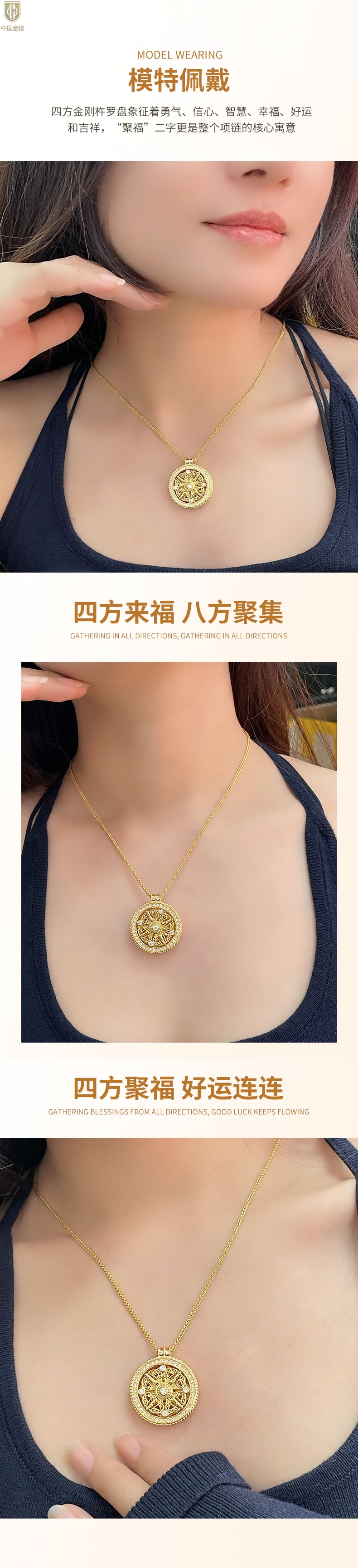 【品名】中国金楼古法K黄金聚福四方金刚杵罗盘项链(时来运转)