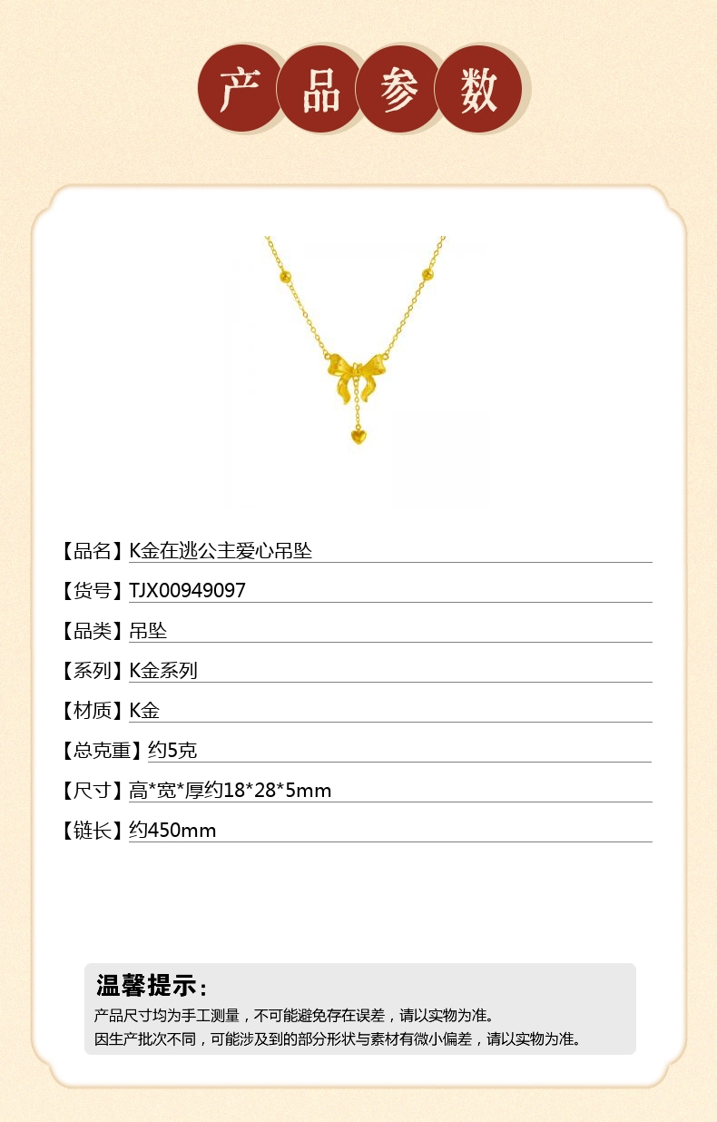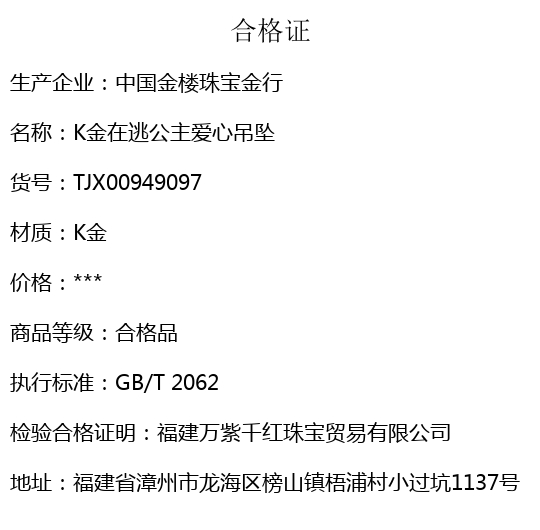 【品名】中国金楼K金在逃公主爱心吊坠