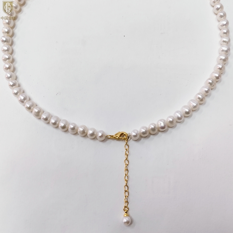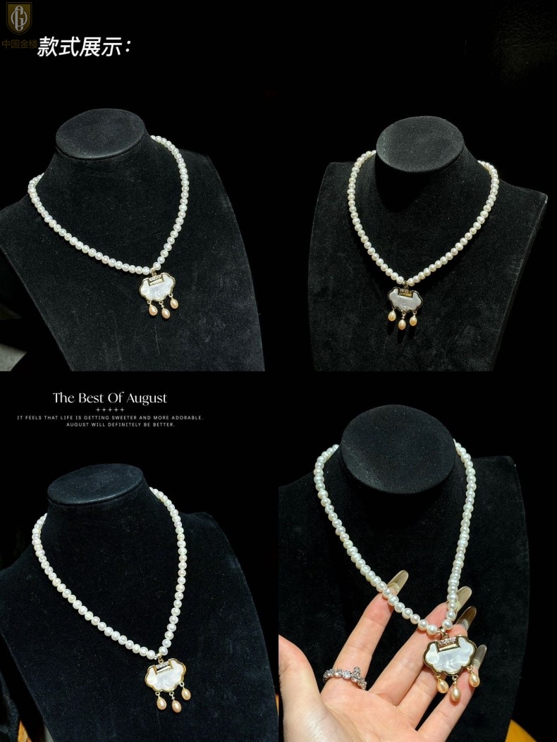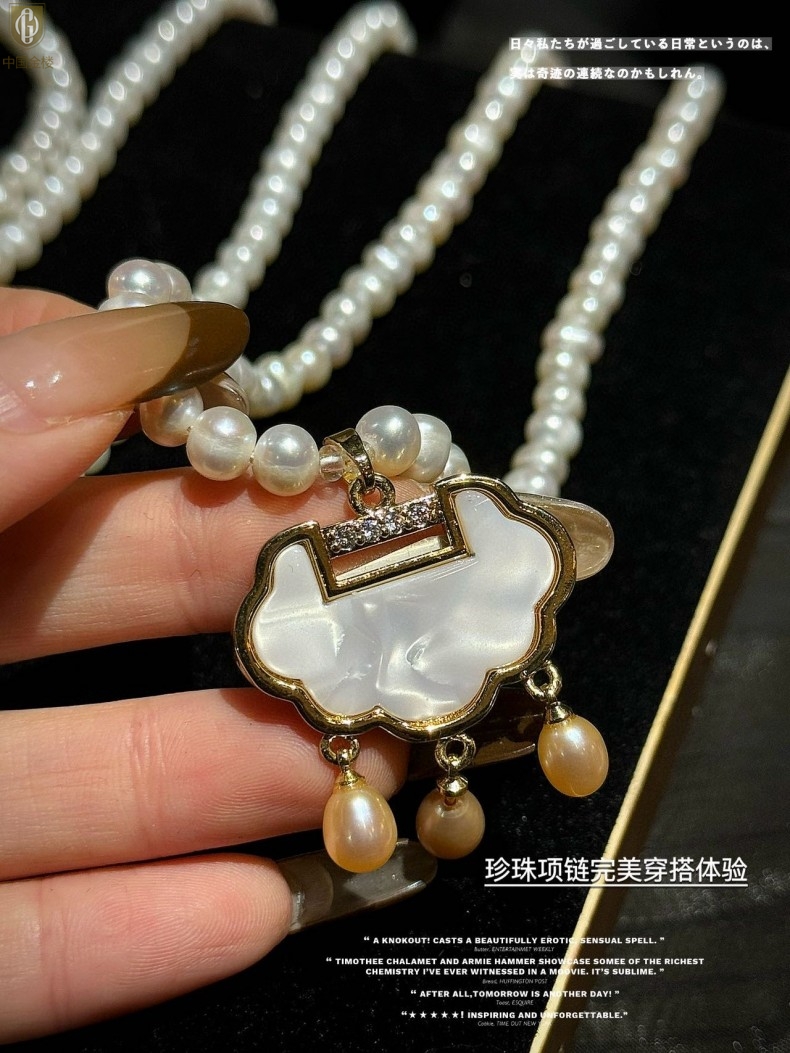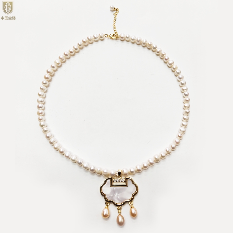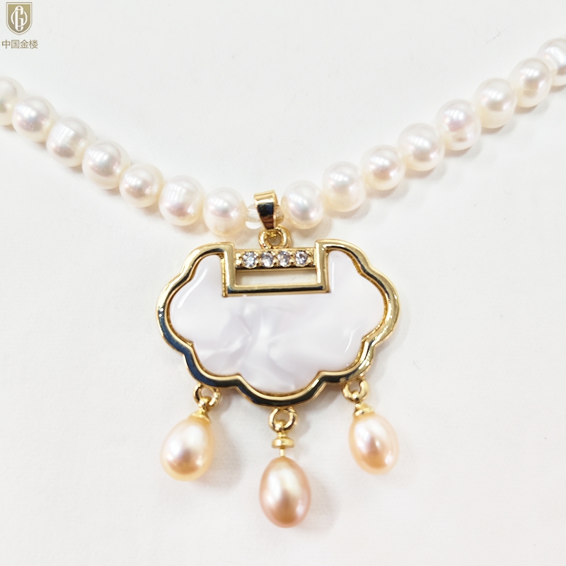 【品名】中国金楼白贝母平安锁天然珍珠项链