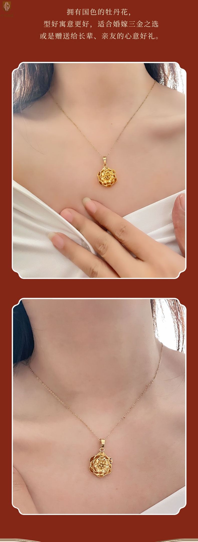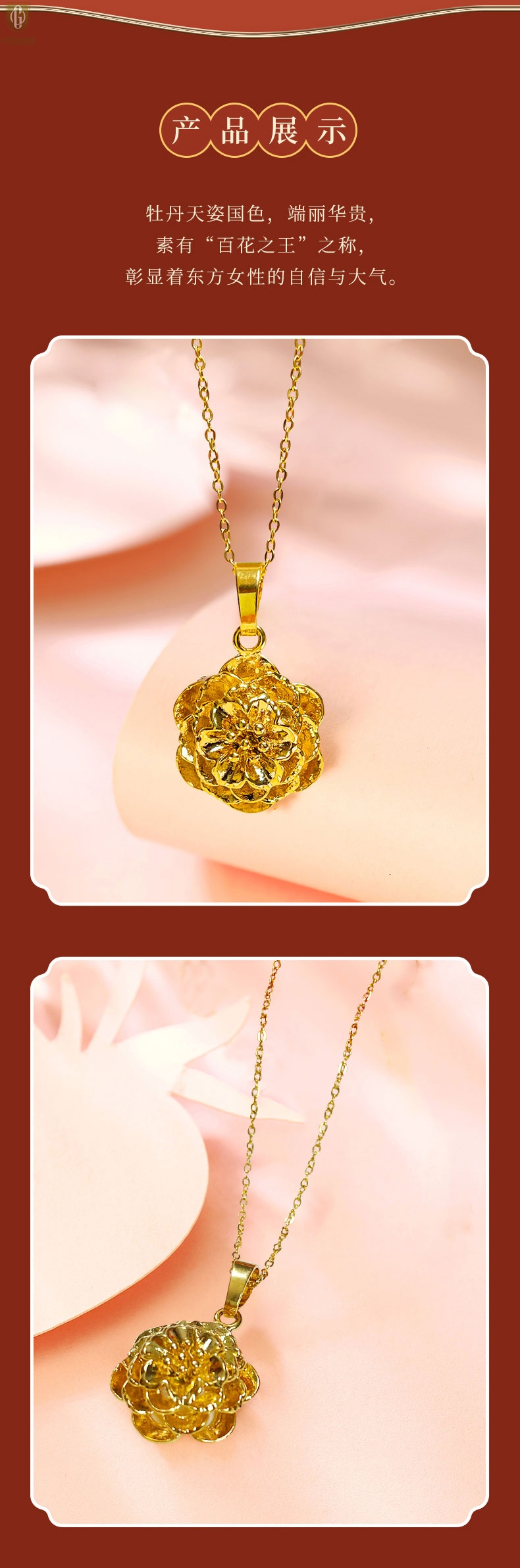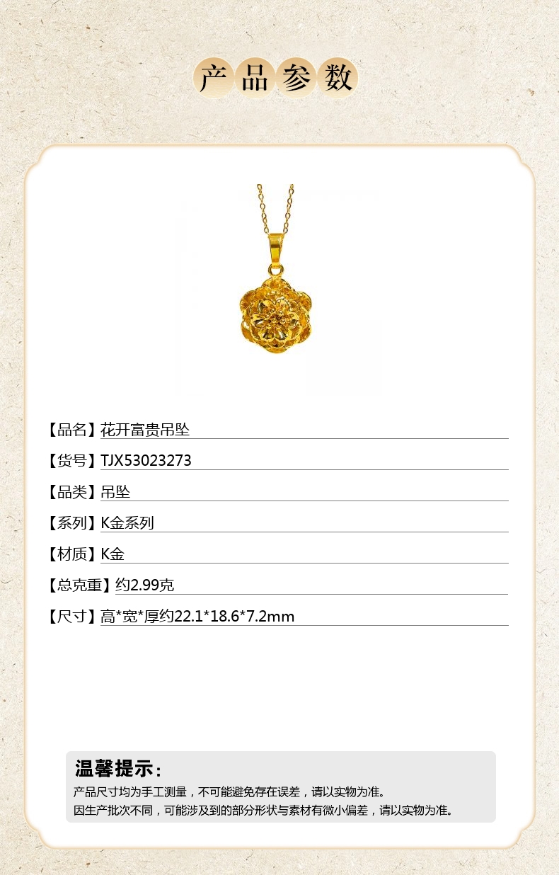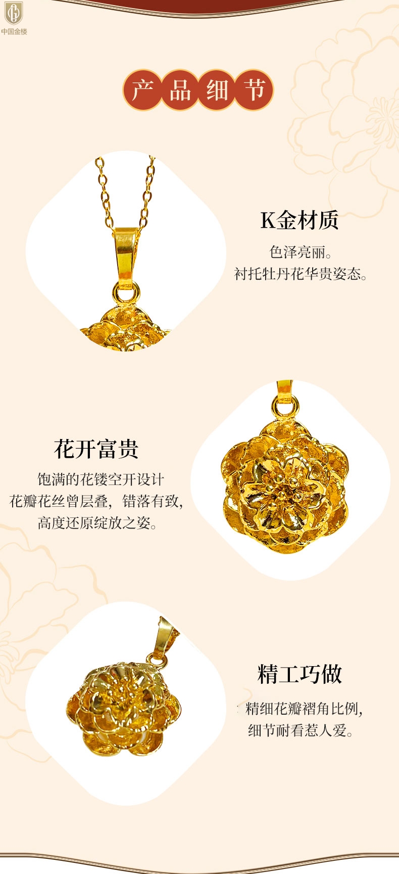 【品名】中国金楼花开富贵吊坠