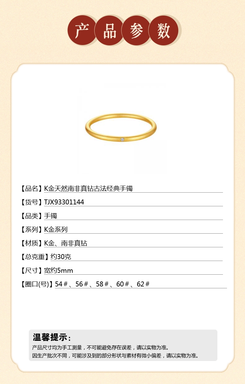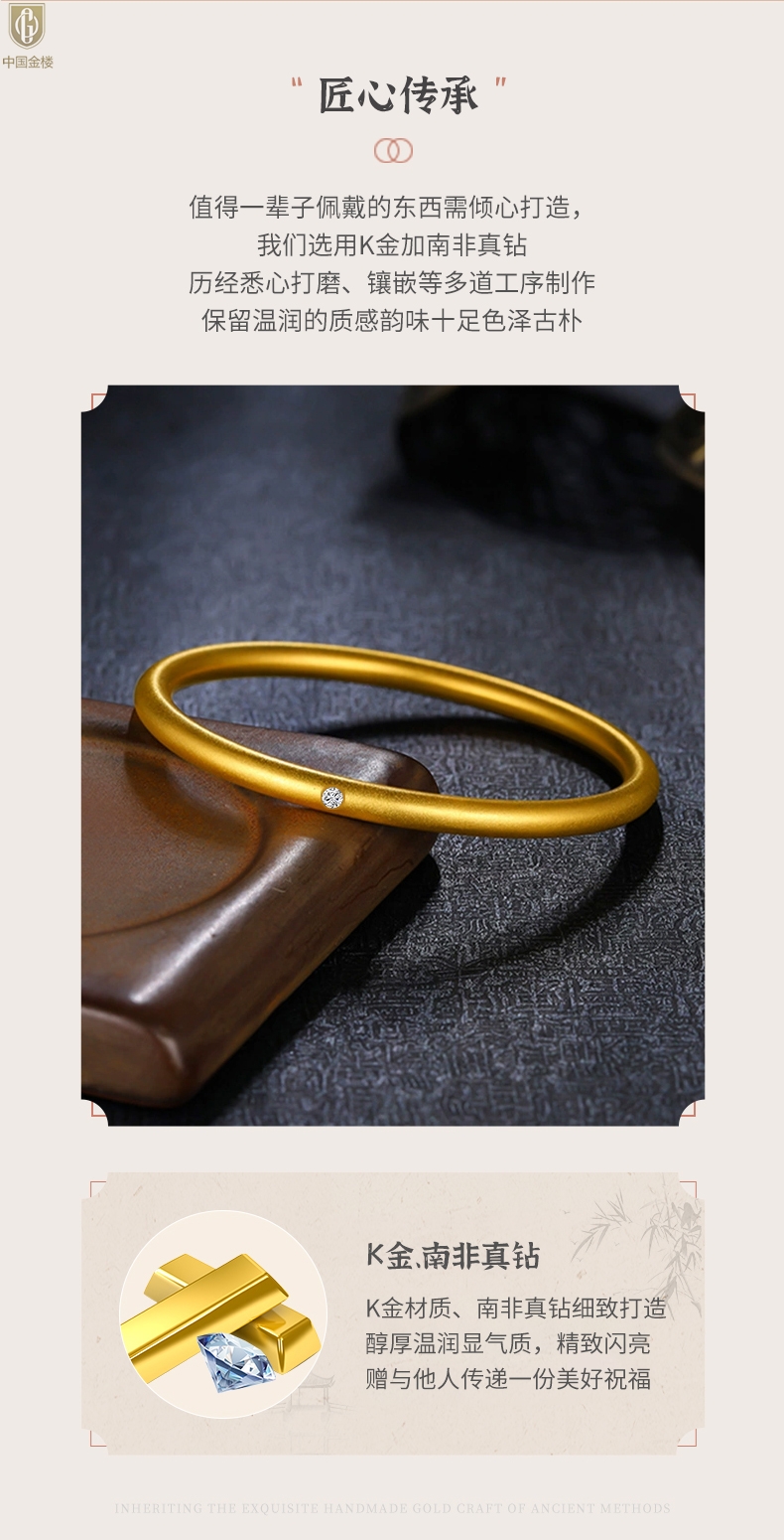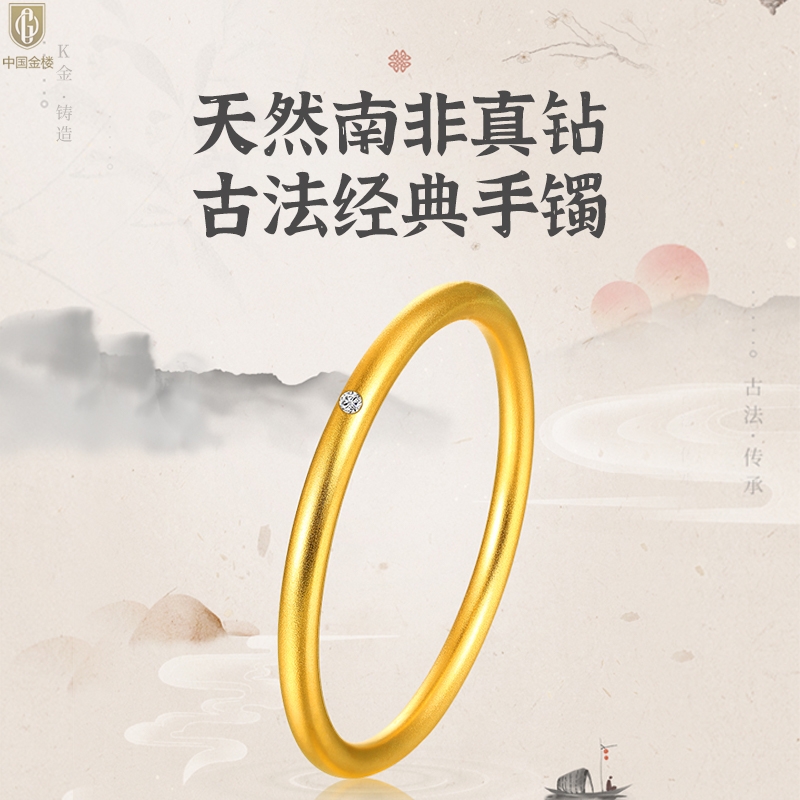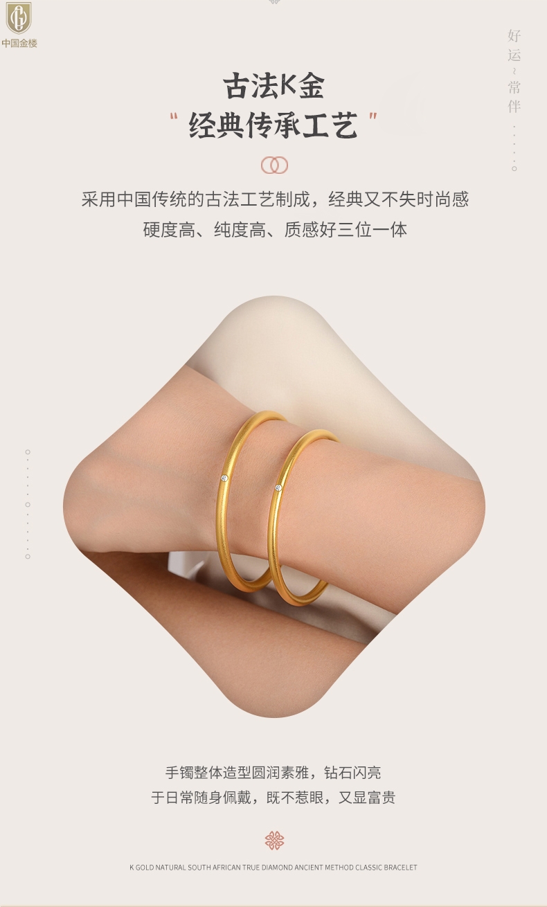 【品名】中国金楼K金天然南非真钻古法经典手镯