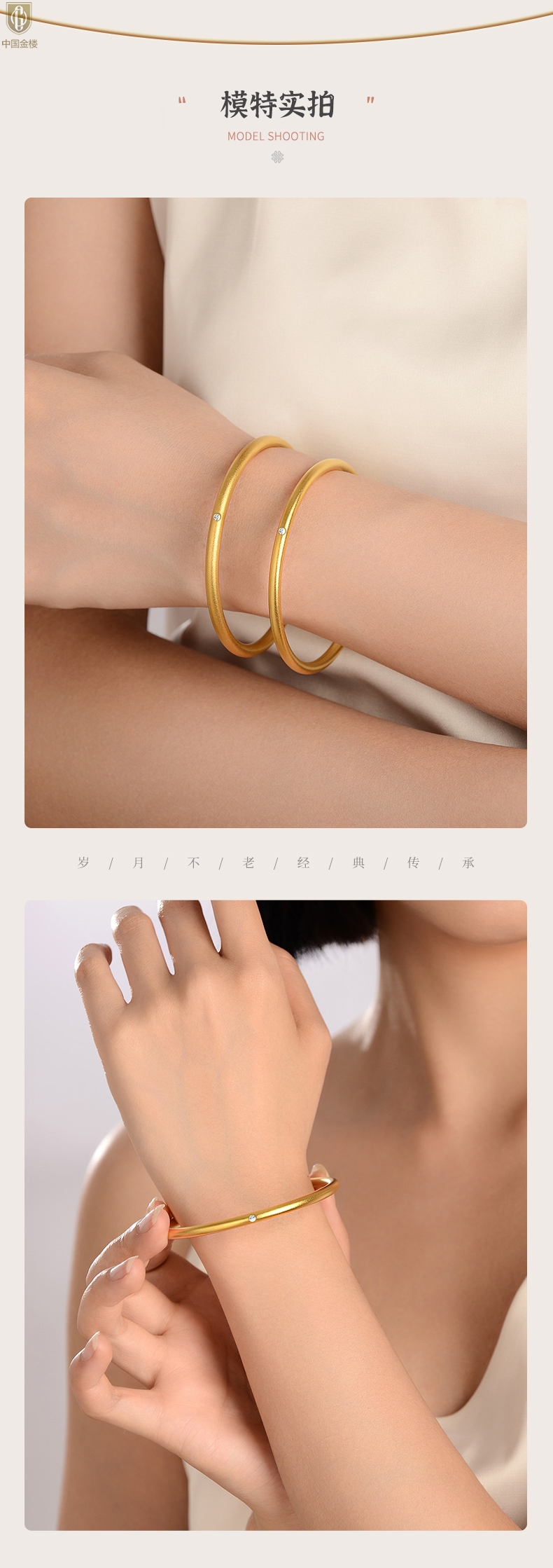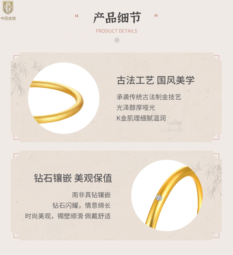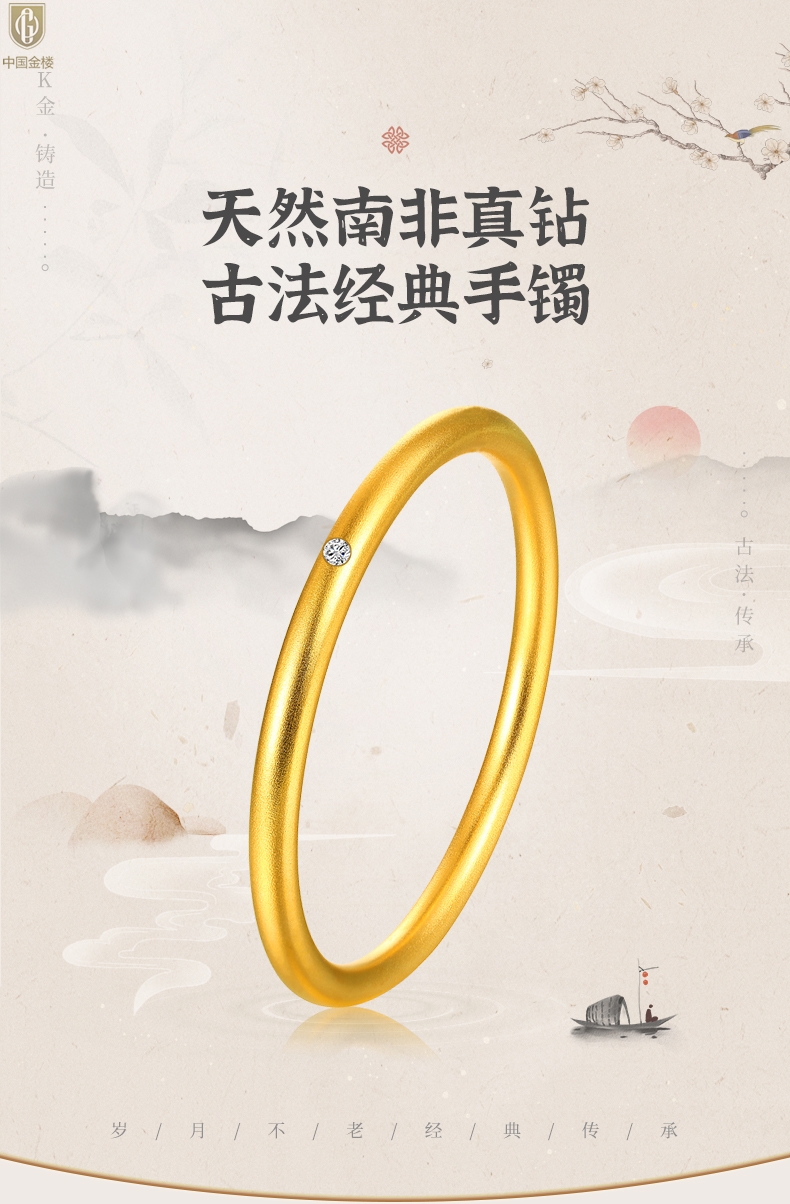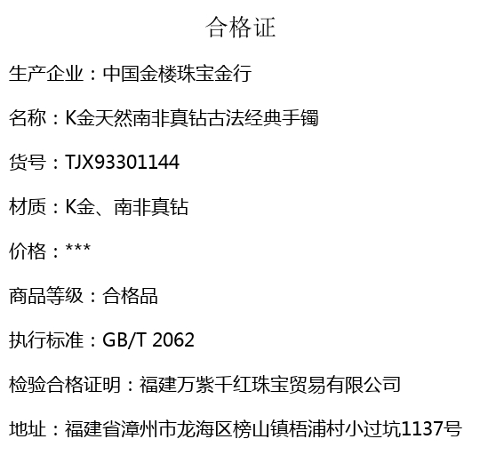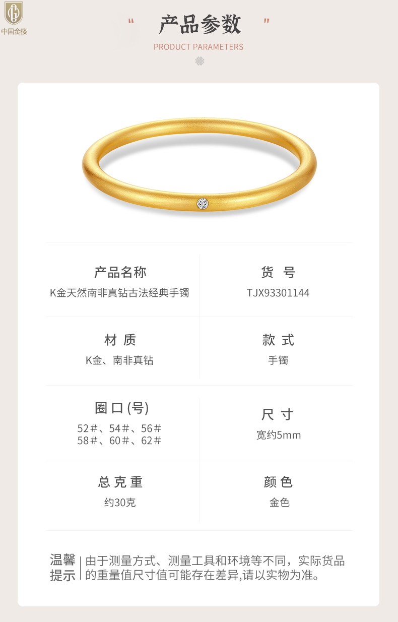 【品名】中国金楼K金天然南非真钻古法经典手镯