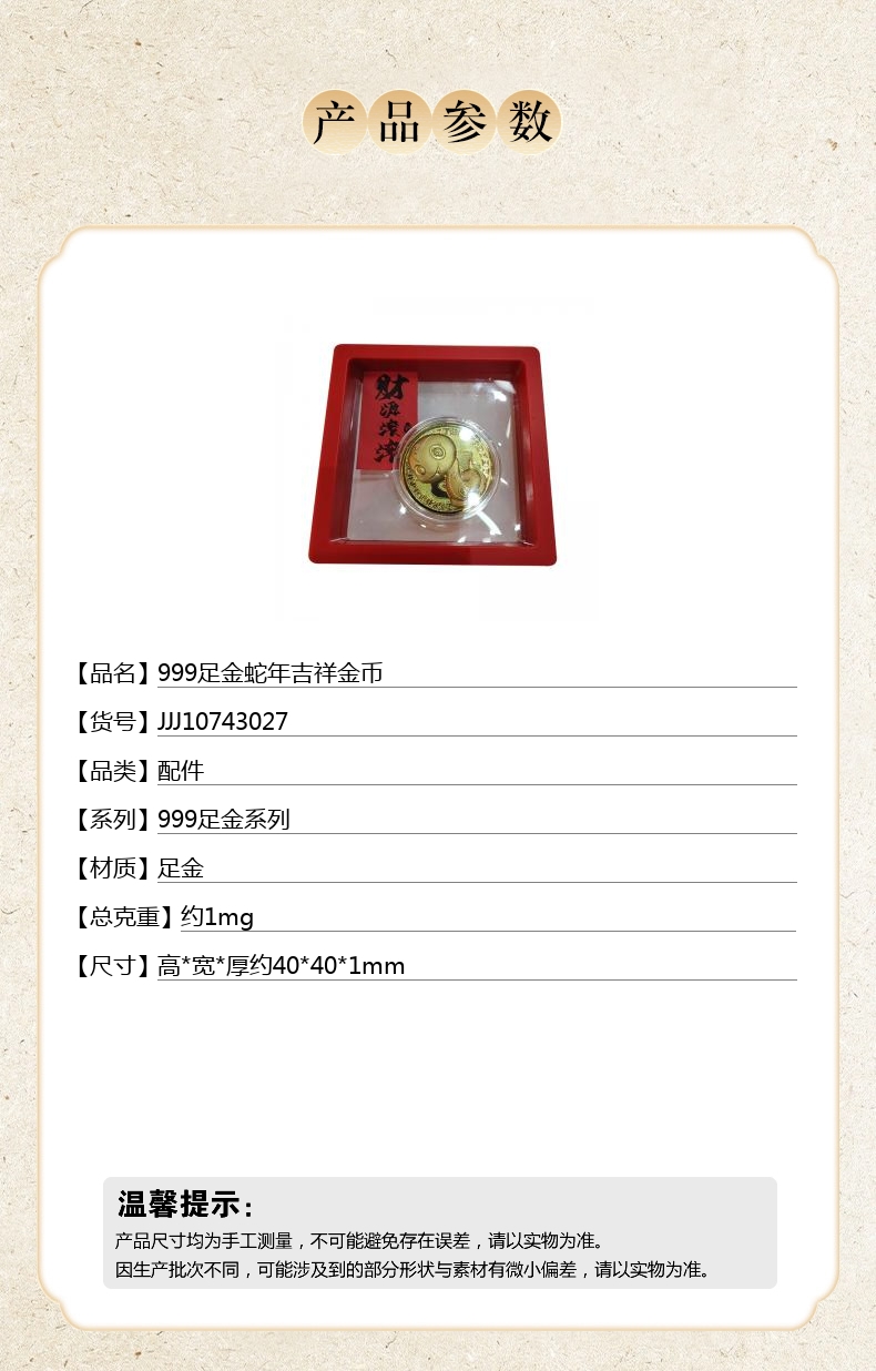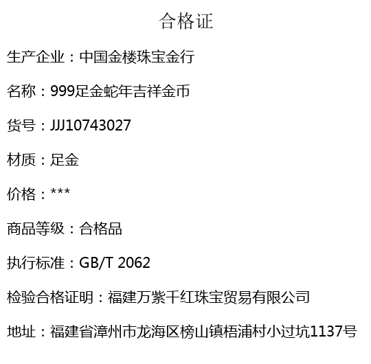 【品名】中国金楼999足金蛇年吉祥金币