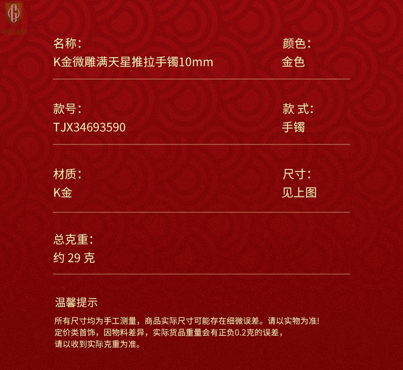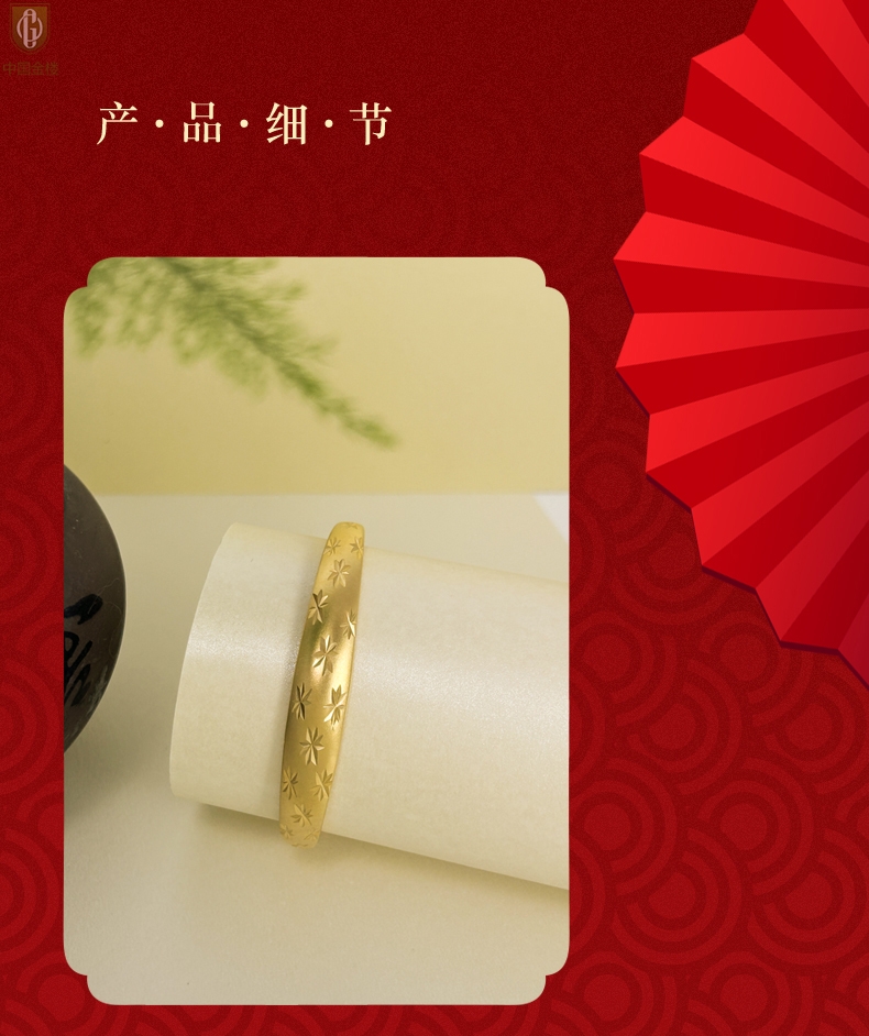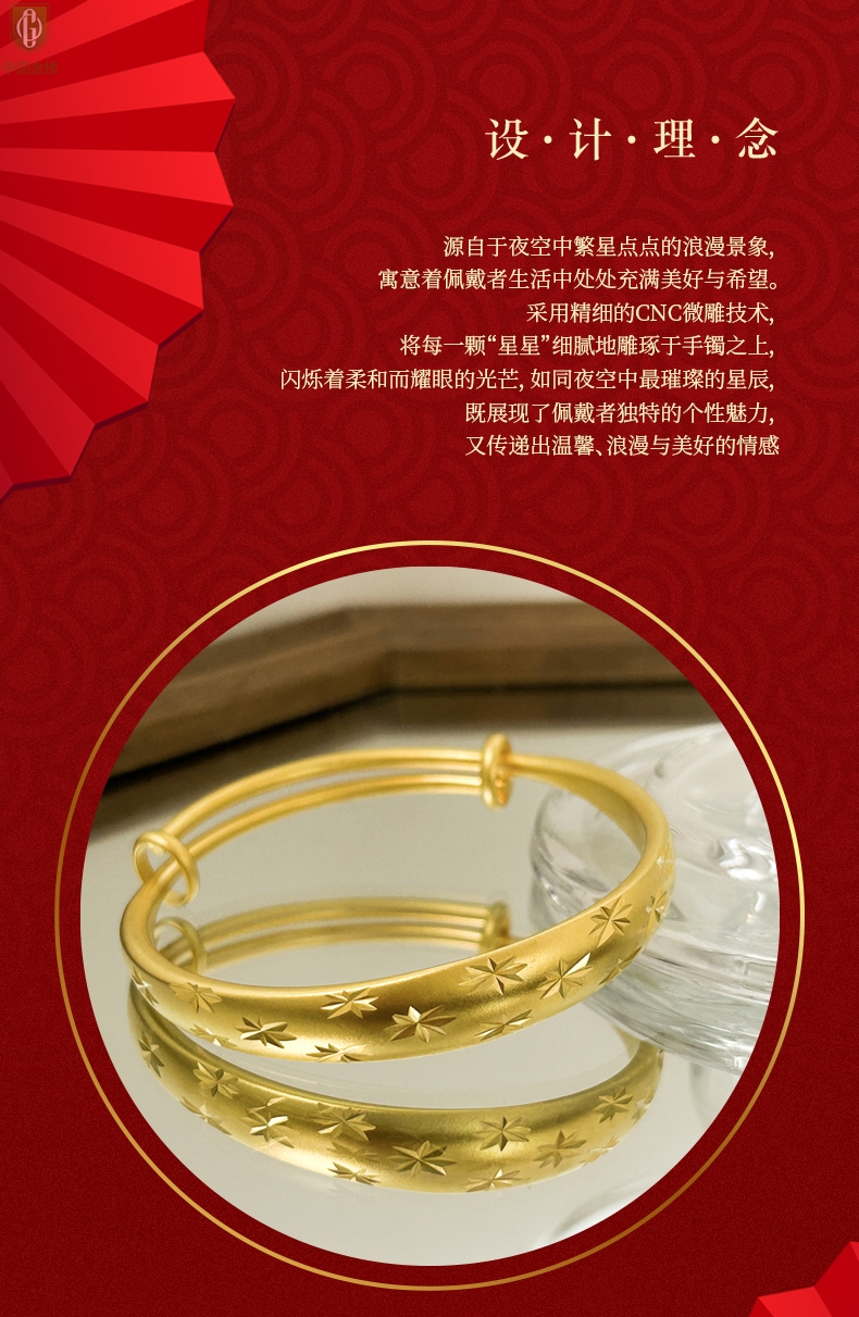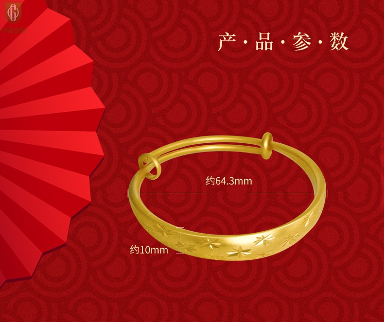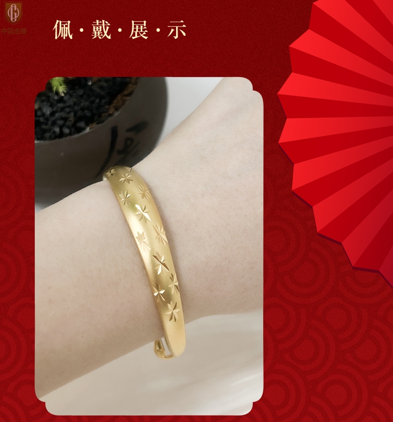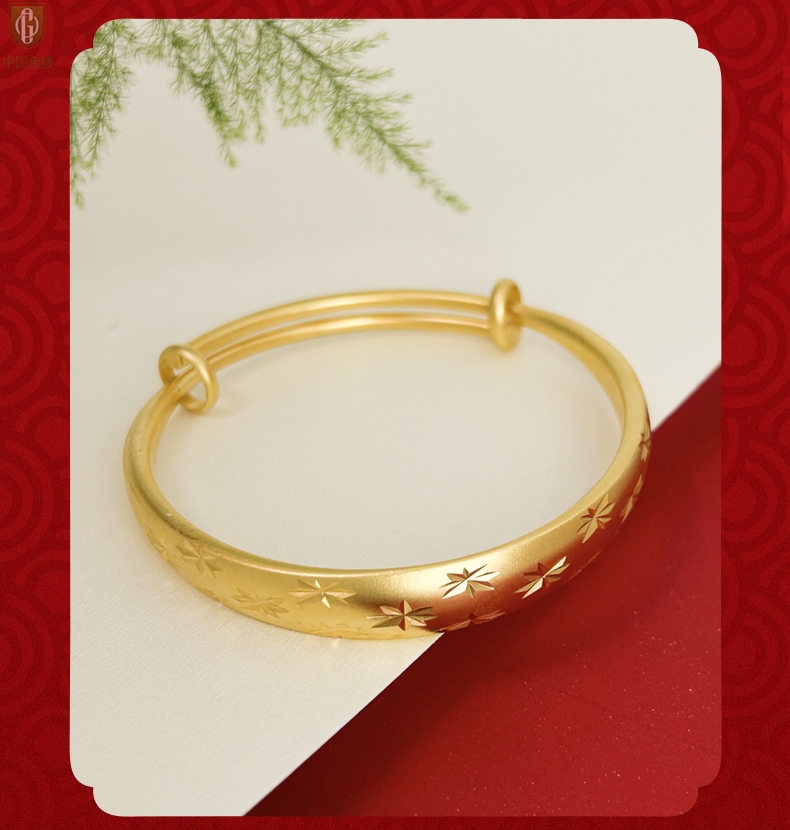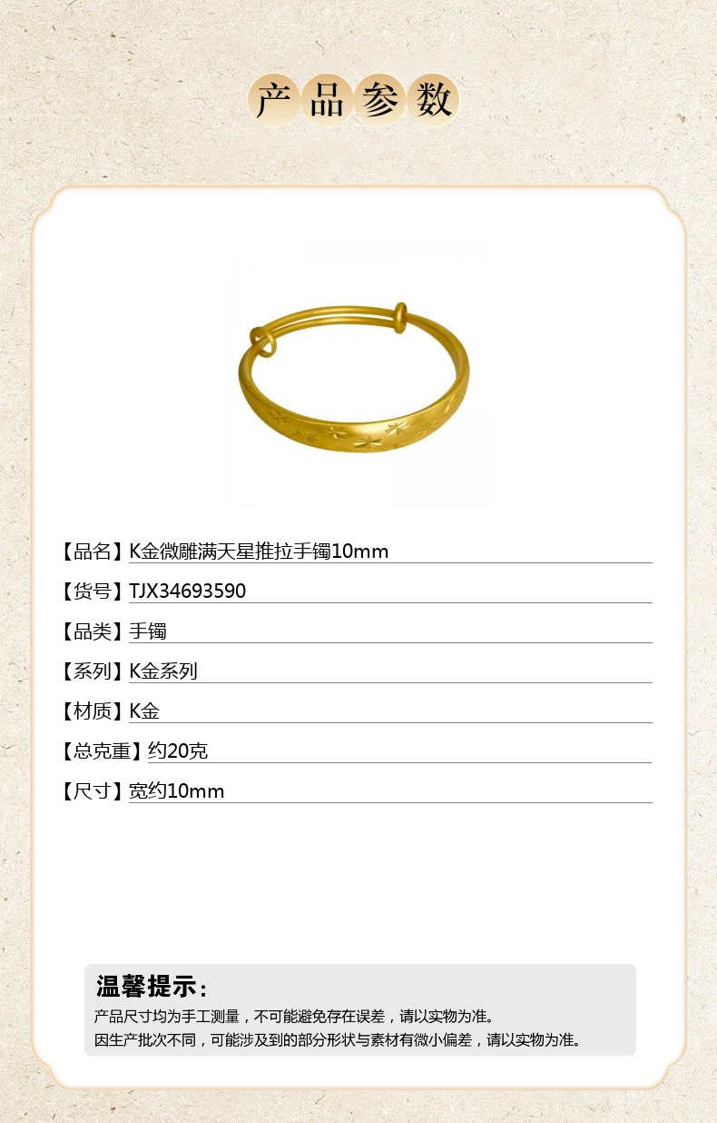 【品名】中国金楼K金微雕满天星推拉手镯10mm