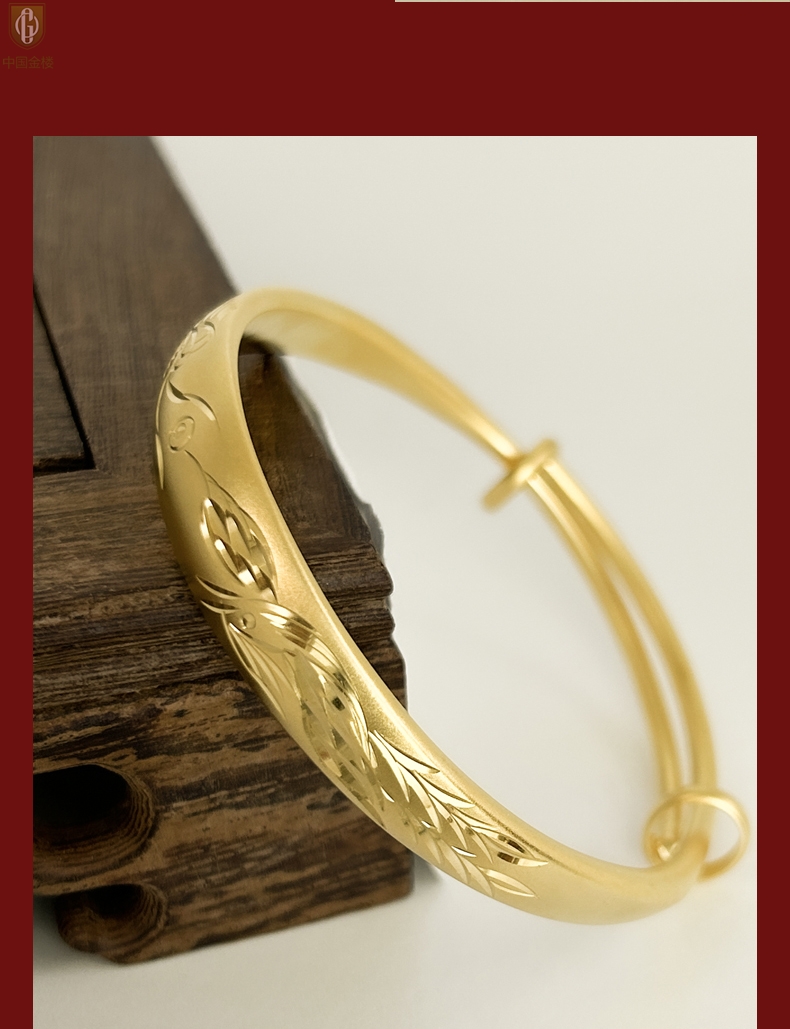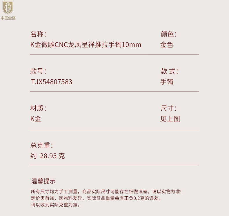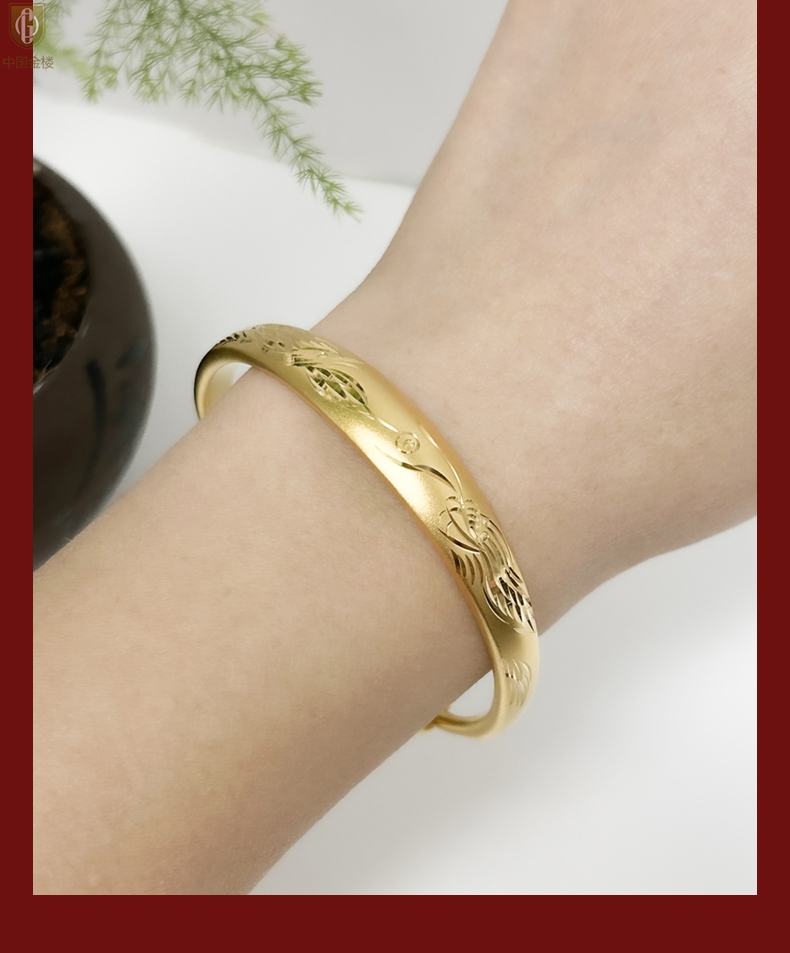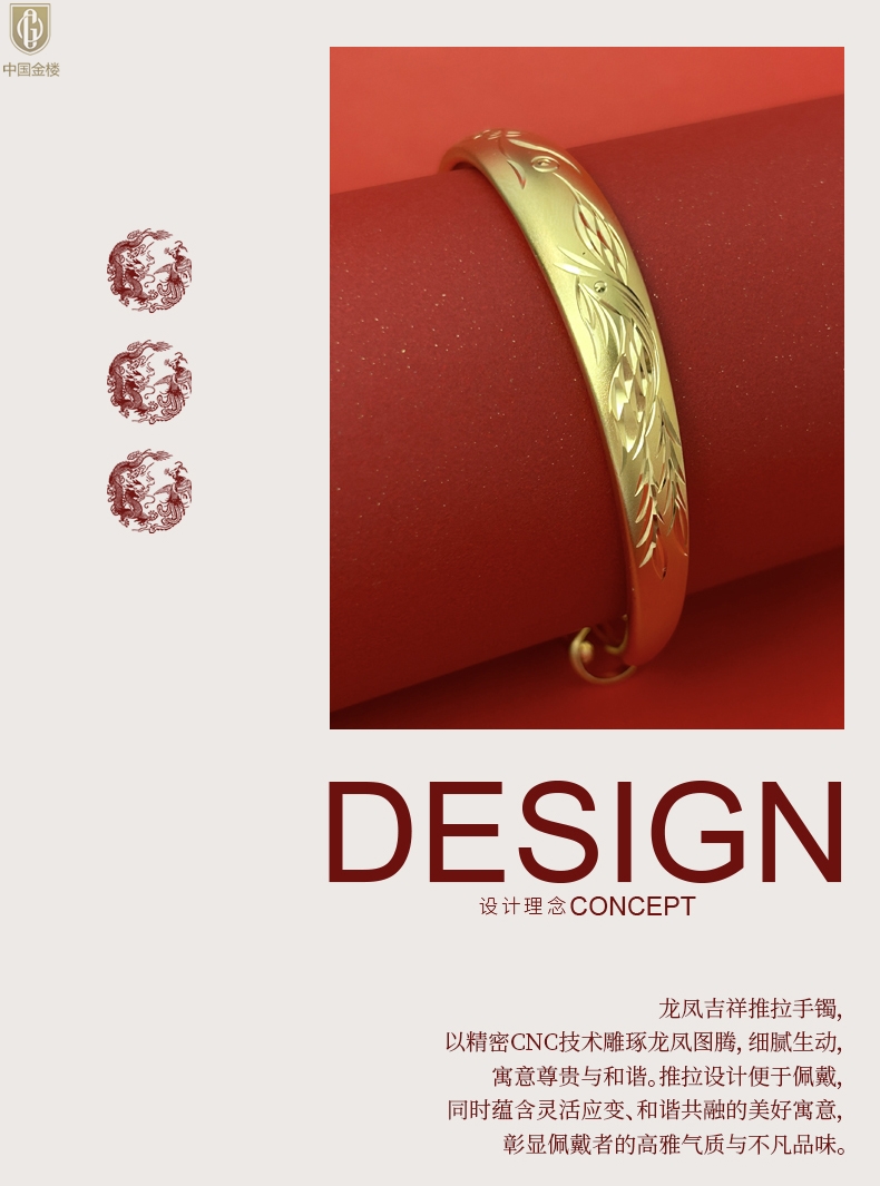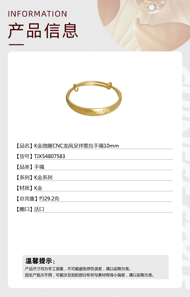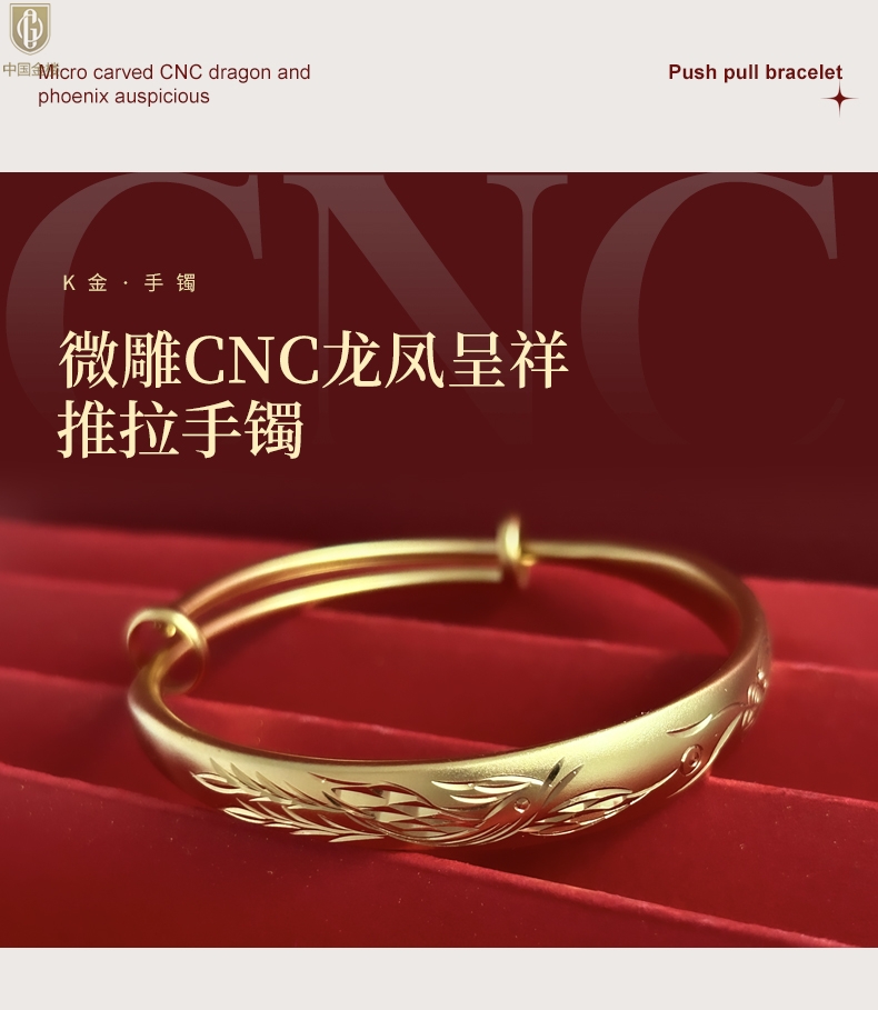 【品名】中国金楼K金微雕CNC龙凤呈祥推拉手镯10mm