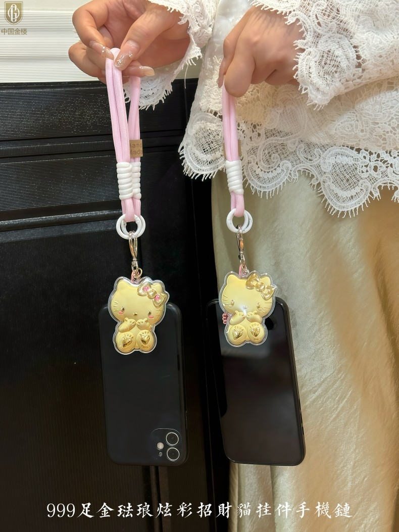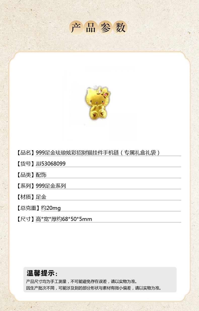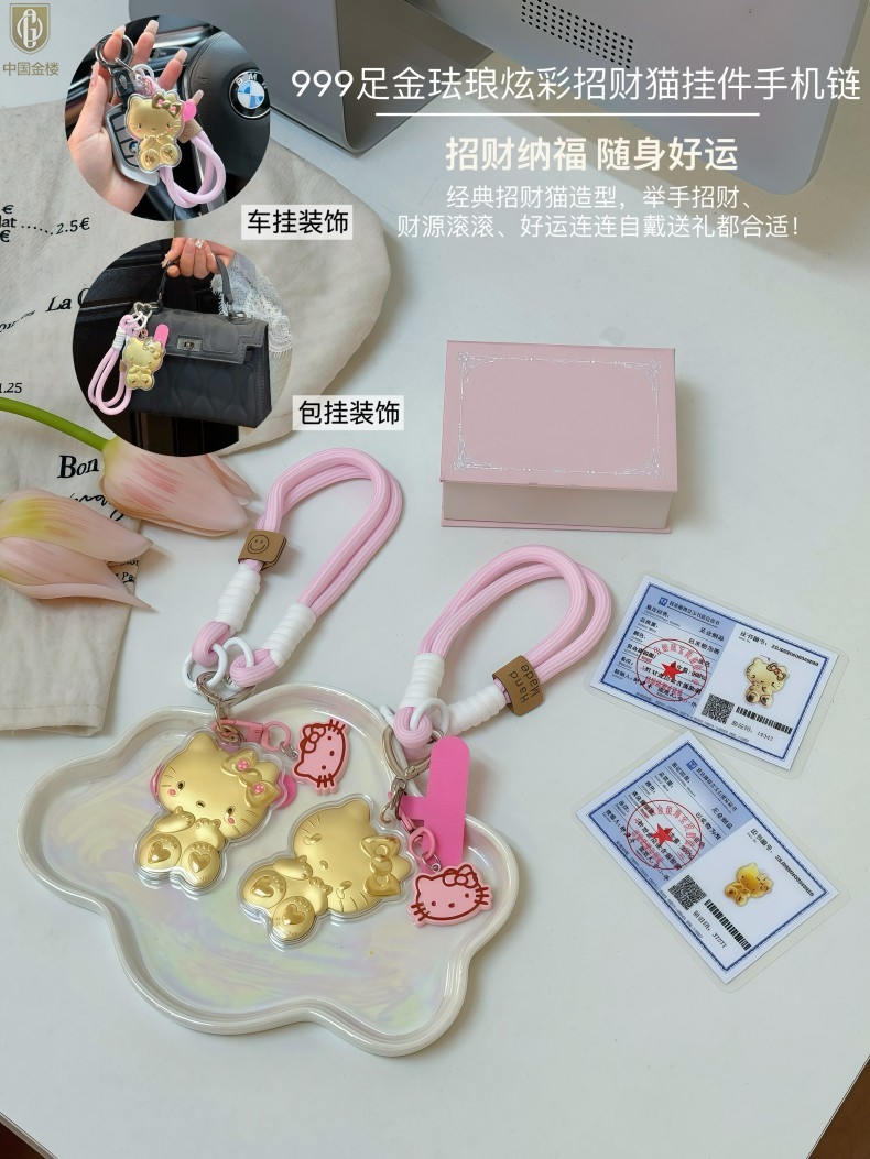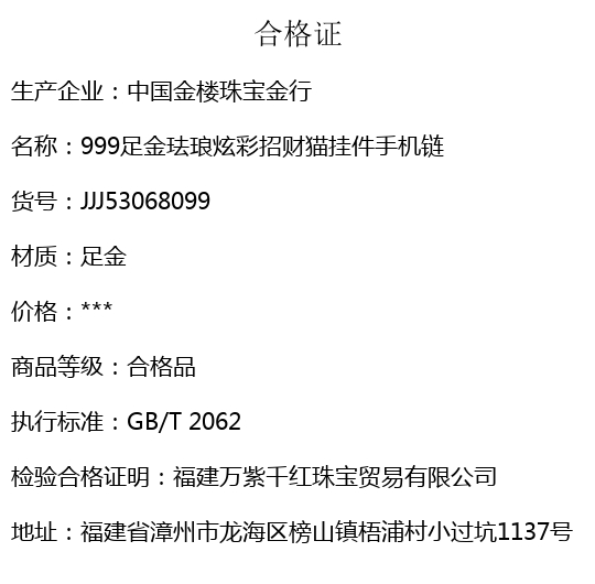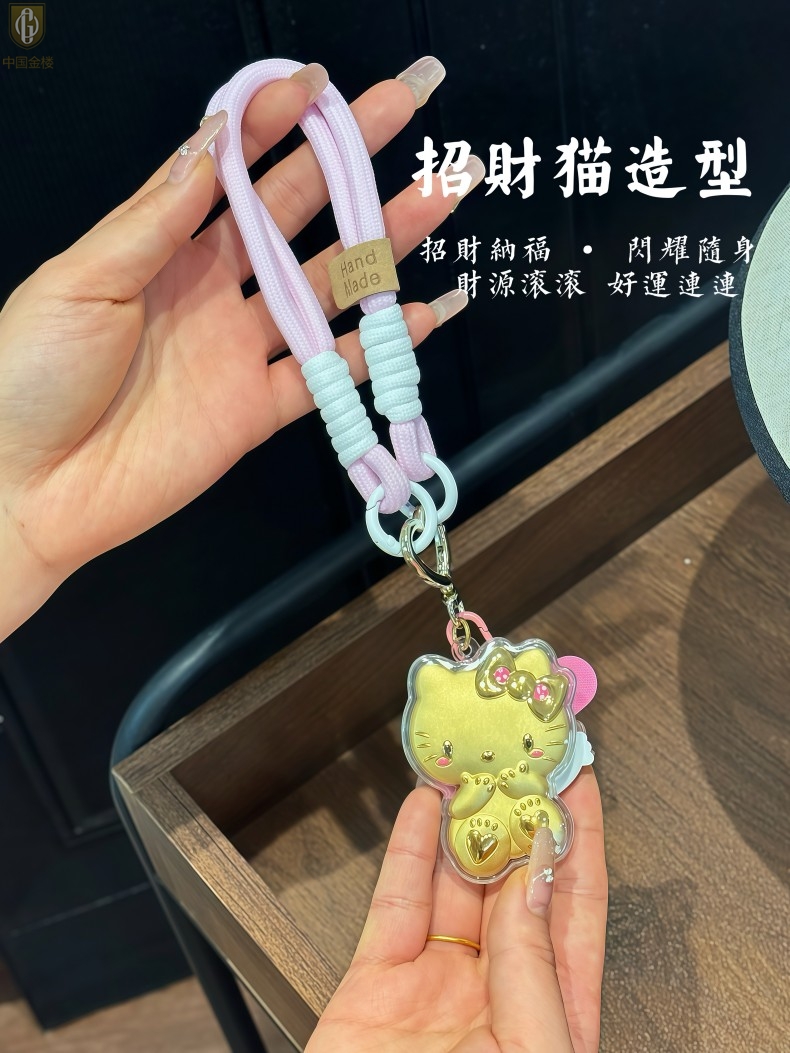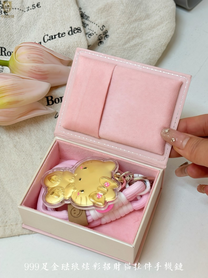 【品名】中国金楼999足金珐琅炫彩招财猫挂件手机链(专属礼盒礼袋)