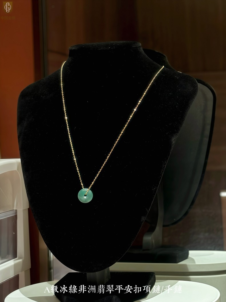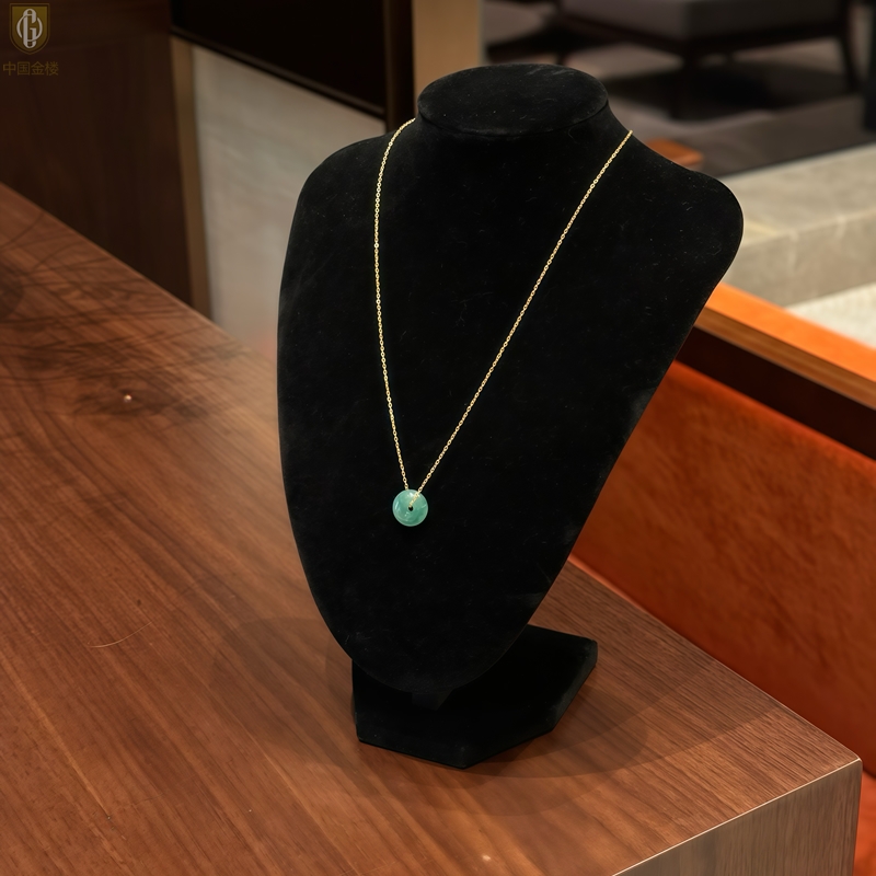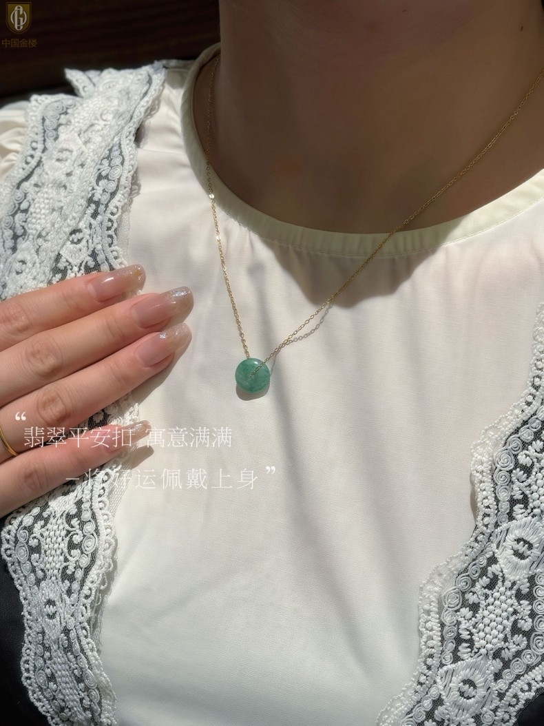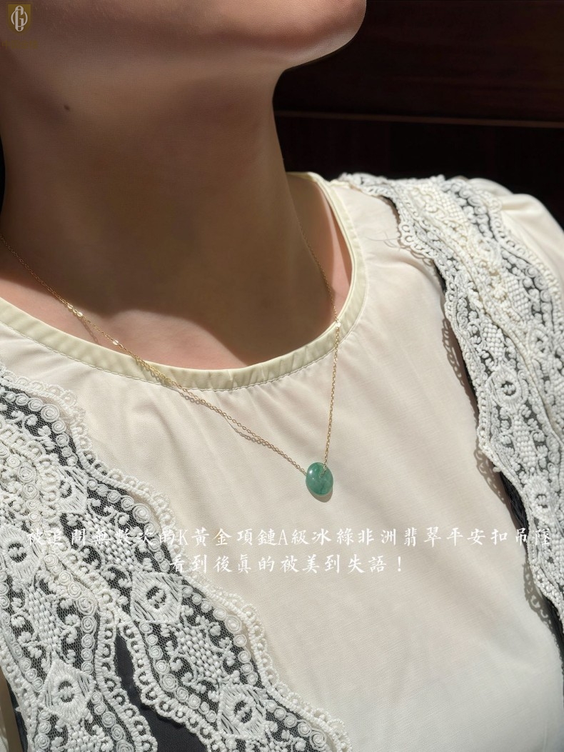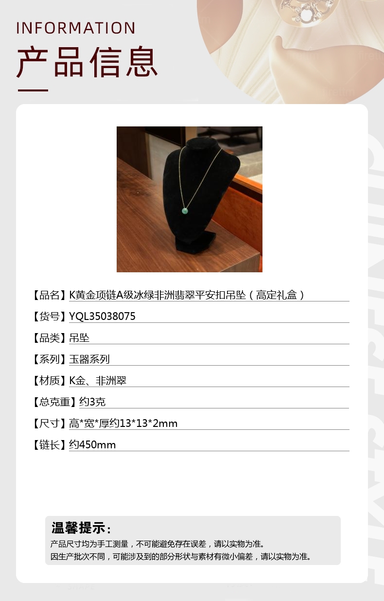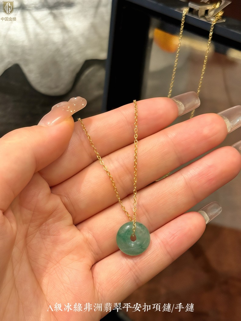 【品名】中国金楼K黄金项链A级冰绿非洲翡翠平安扣吊坠(高定礼盒)