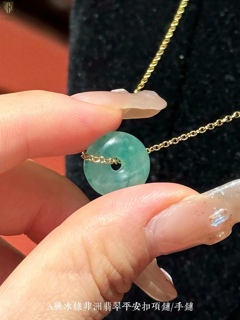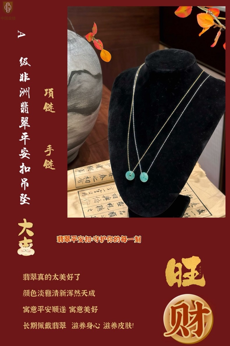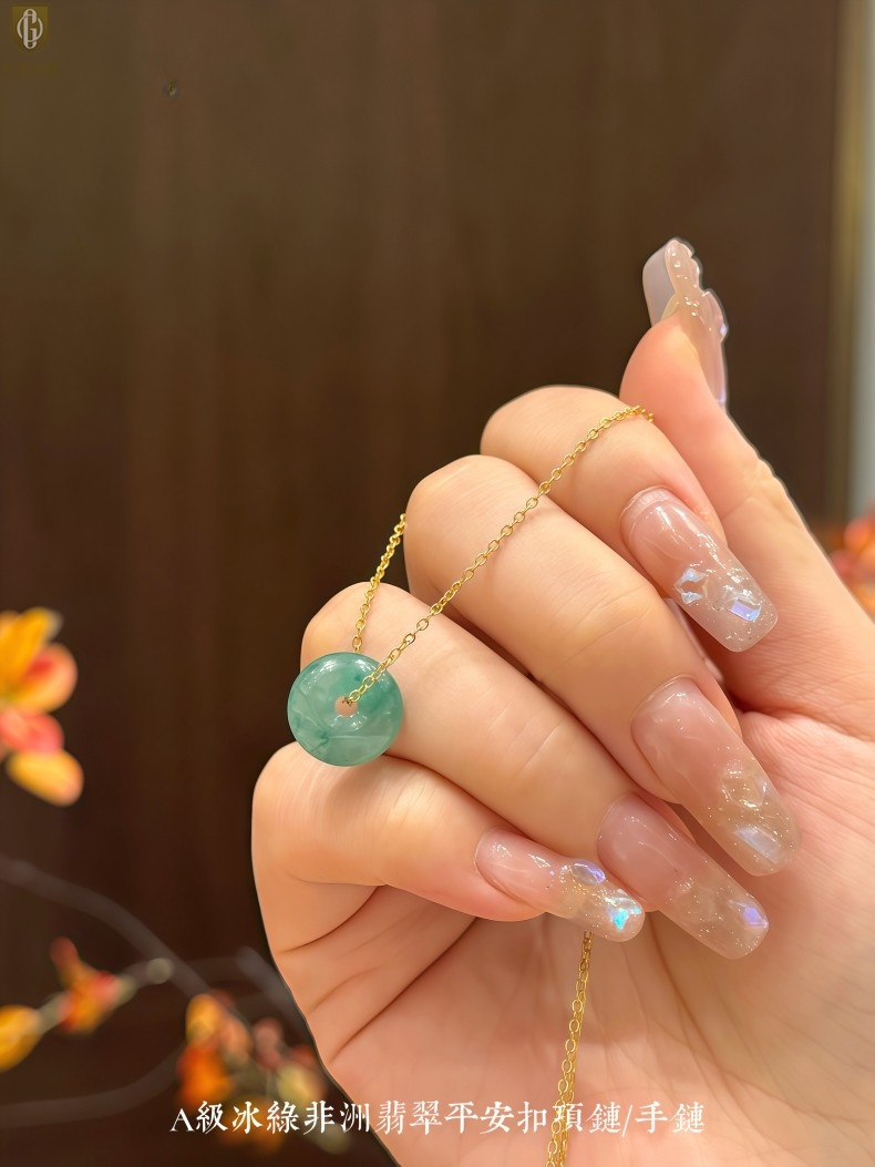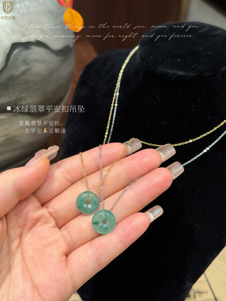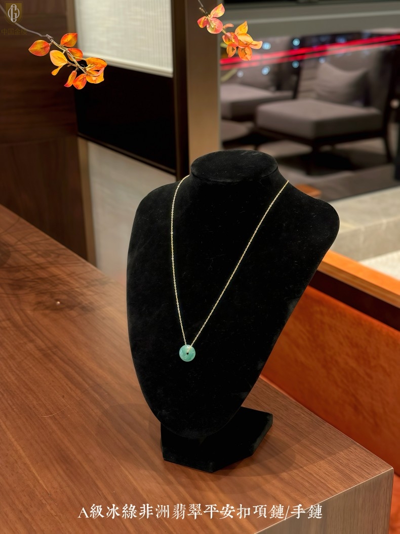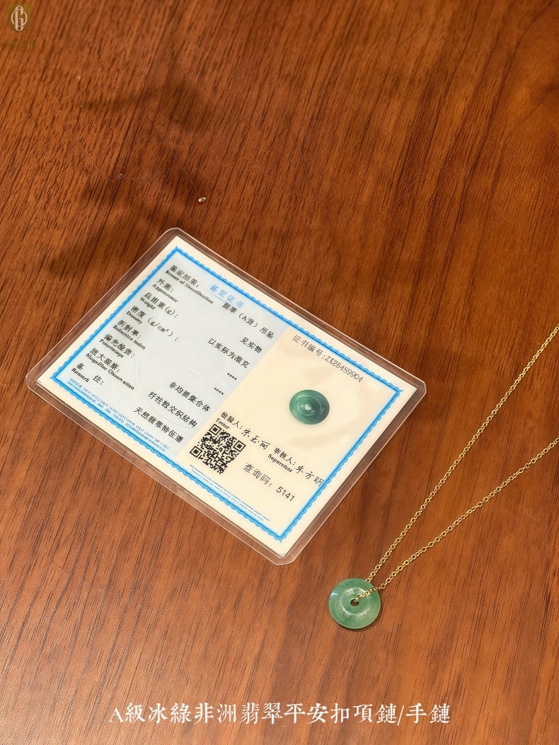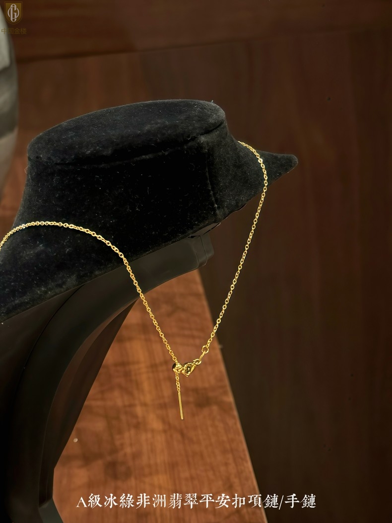 【品名】中国金楼K黄金项链A级冰绿非洲翡翠平安扣吊坠(高定礼盒)
