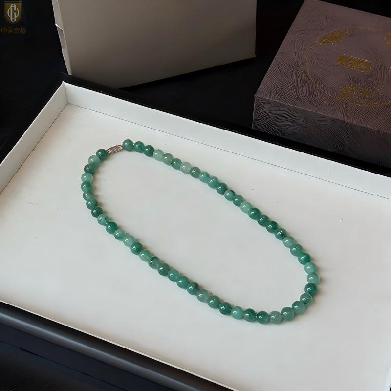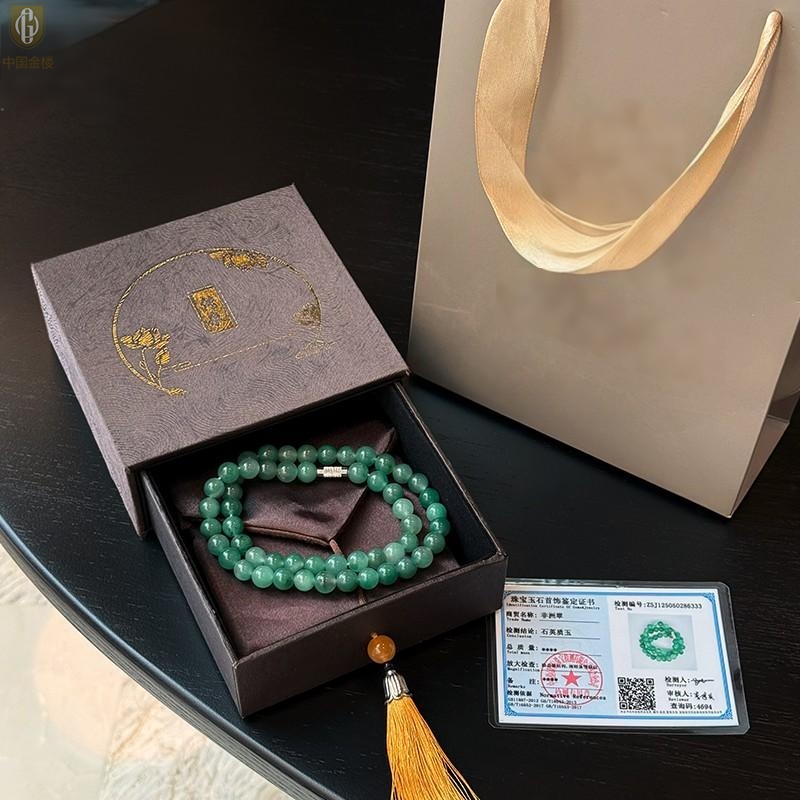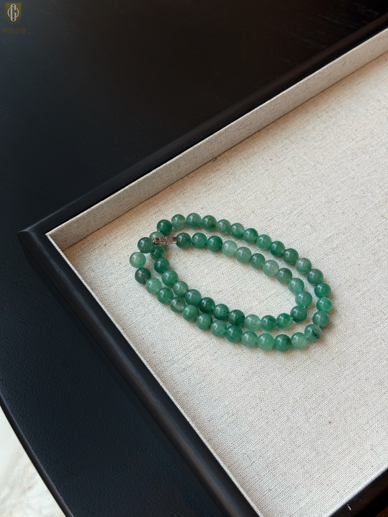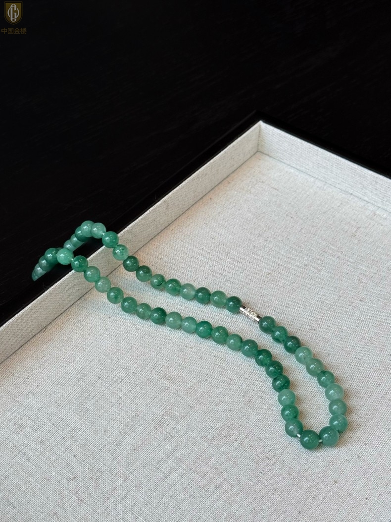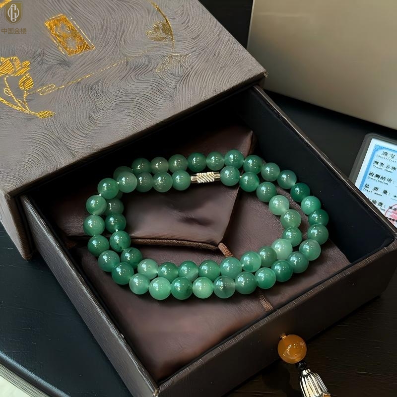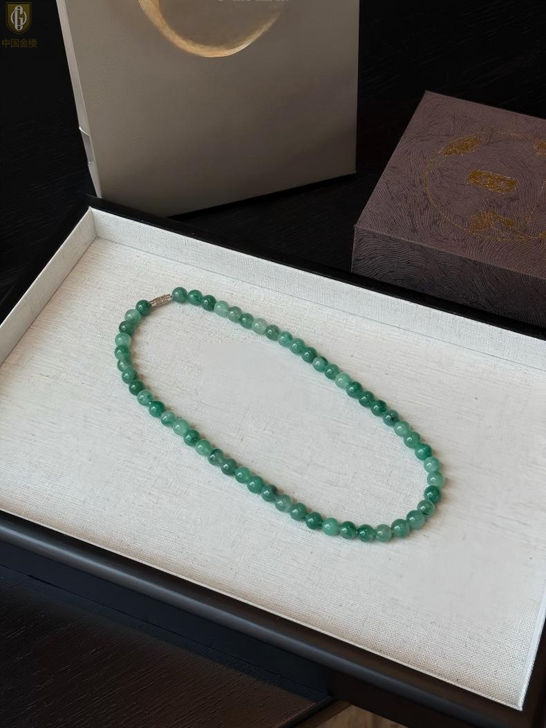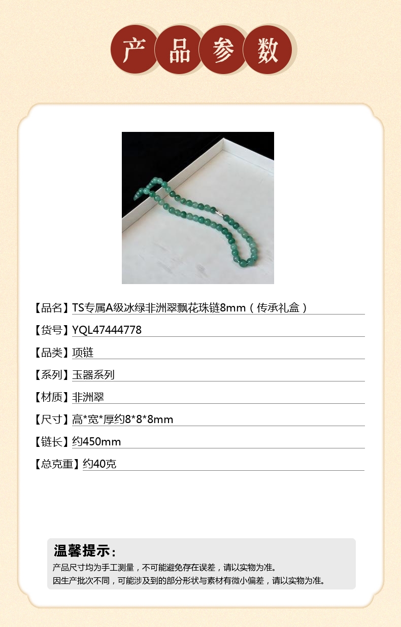 【品名】中国金楼TS专属A级冰绿非洲翠飘花珠链8mm(传承礼盒)