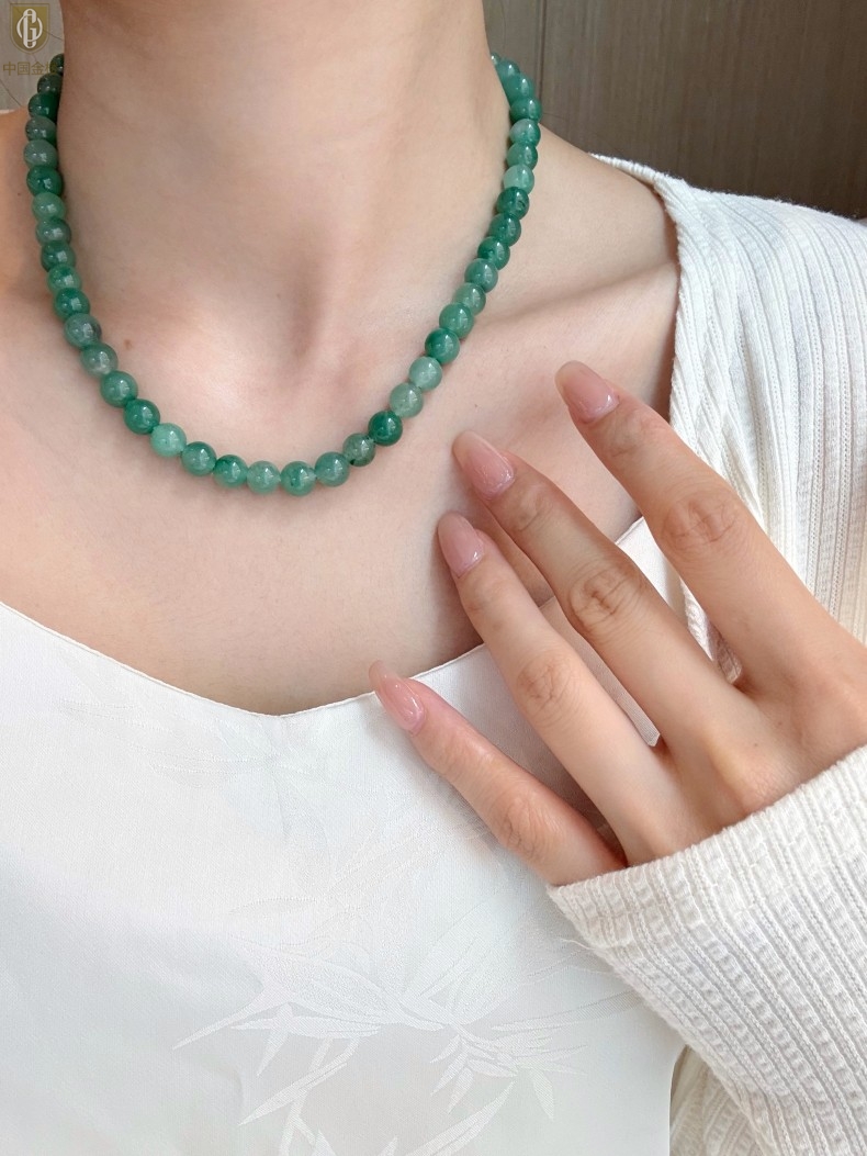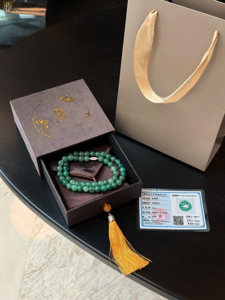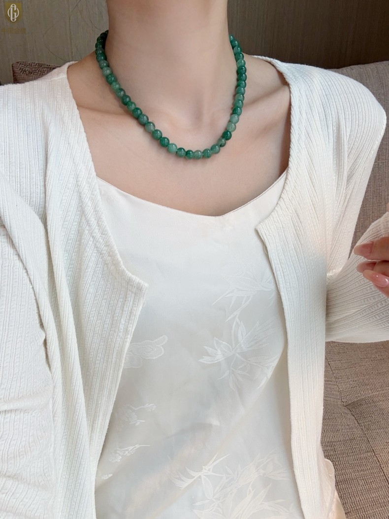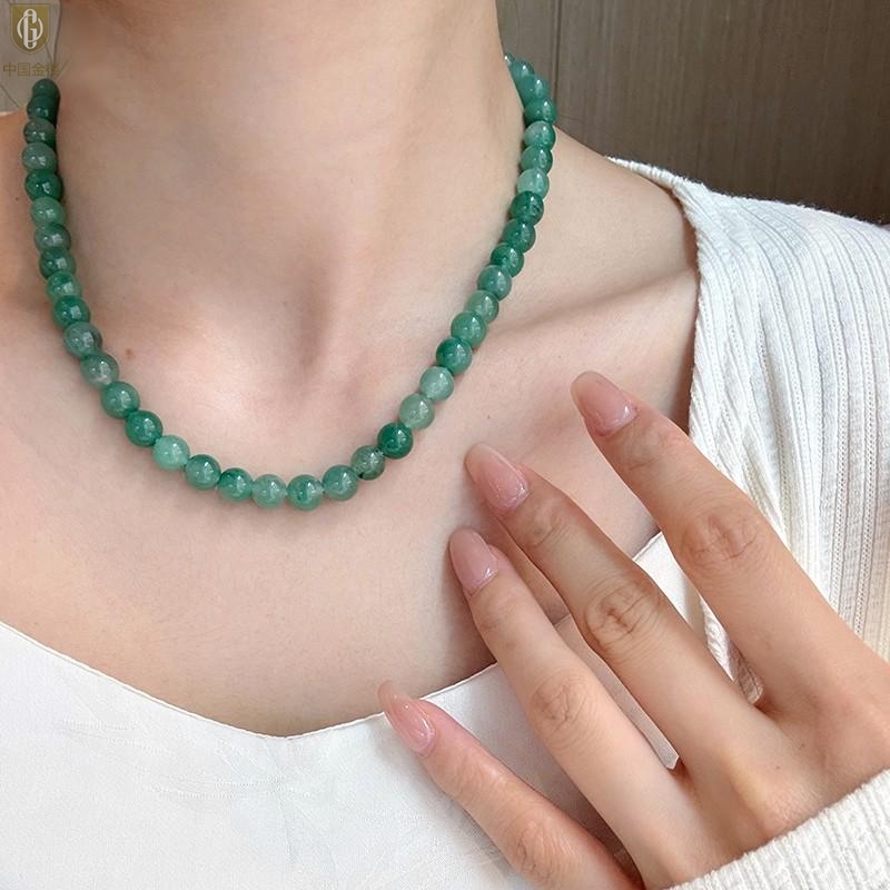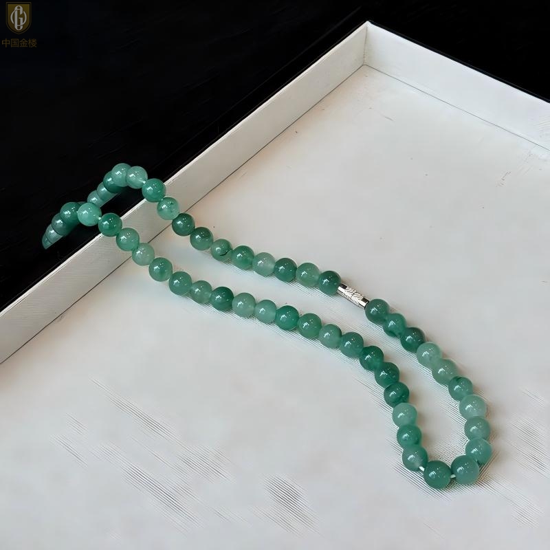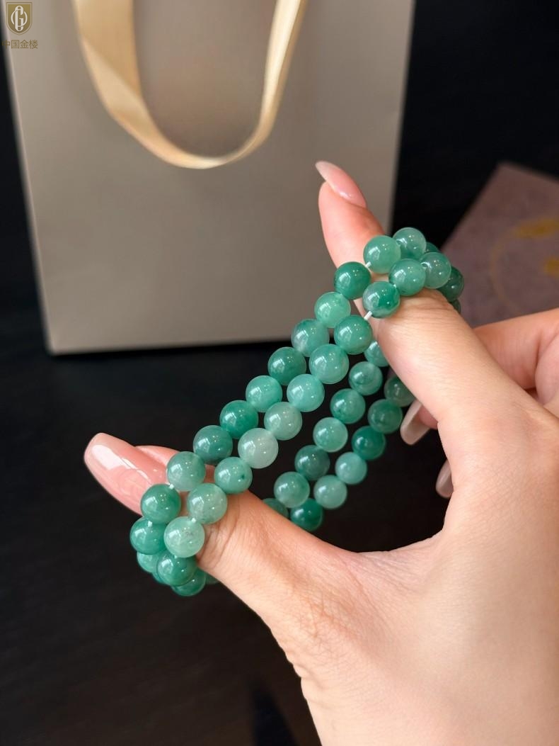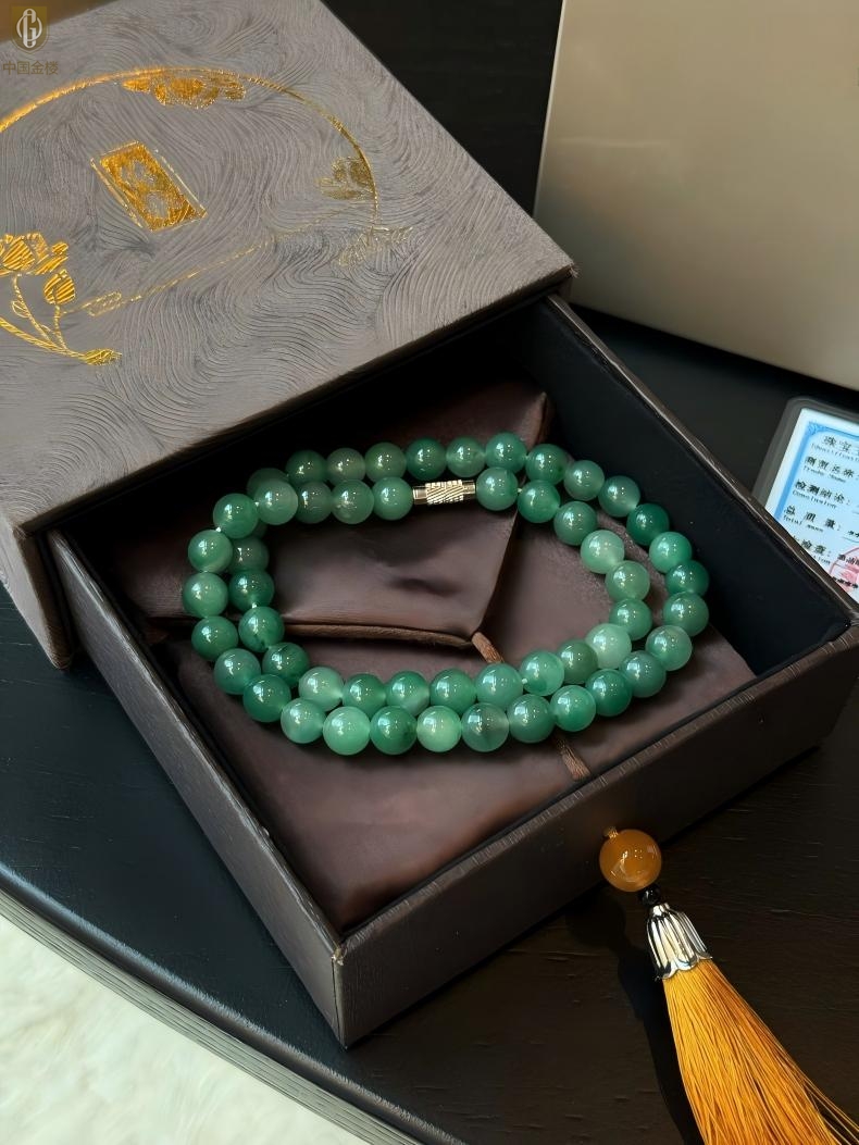 【品名】中国金楼TS专属A级冰绿非洲翠飘花珠链8mm(传承礼盒)