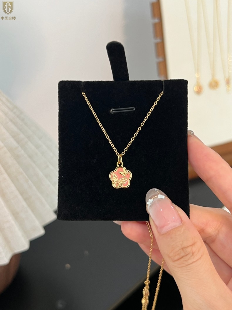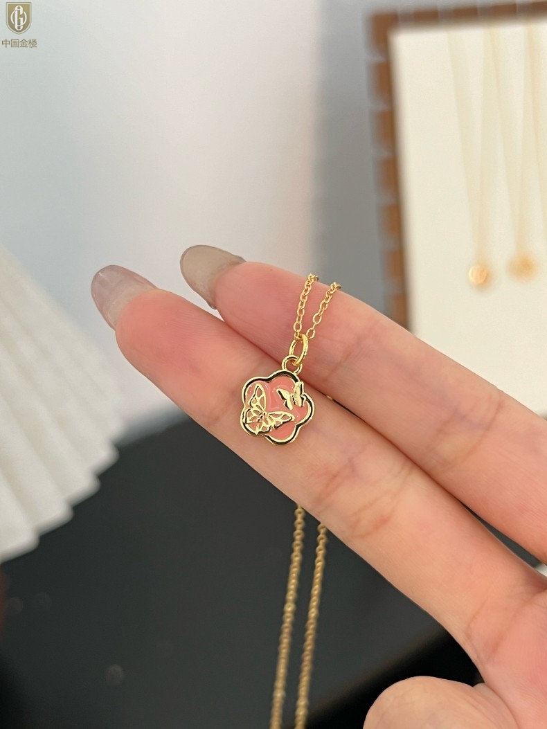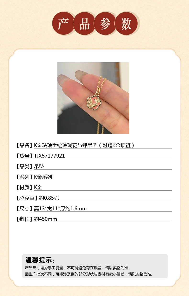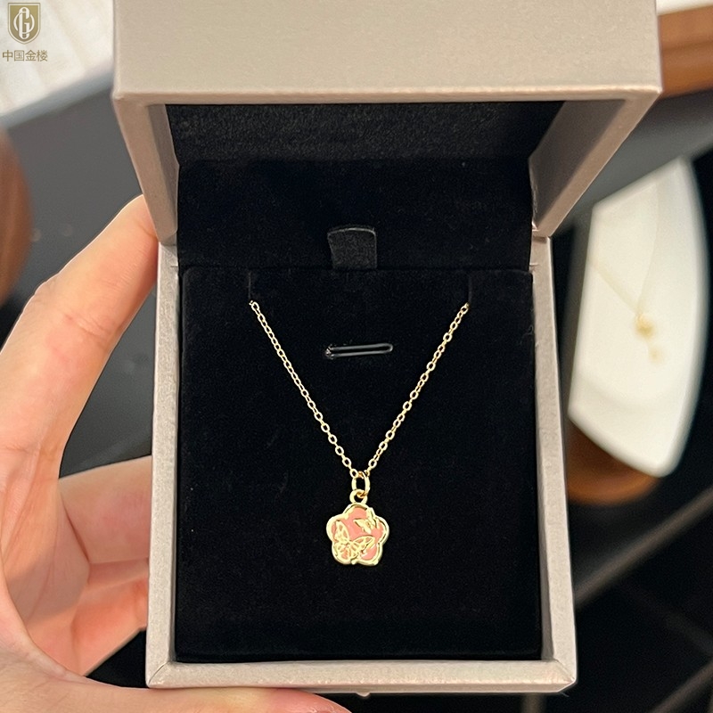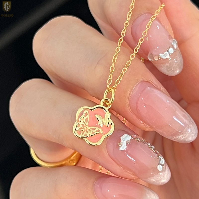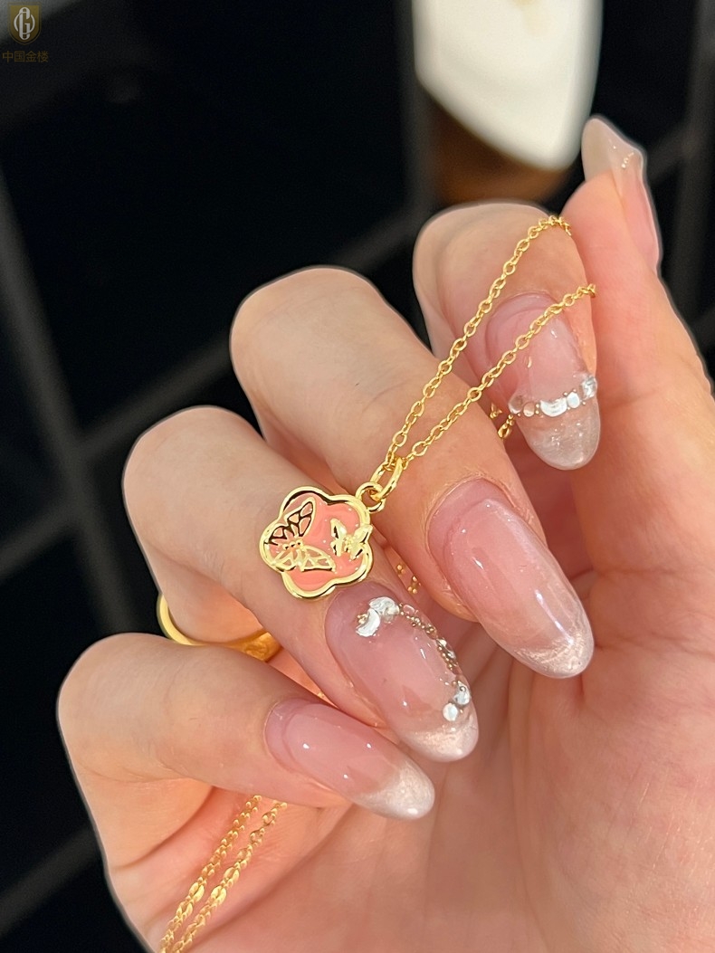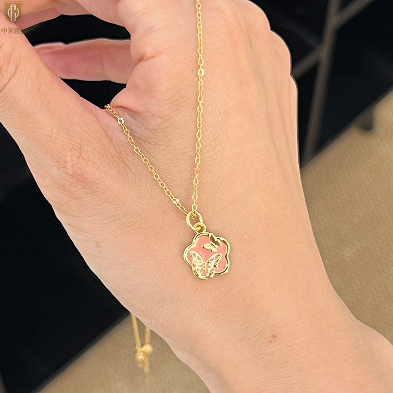 【品名】中国金楼K金珐琅手绘玲珑花与蝶吊坠(附赠K金项链)
