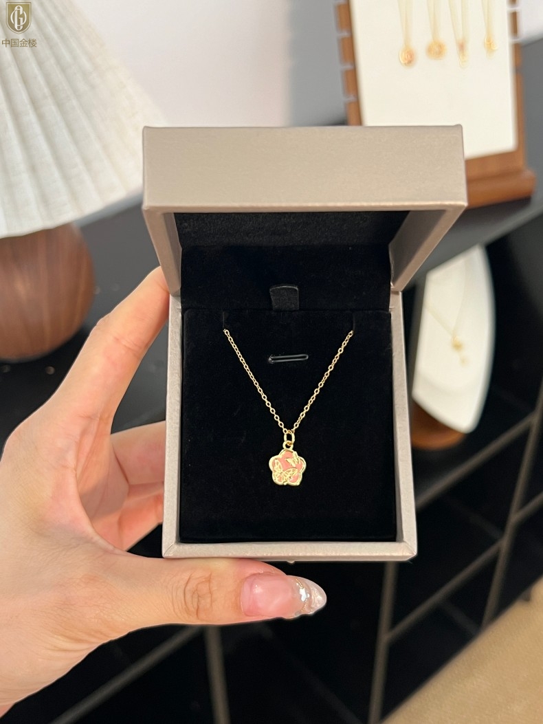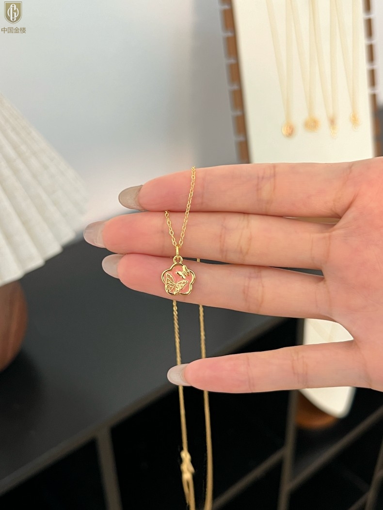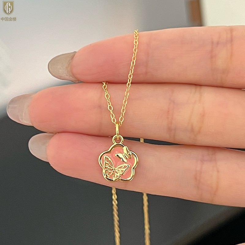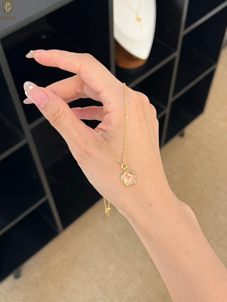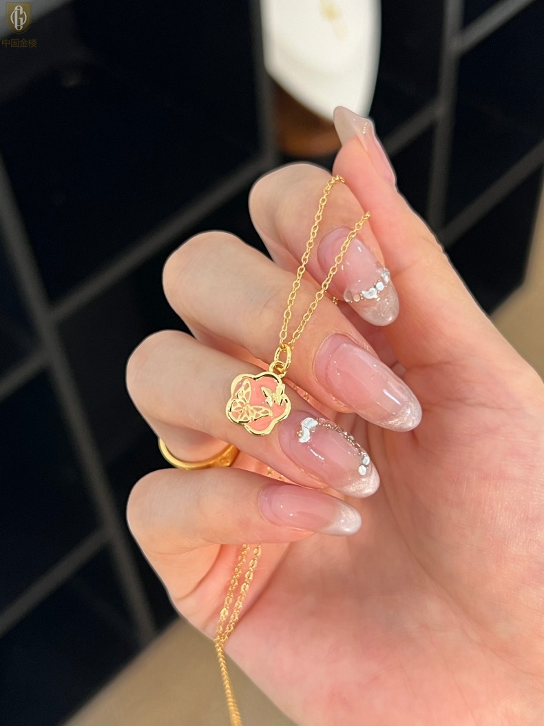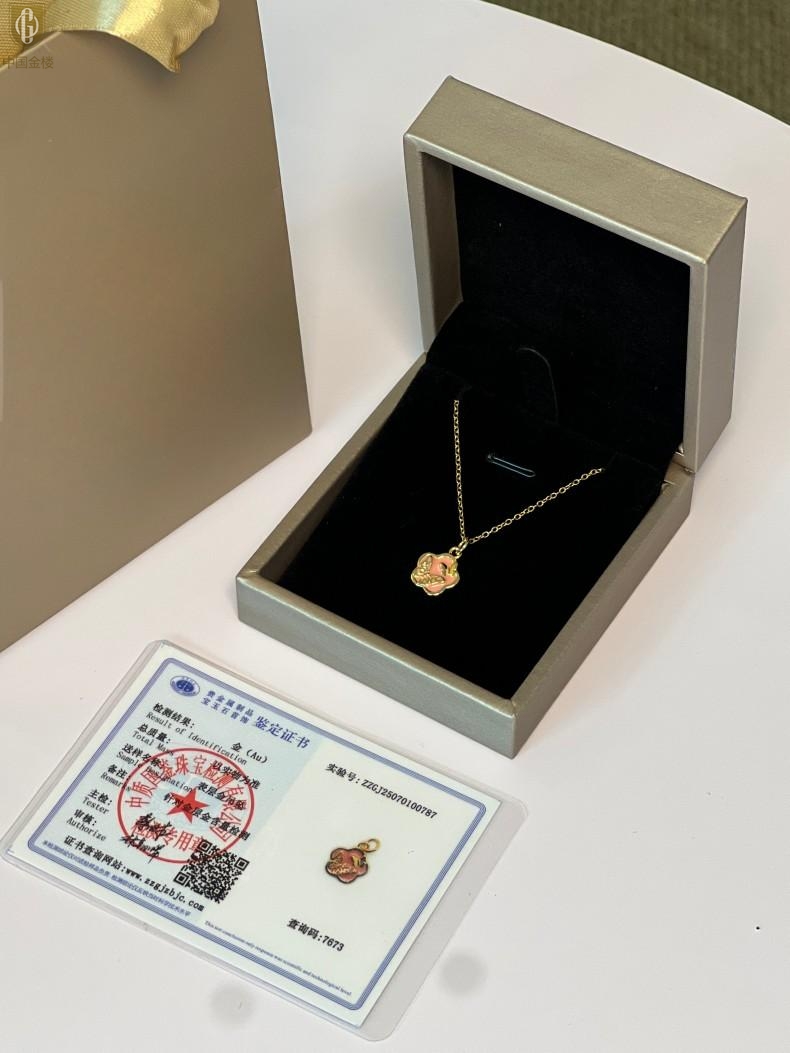 【品名】中国金楼K金珐琅手绘玲珑花与蝶吊坠(附赠K金项链)