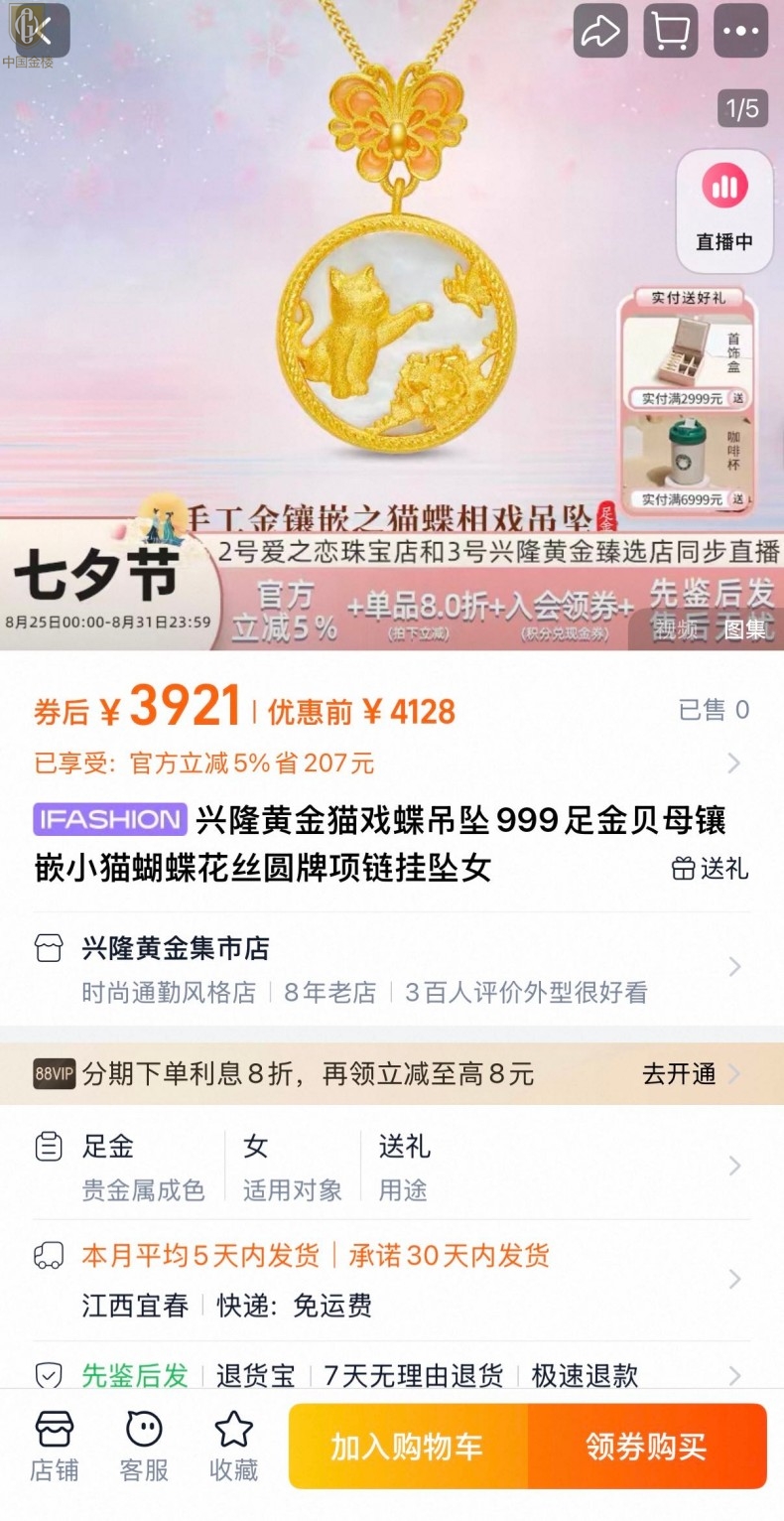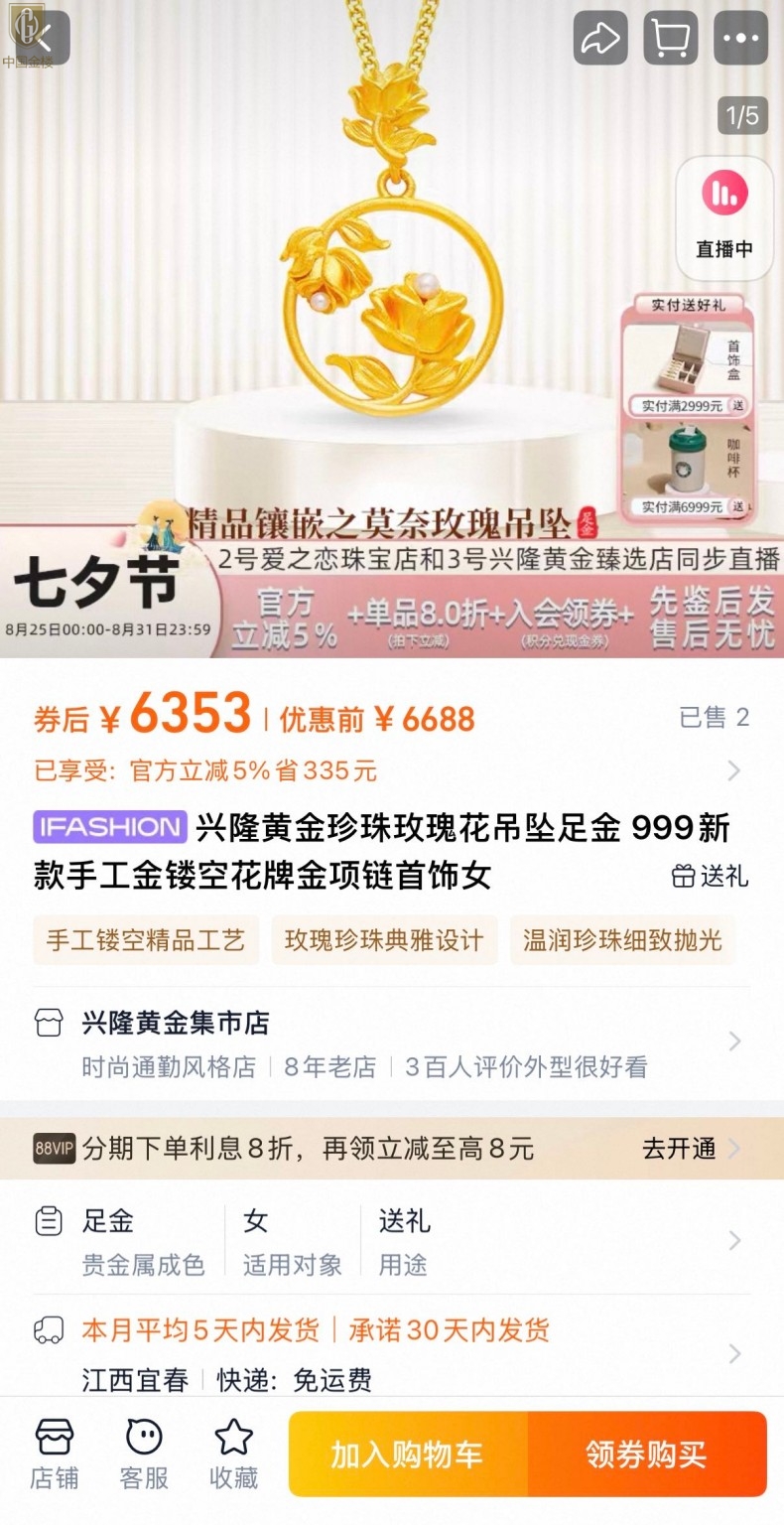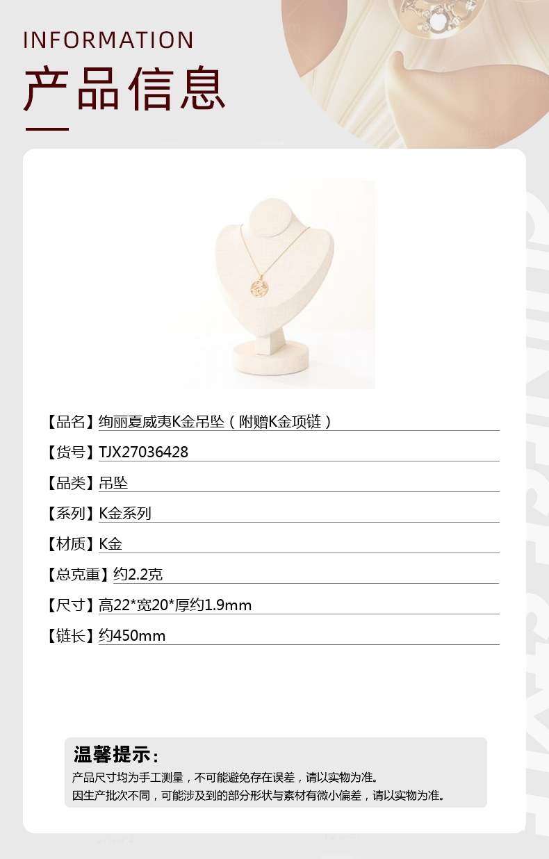 【品名】中国金楼绚丽夏威夷K金吊坠(附赠K金项链)