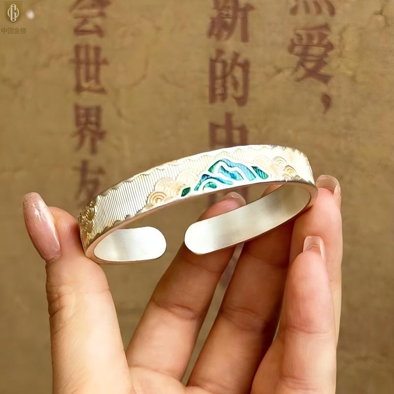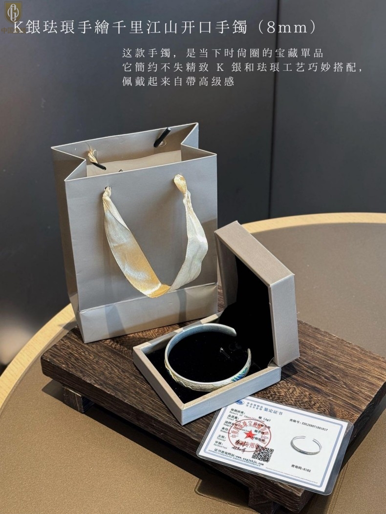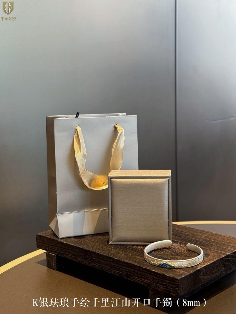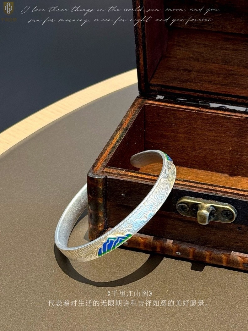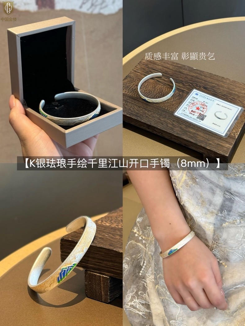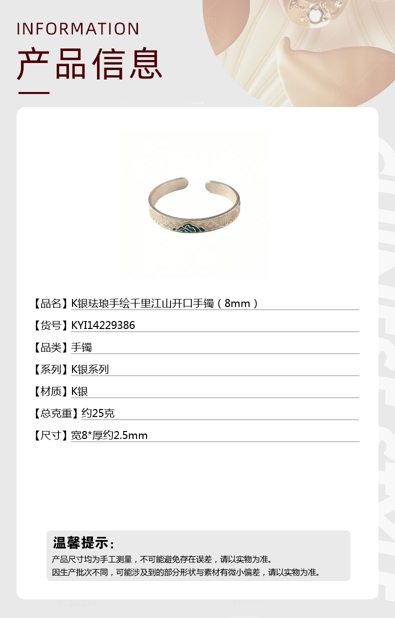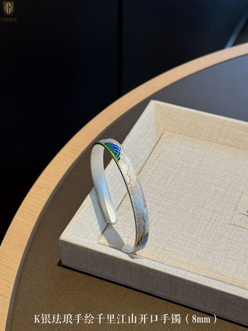 【品名】中国金楼K银珐琅手绘千里江山开口手镯(8mm)