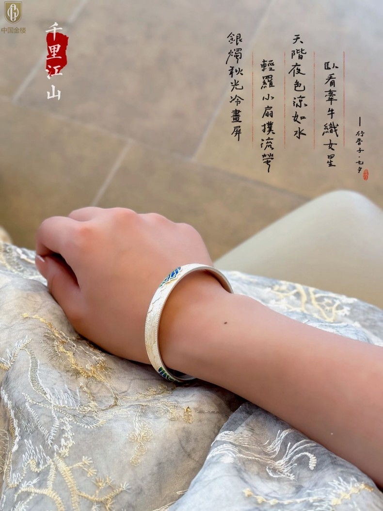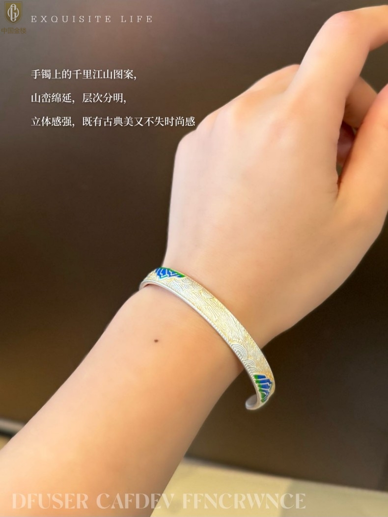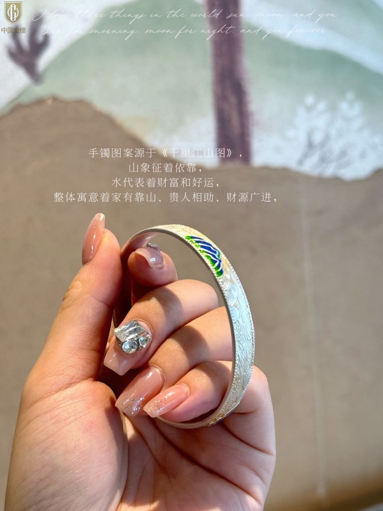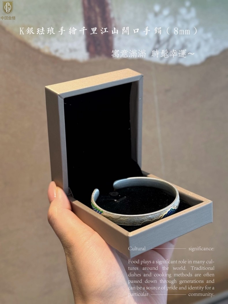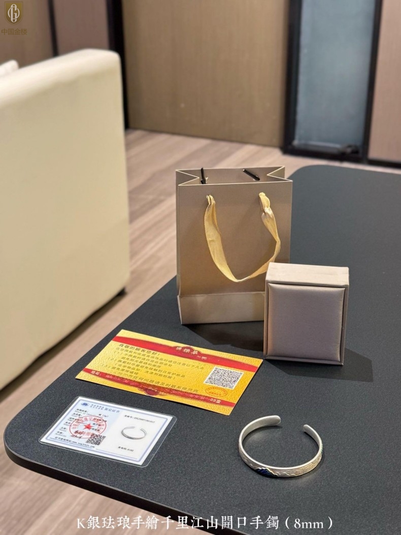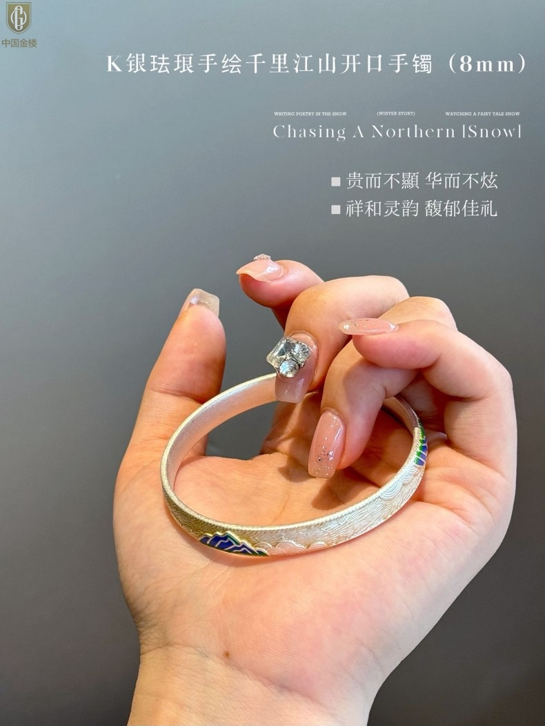 【品名】中国金楼K银珐琅手绘千里江山开口手镯(8mm)