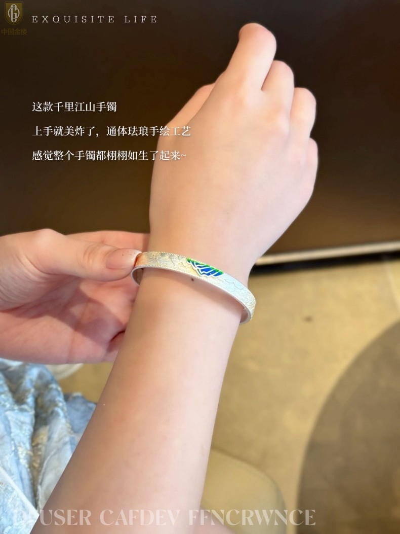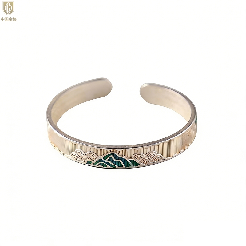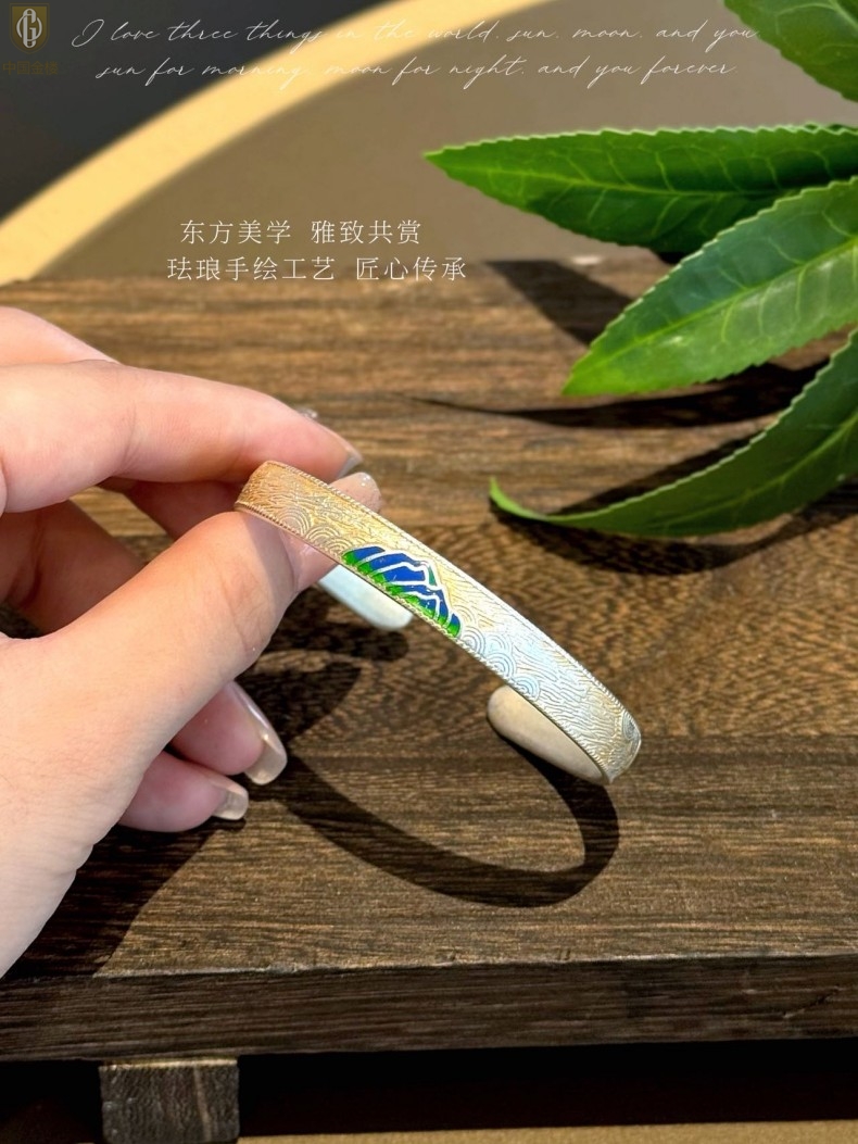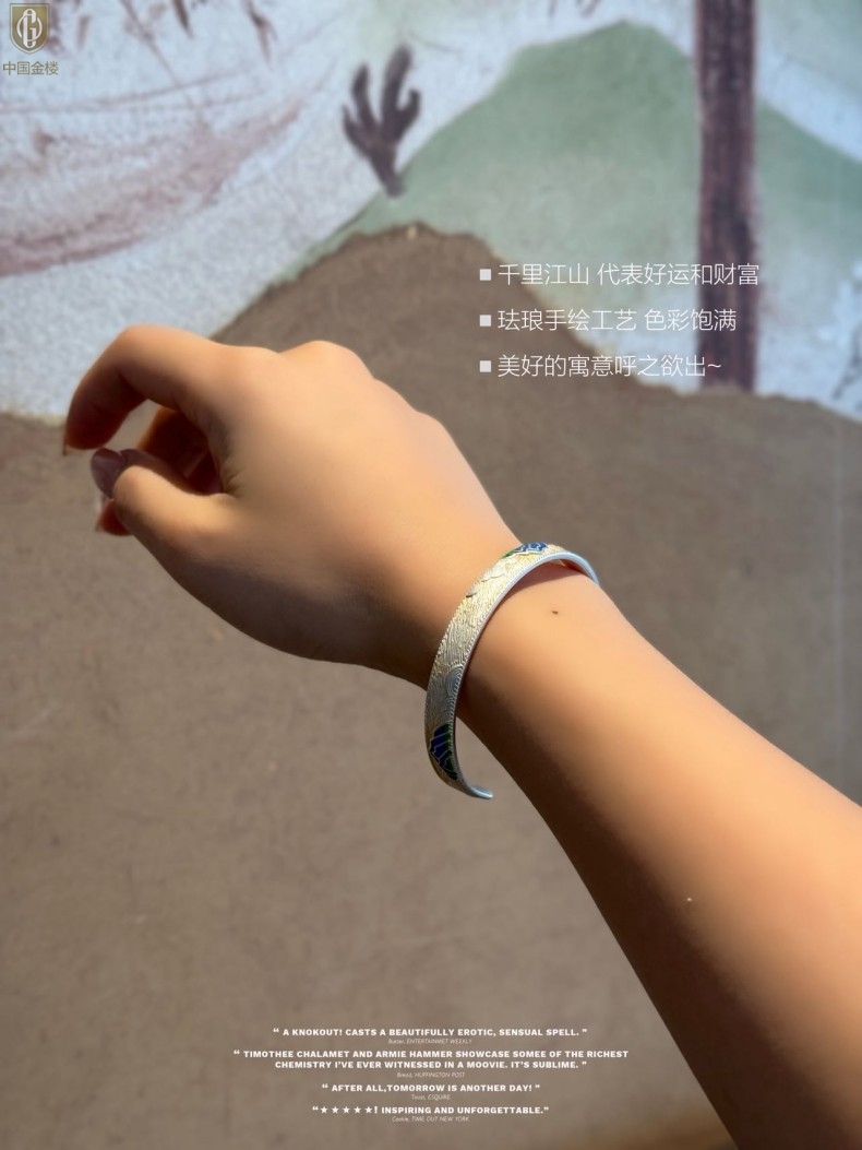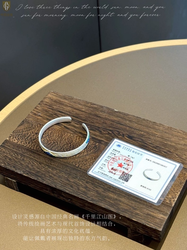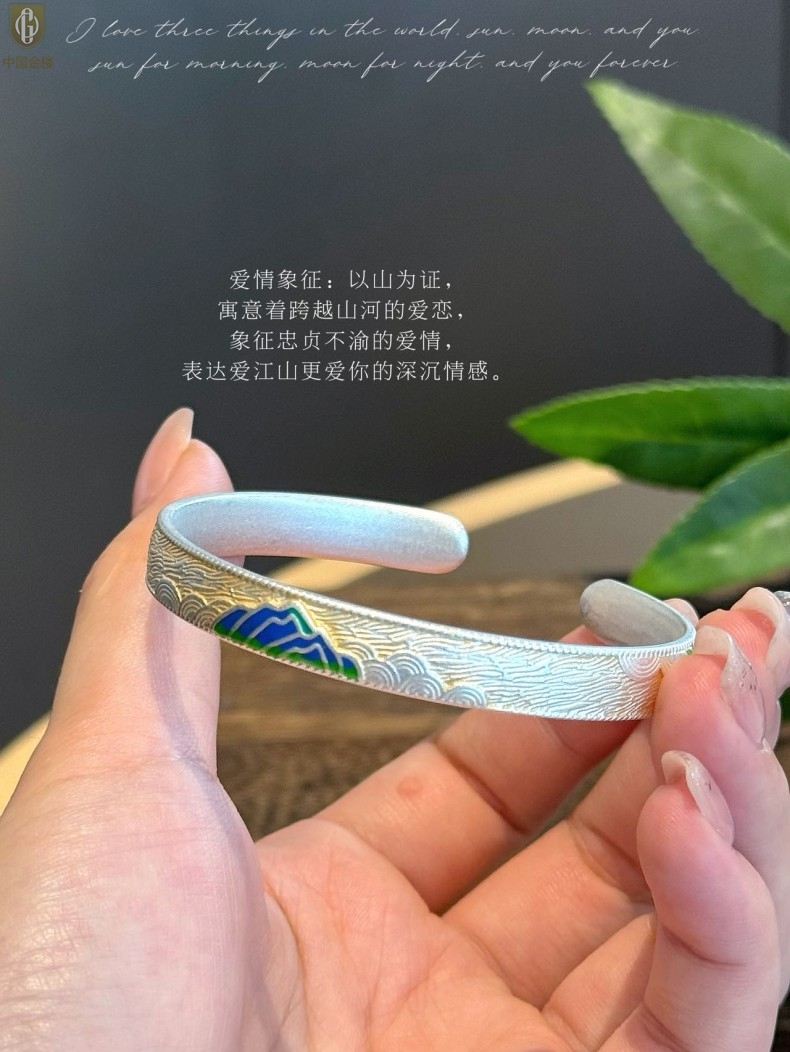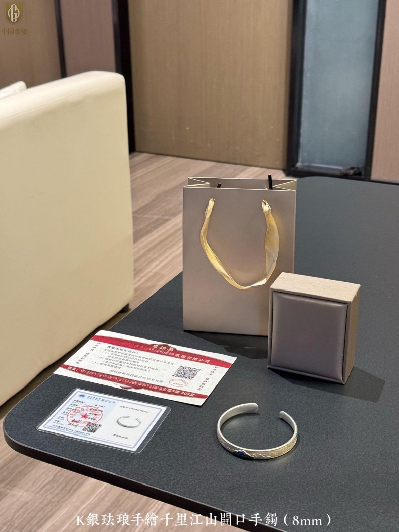 【品名】中国金楼K银珐琅手绘千里江山开口手镯(8mm)