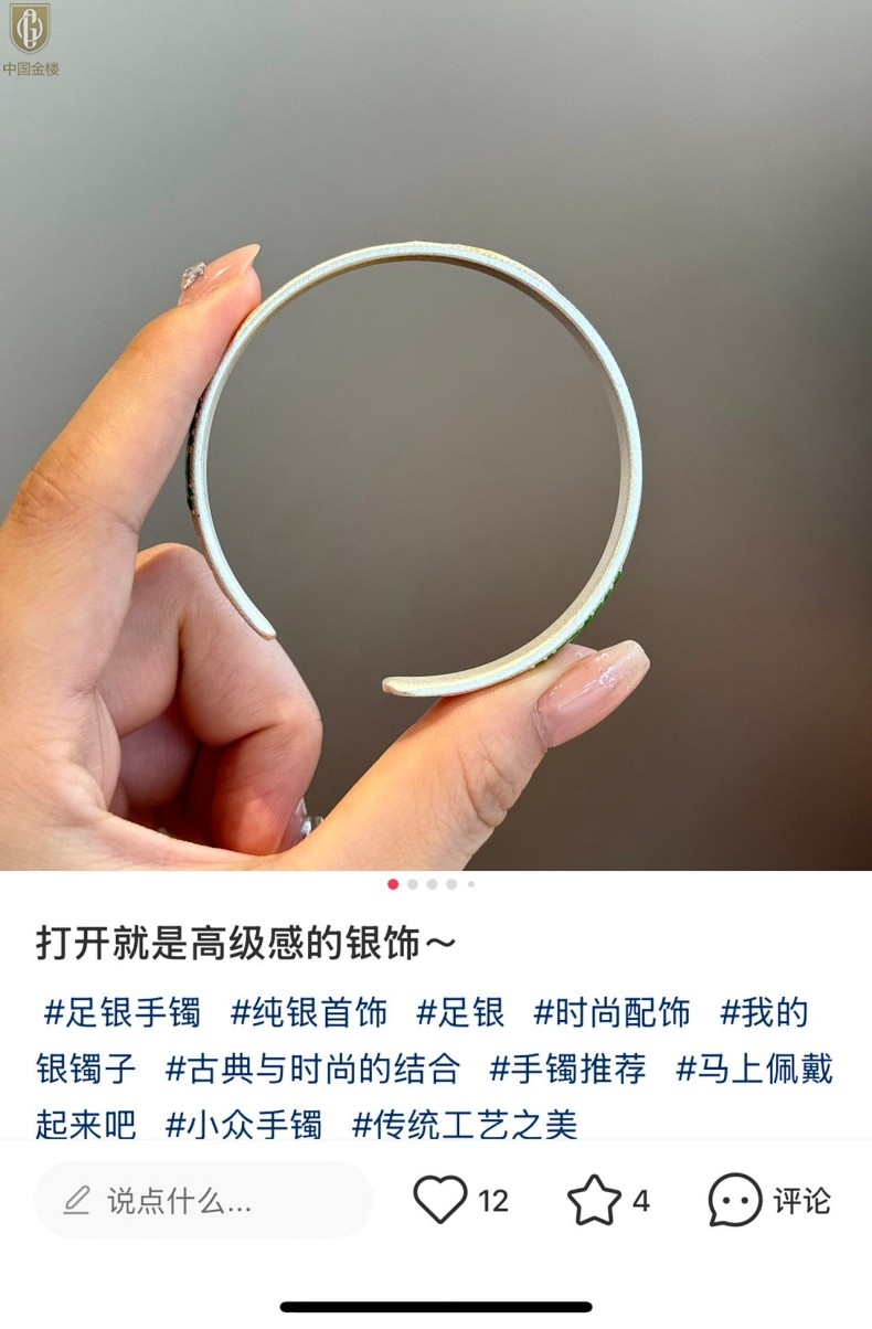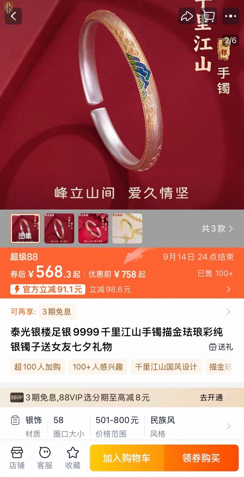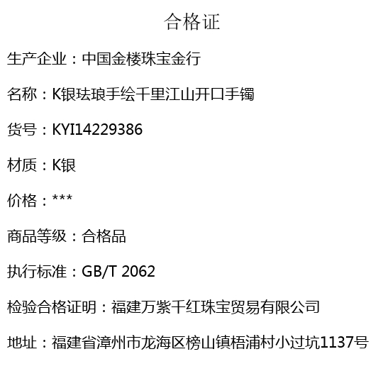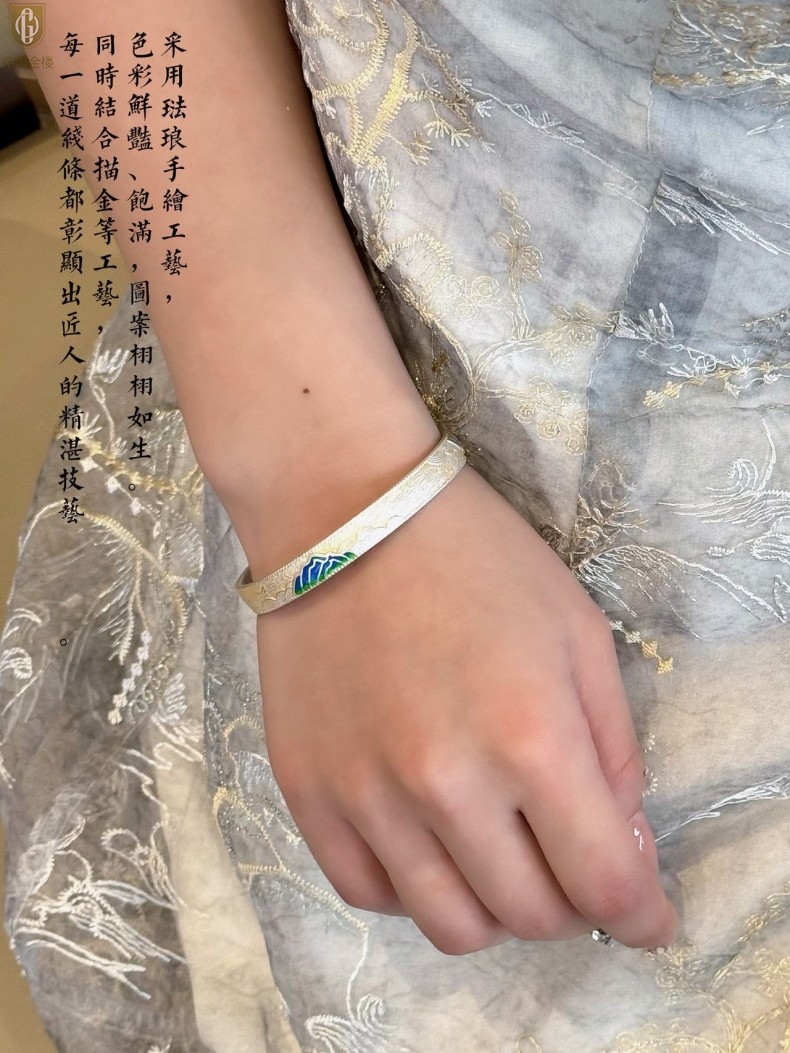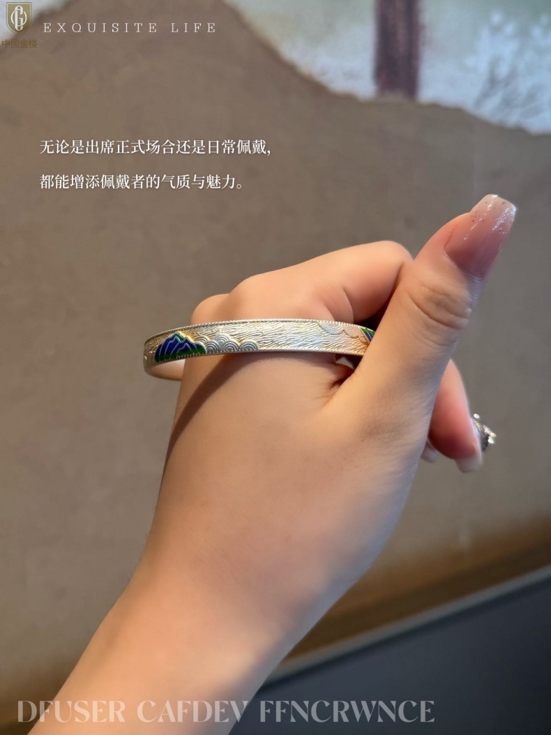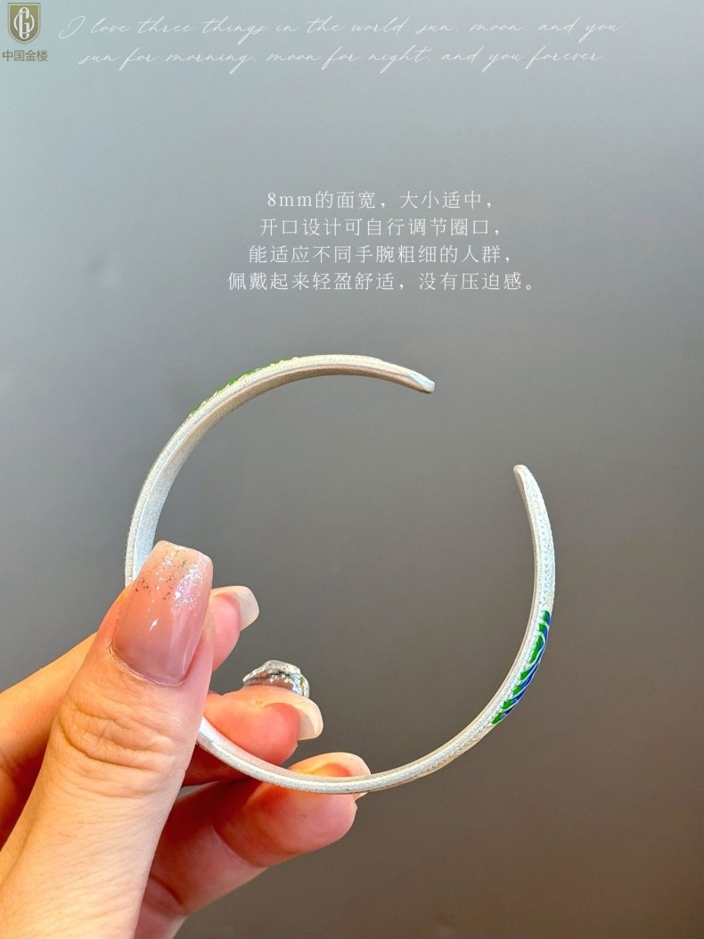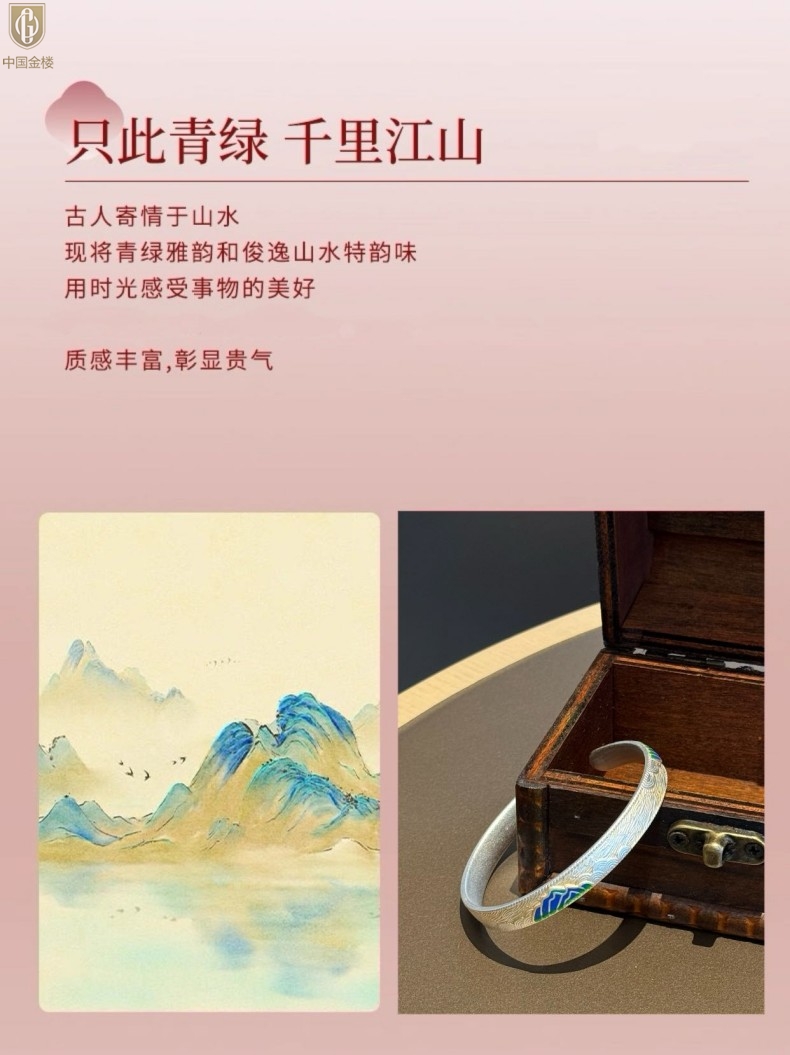 【品名】中国金楼K银珐琅手绘千里江山开口手镯(8mm)