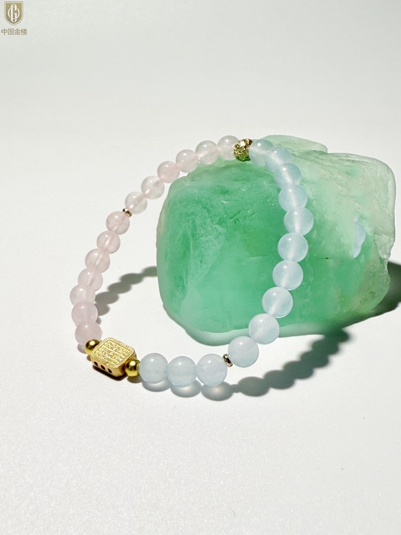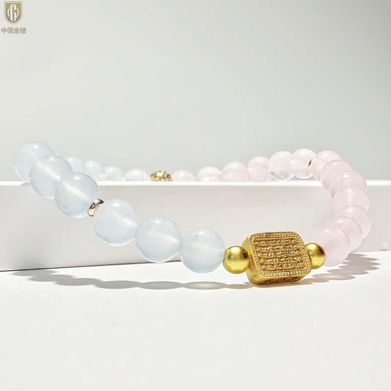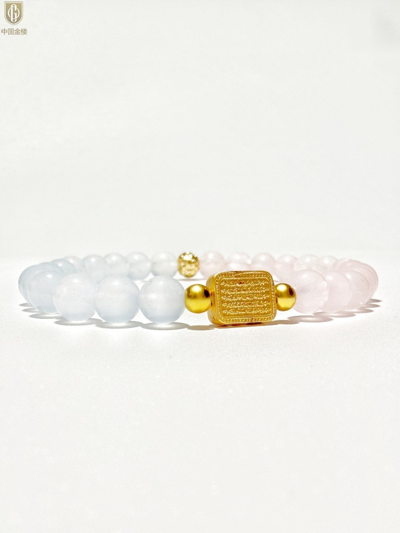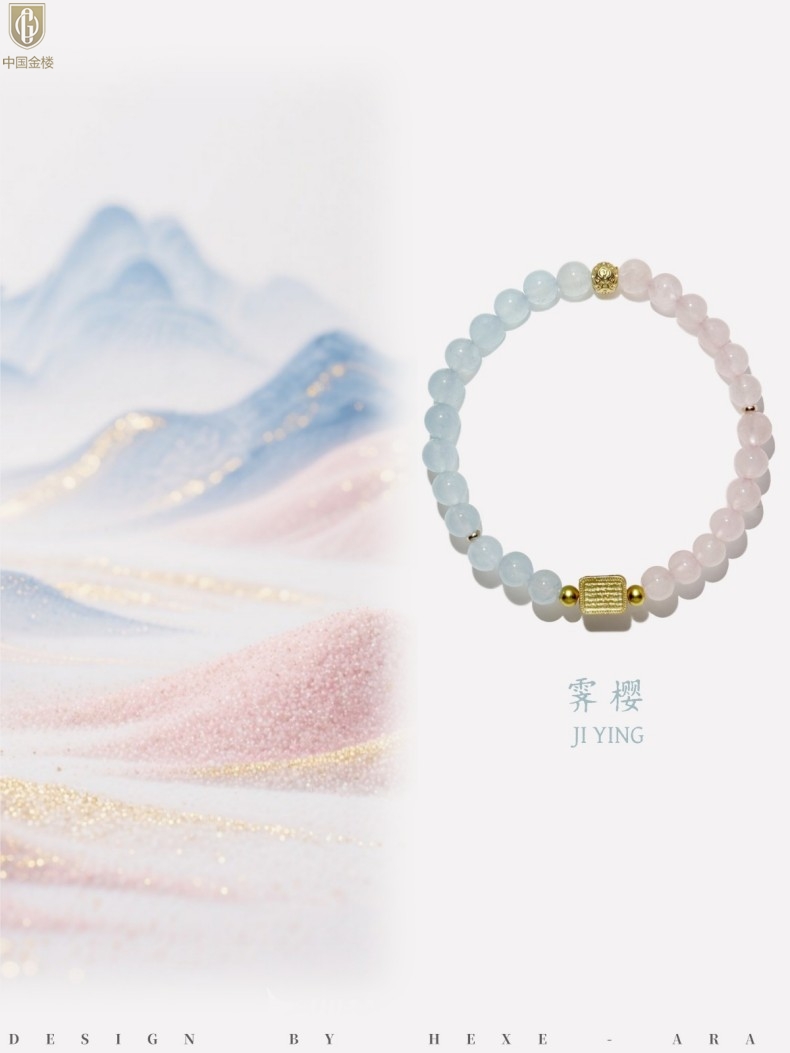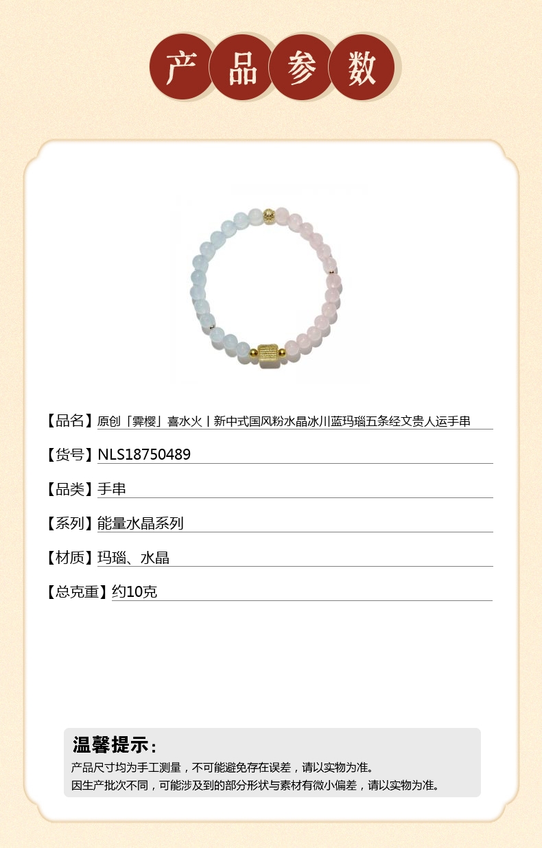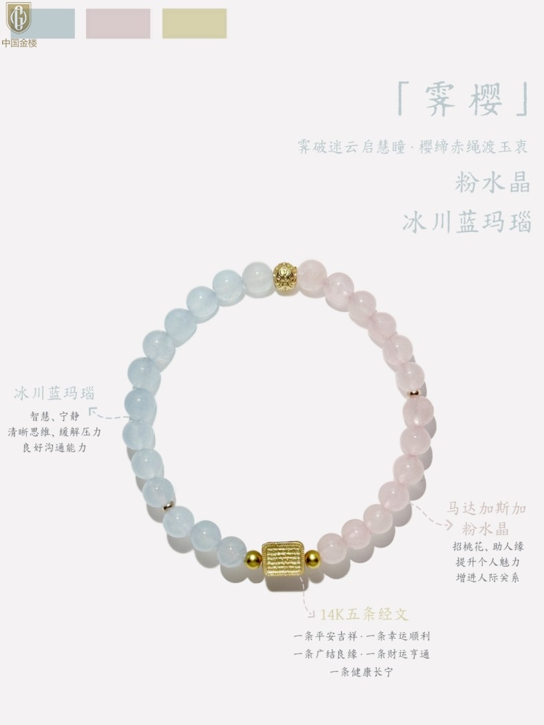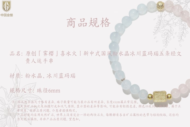 【品名】中国金楼原创「霁樱」喜水火丨新中式国风粉水晶冰川蓝玛瑙五条经文贵人运手串
