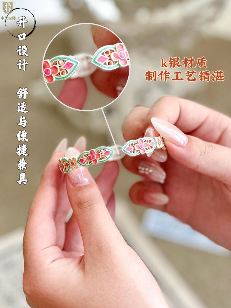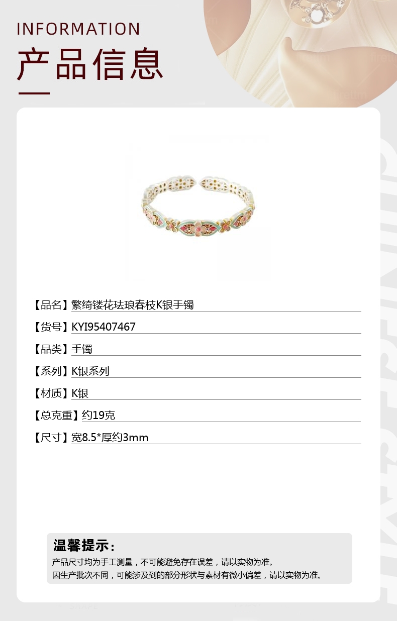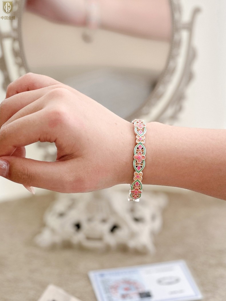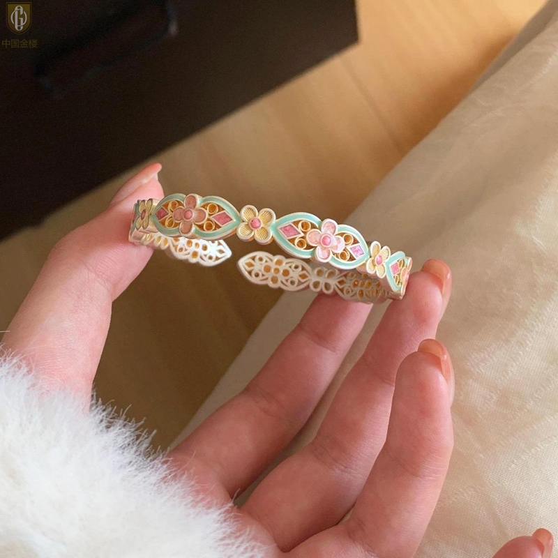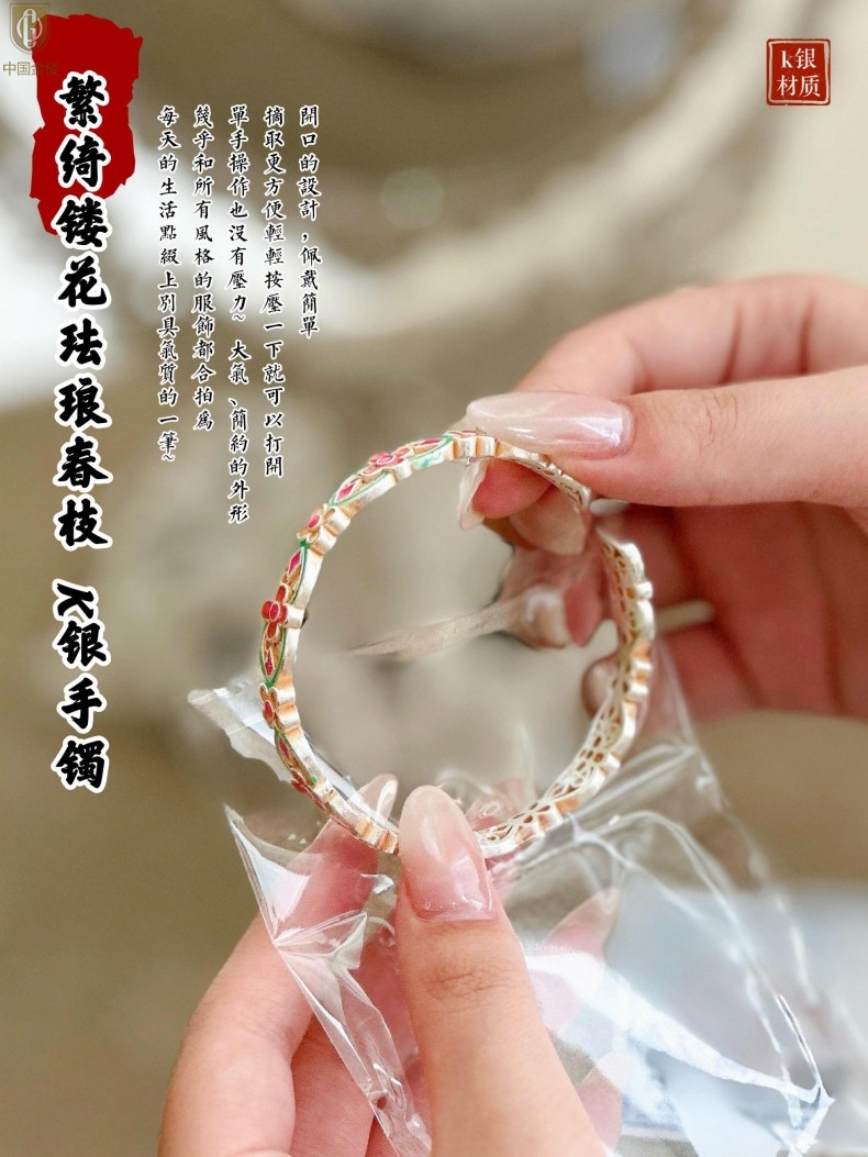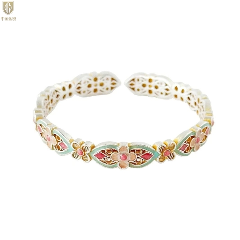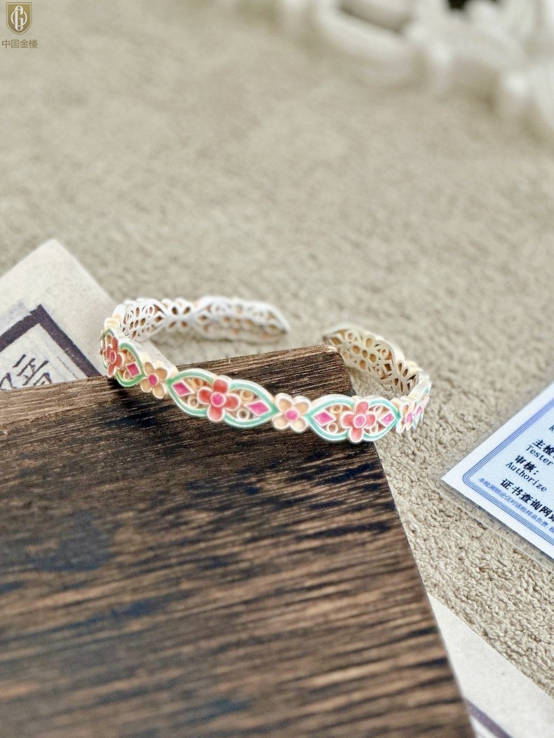 【品名】中国金楼繁绮镂花珐琅春枝K银手镯