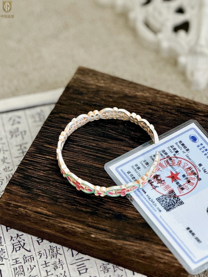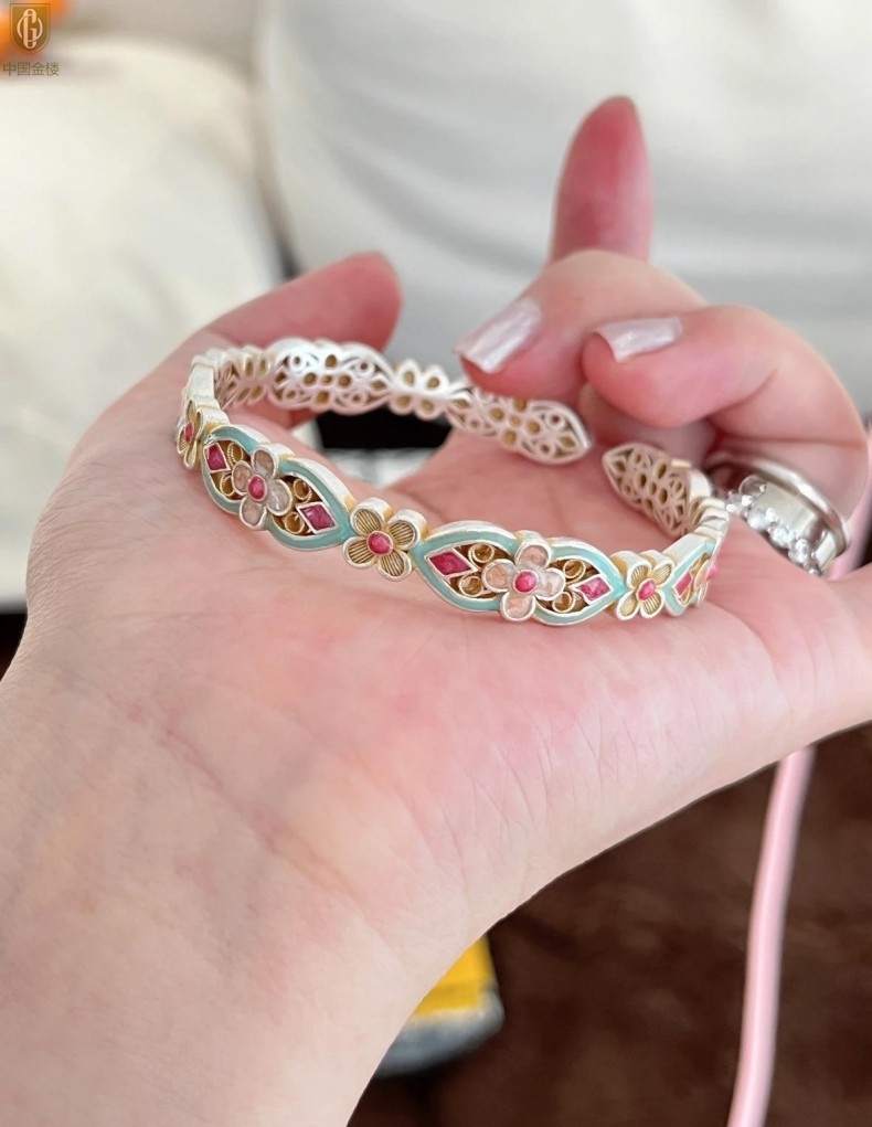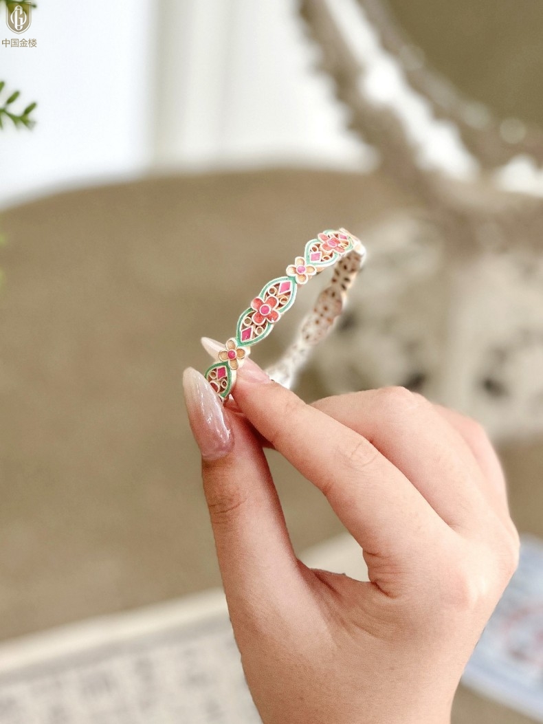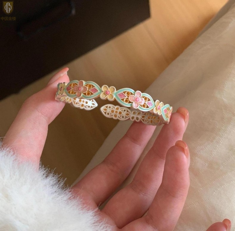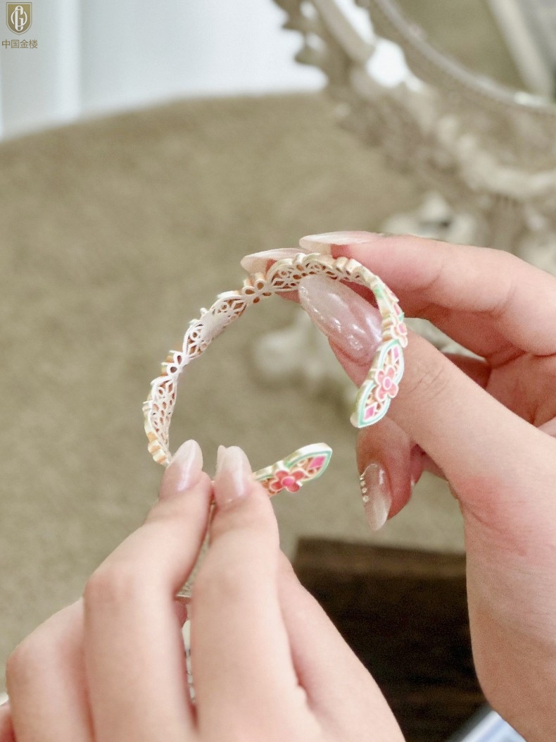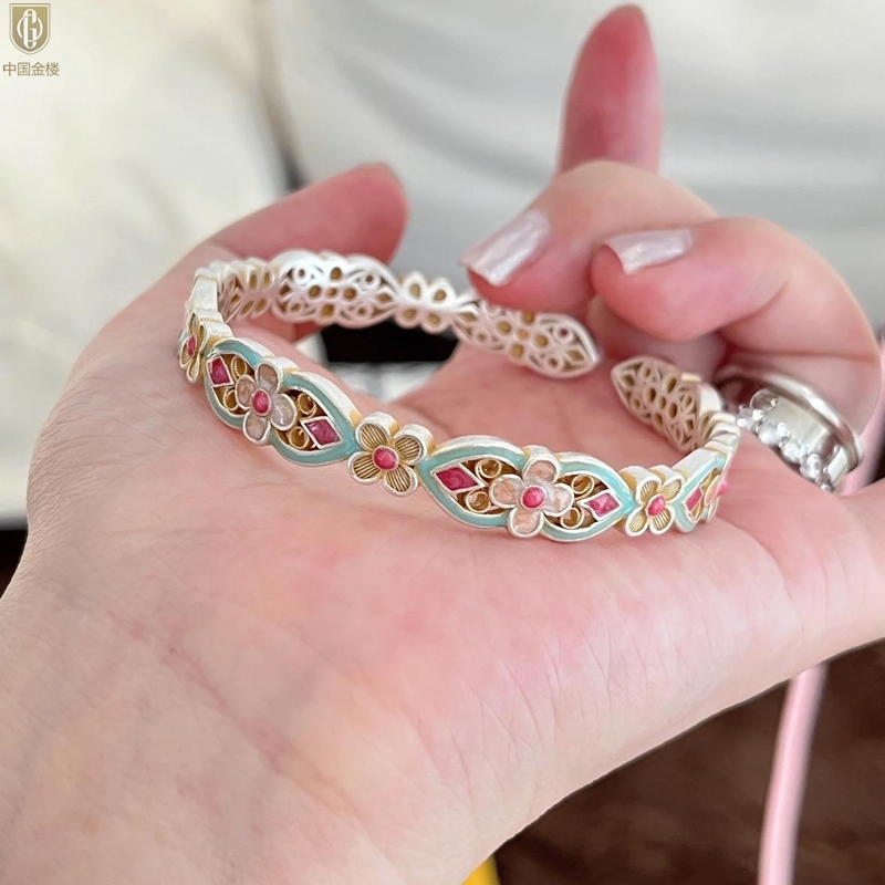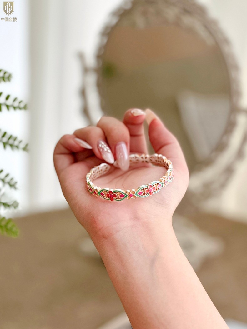 【品名】中国金楼繁绮镂花珐琅春枝K银手镯