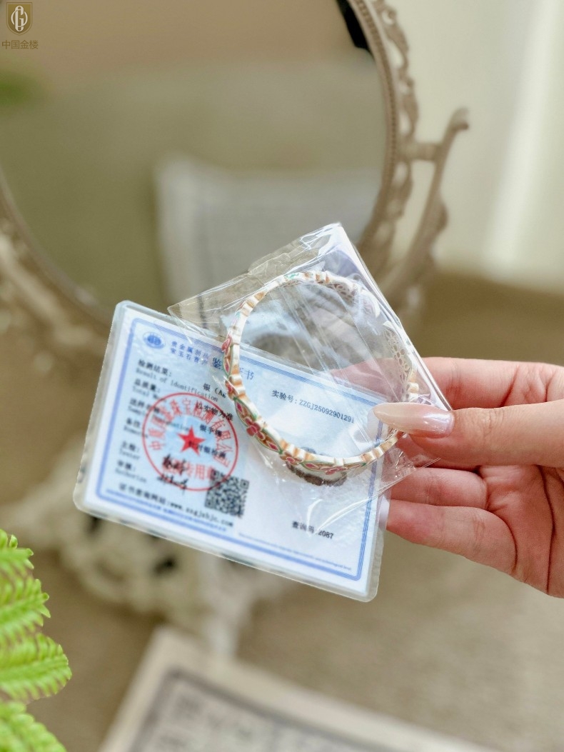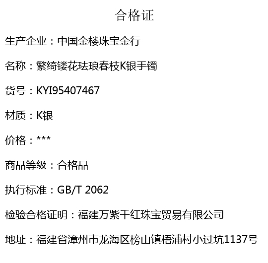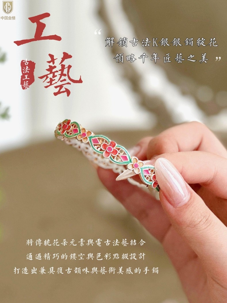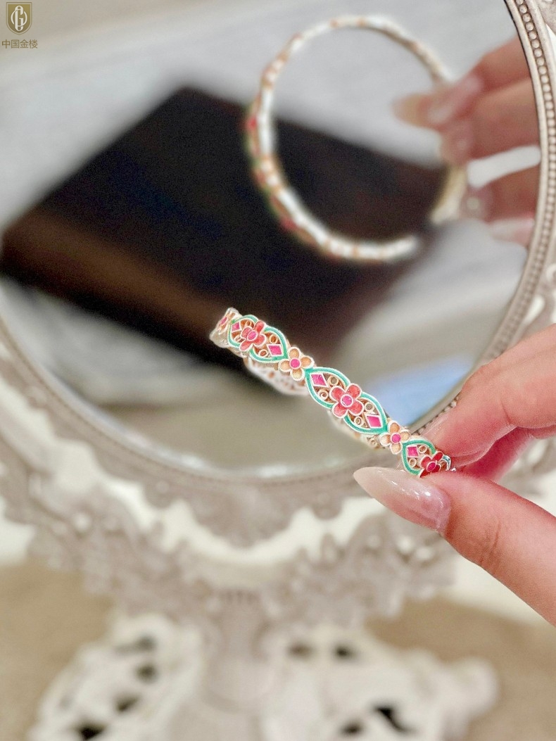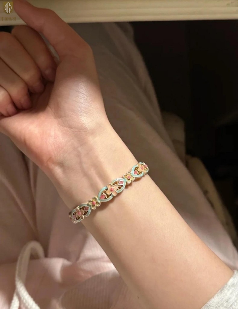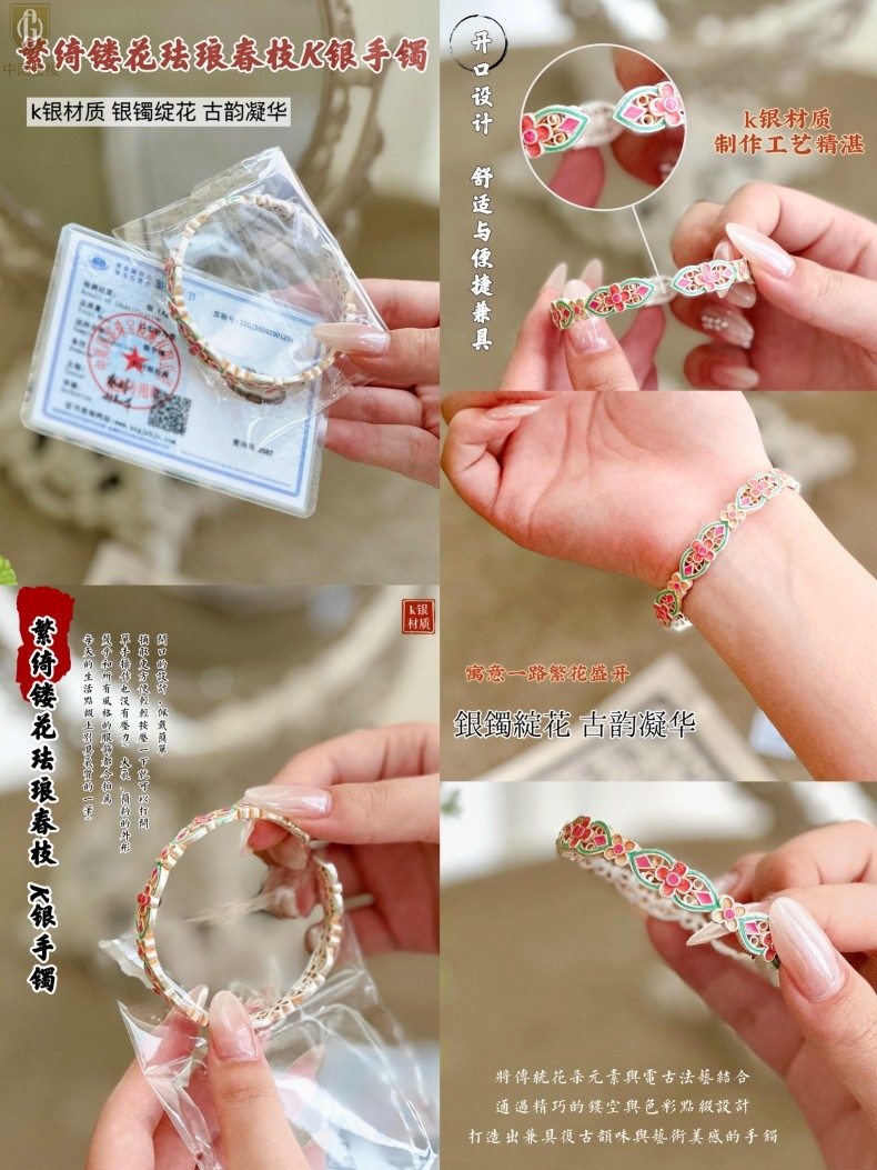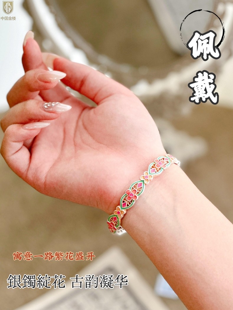 【品名】中国金楼繁绮镂花珐琅春枝K银手镯