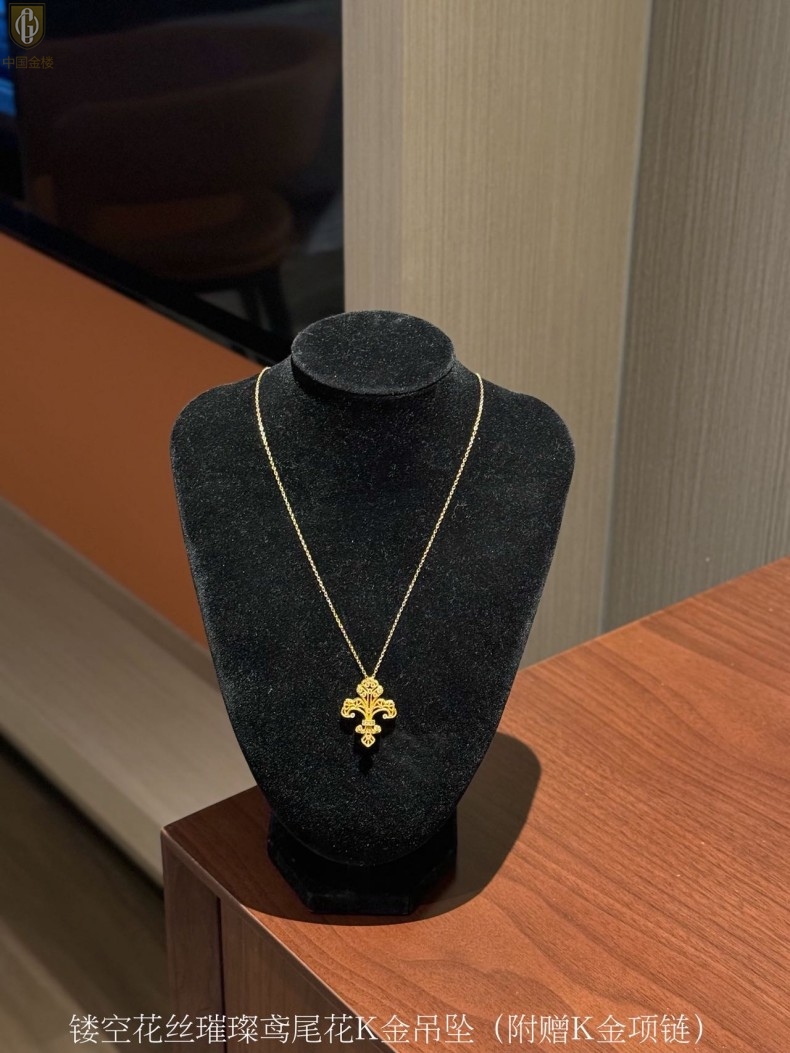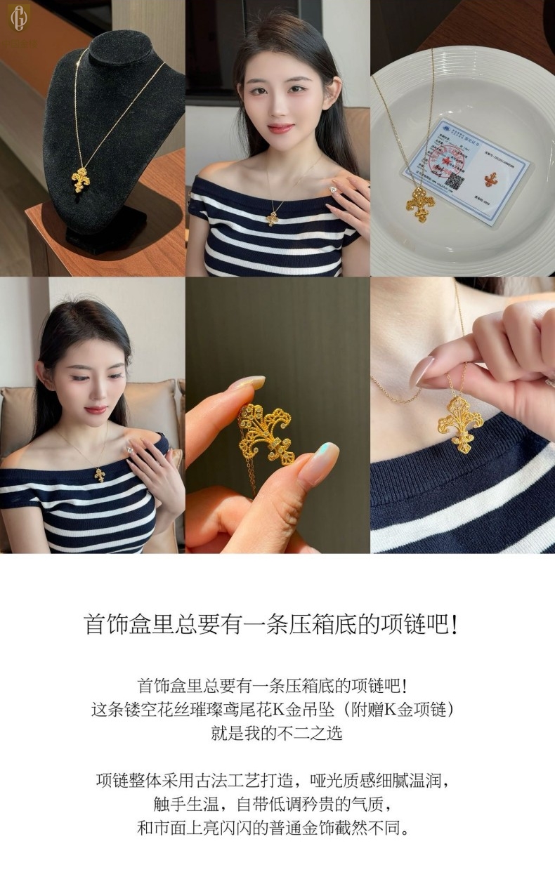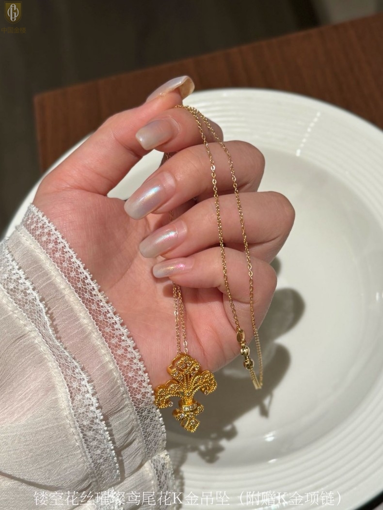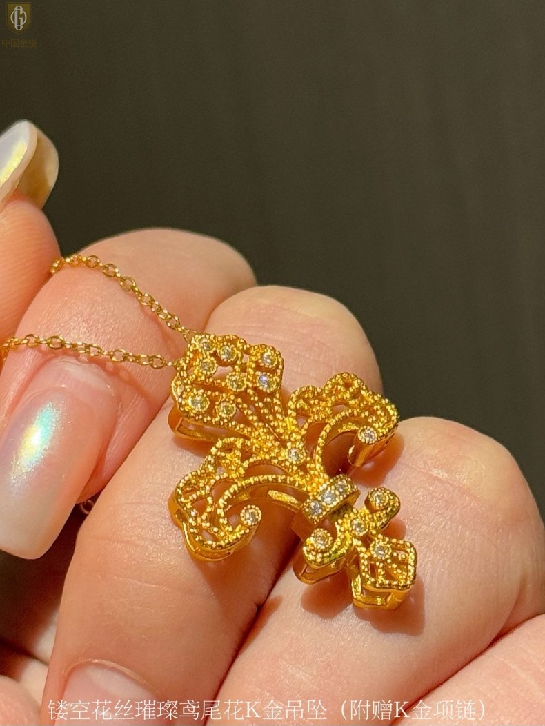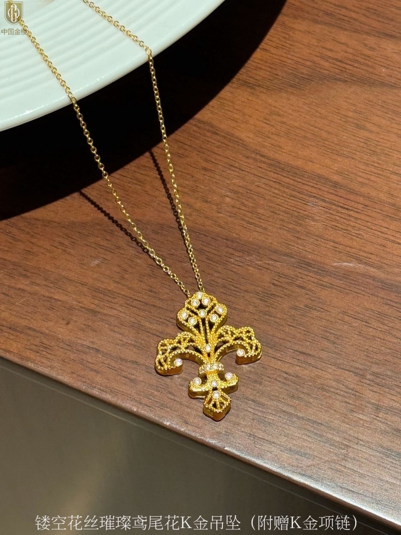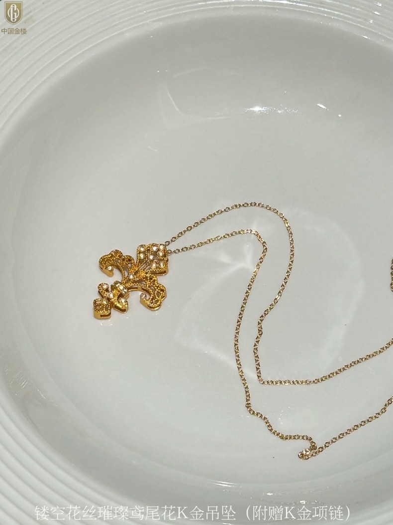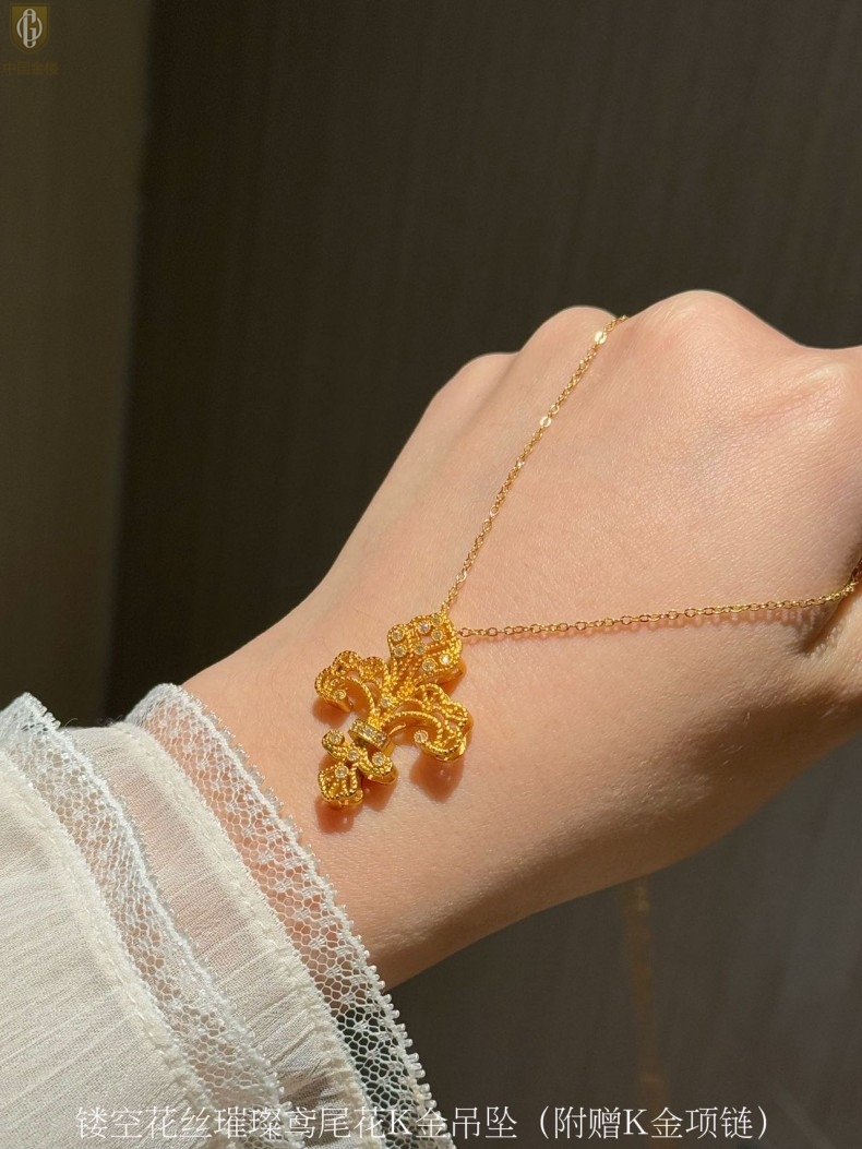 【品名】中国金楼镂空花丝璀璨鸢尾花K金吊坠(附赠K金项链)