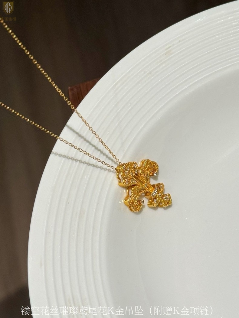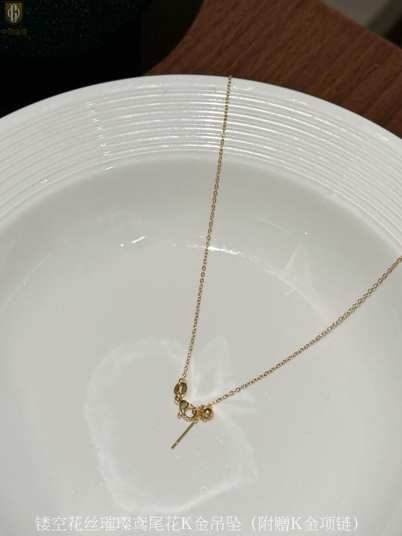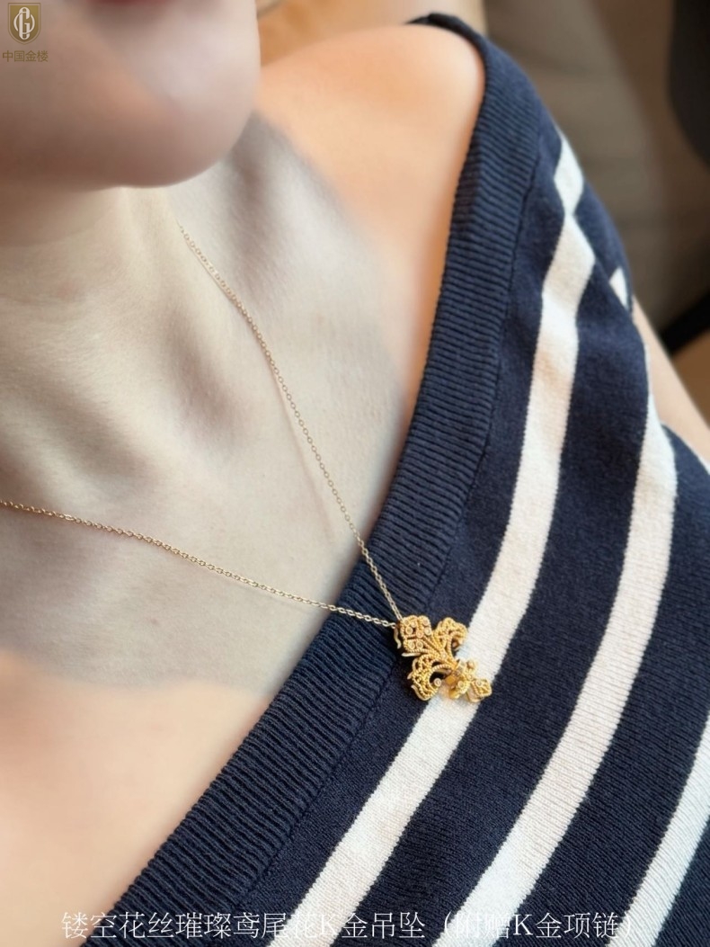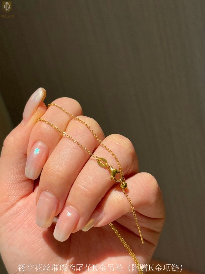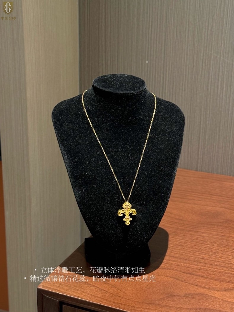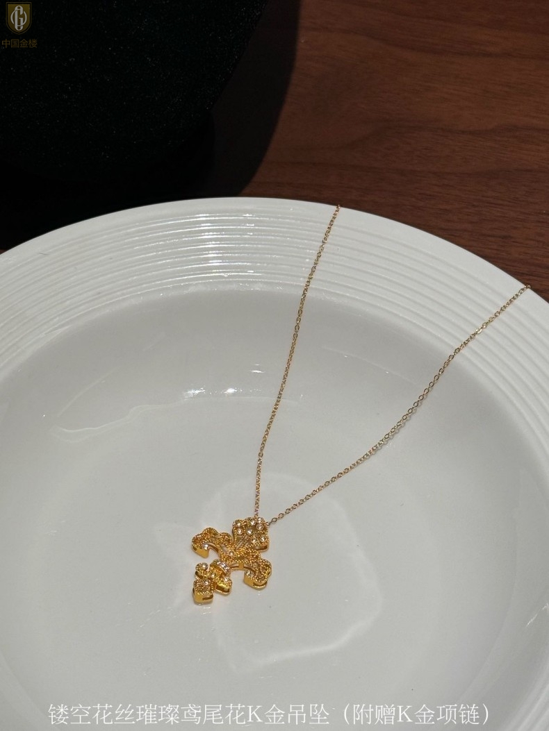 【品名】中国金楼镂空花丝璀璨鸢尾花K金吊坠(附赠K金项链)