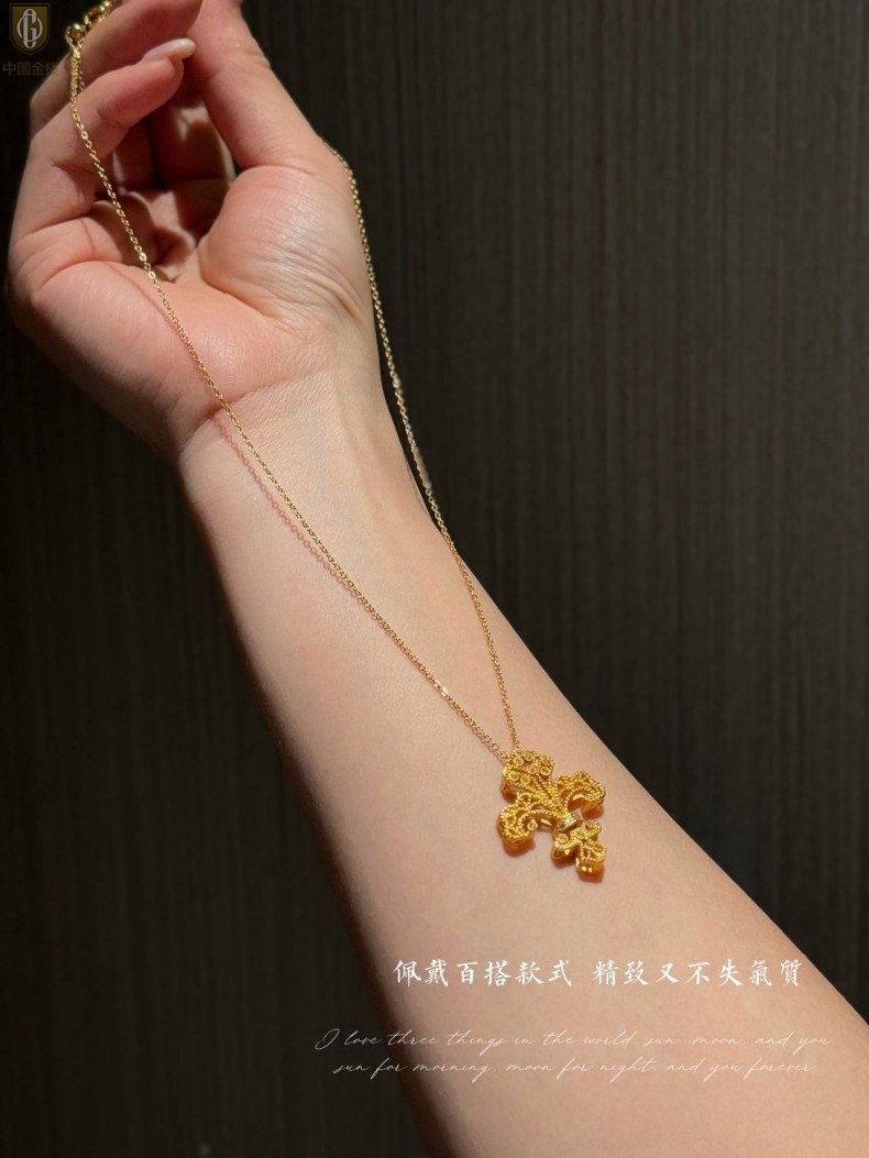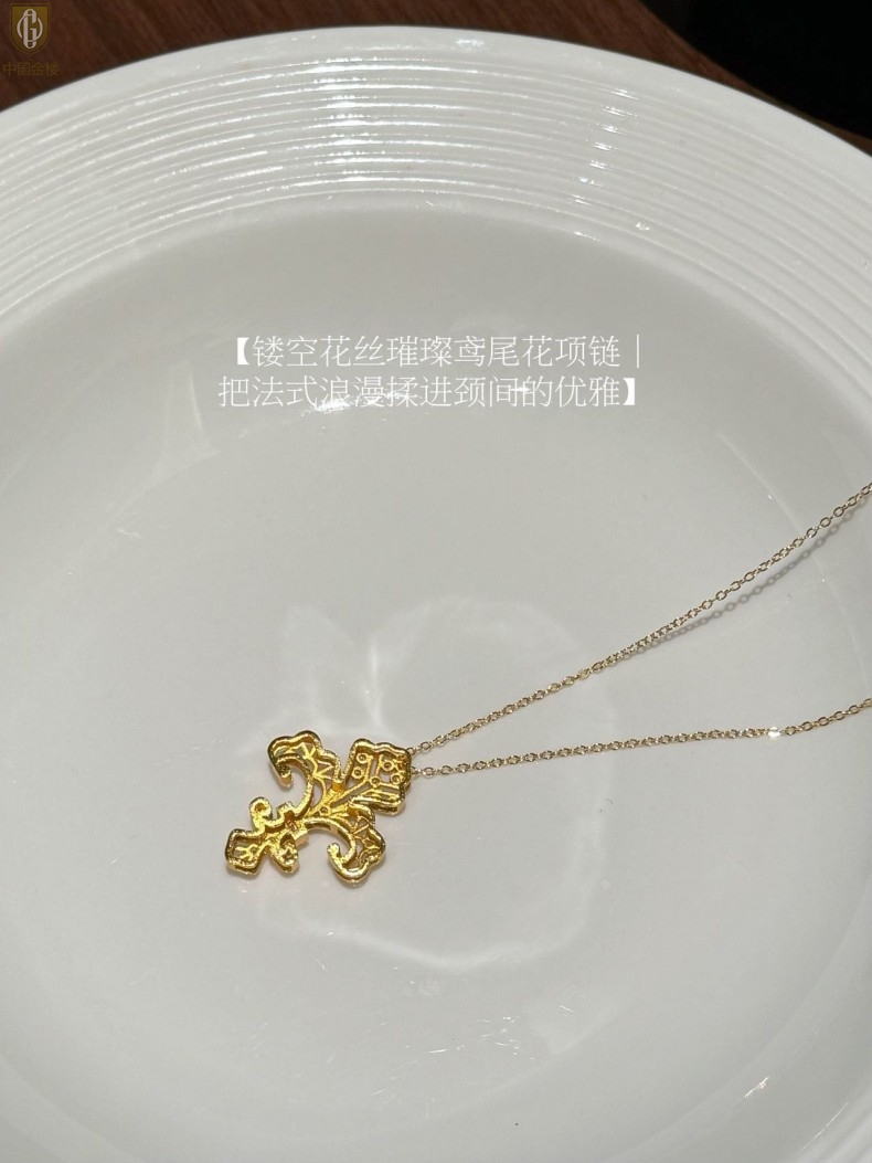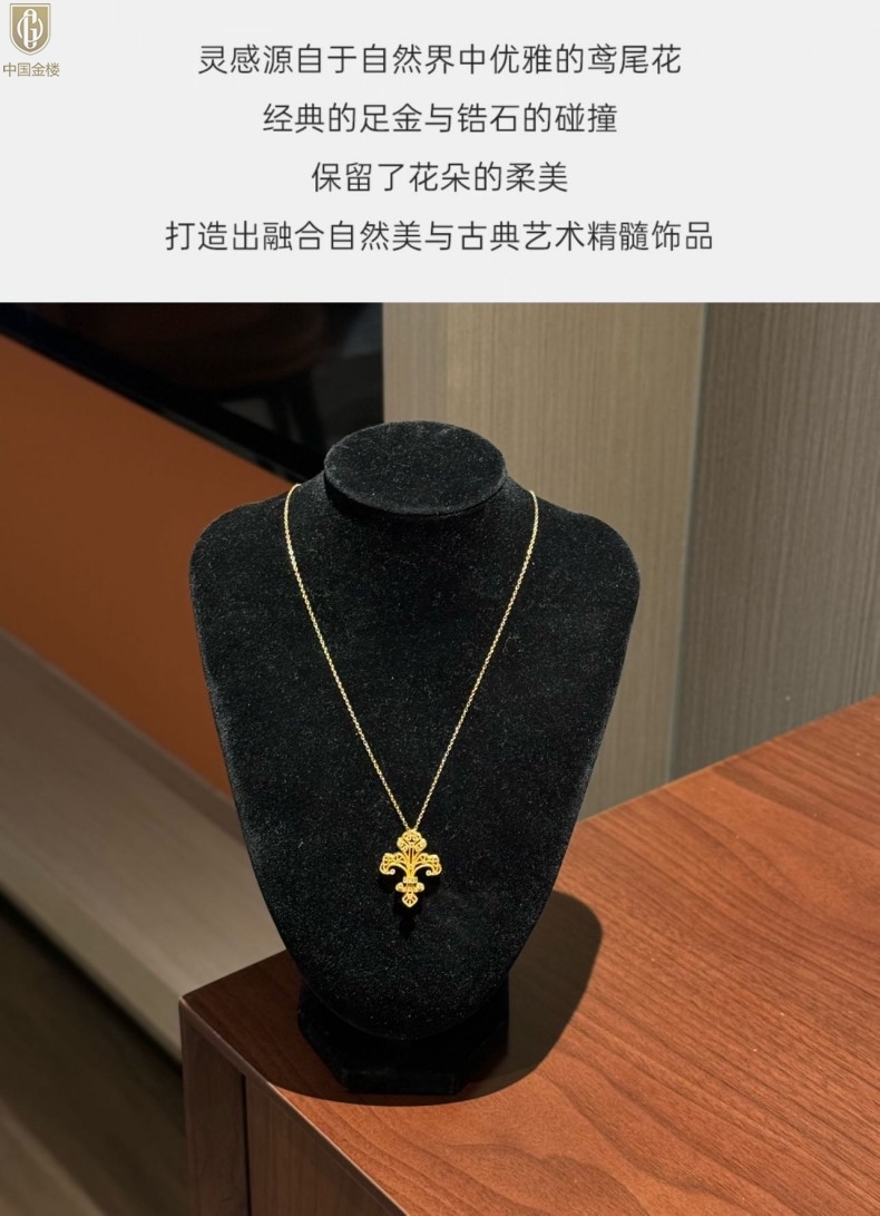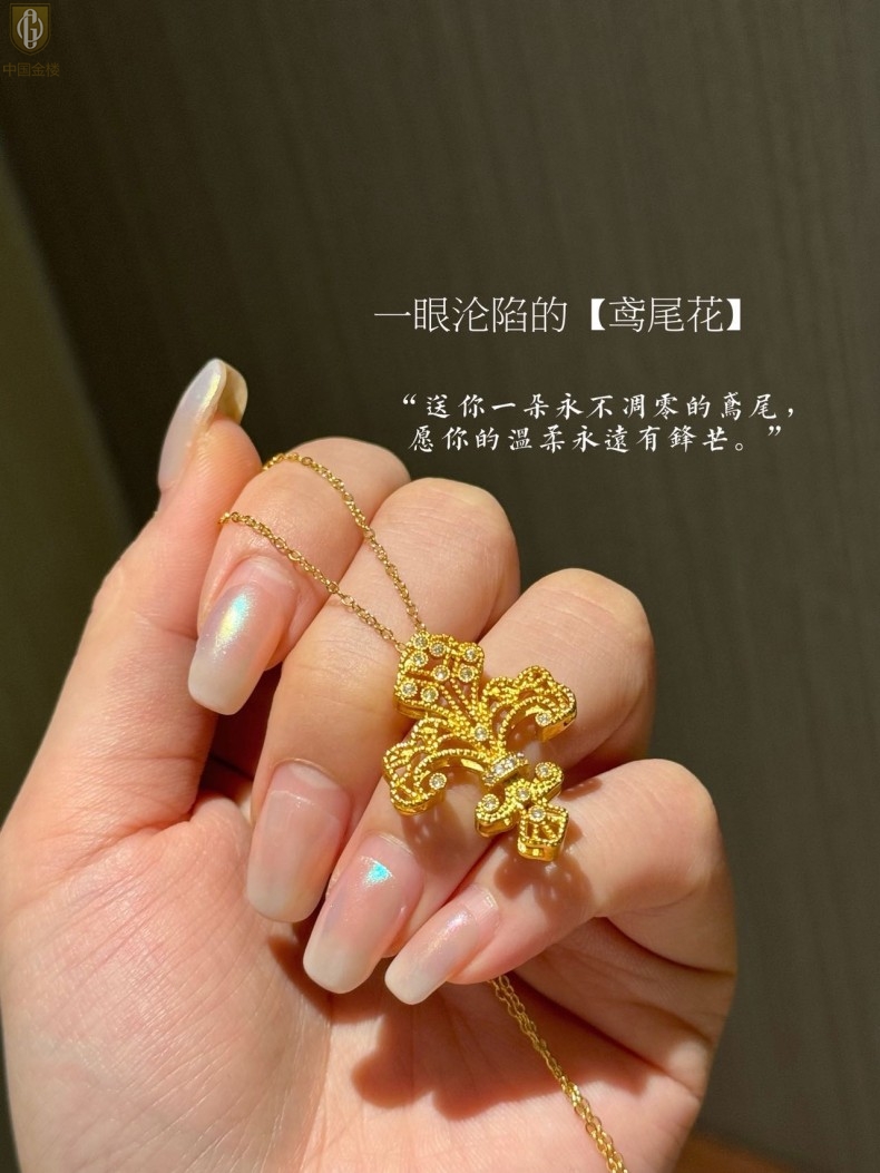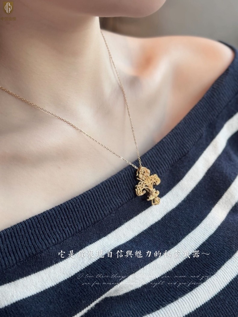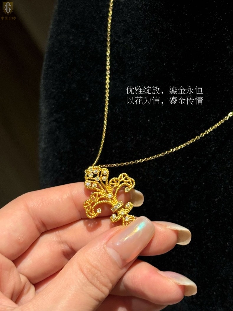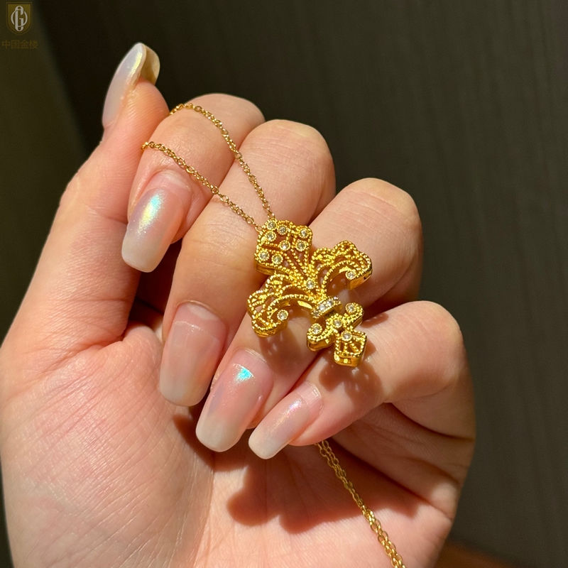 【品名】中国金楼镂空花丝璀璨鸢尾花K金吊坠(附赠K金项链)