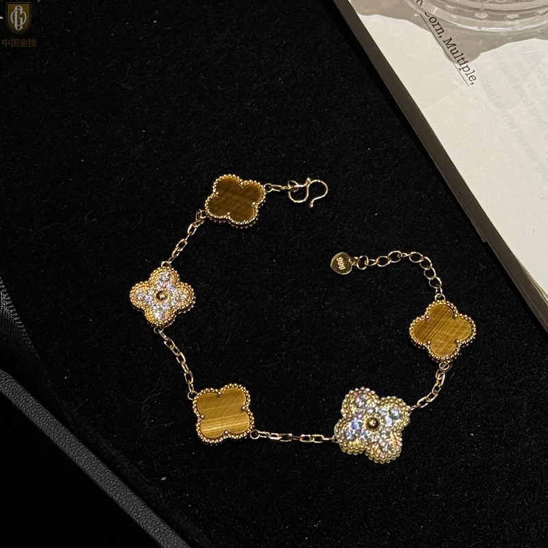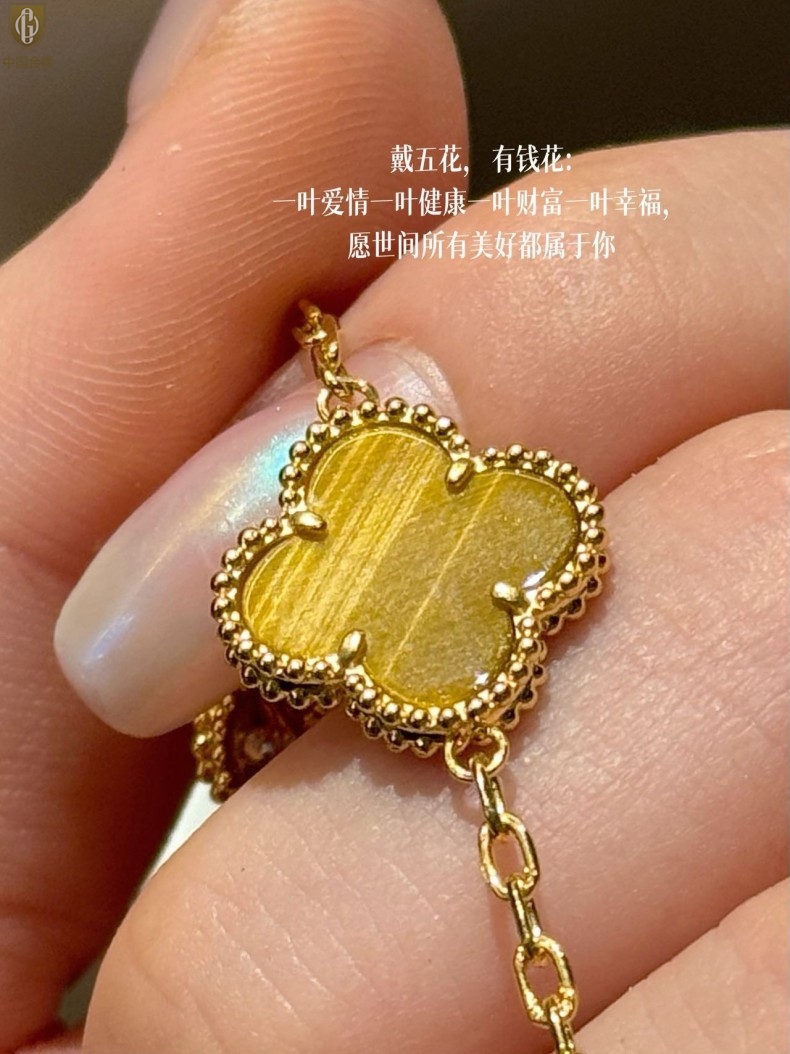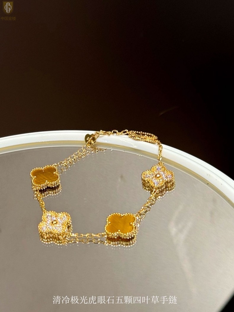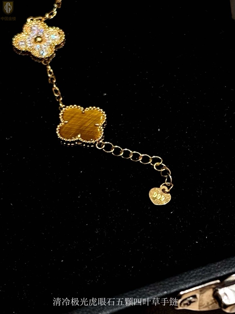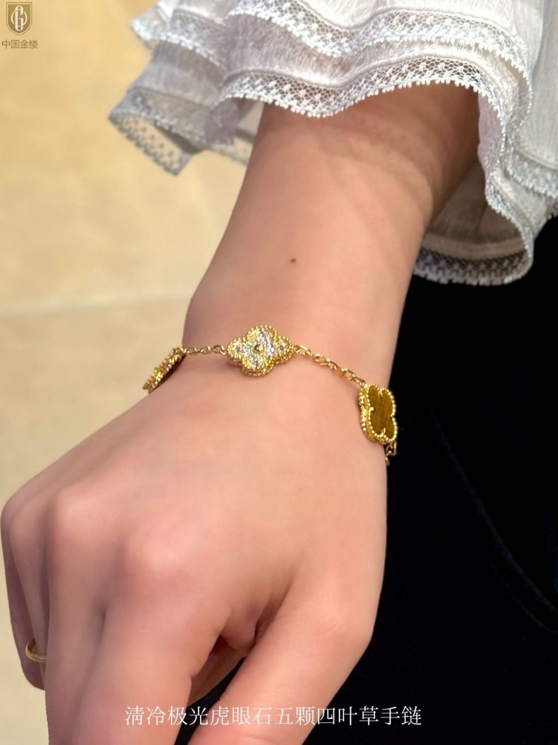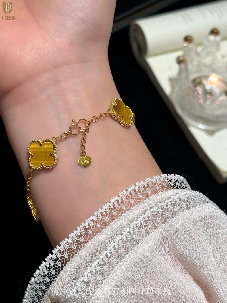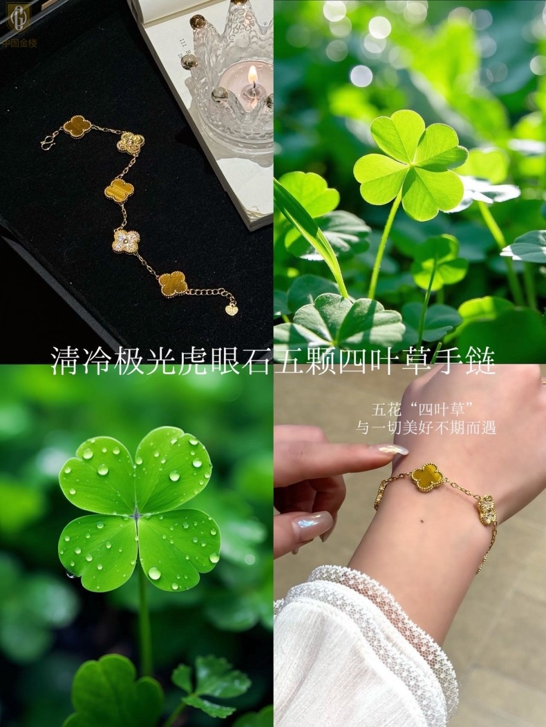 【品名】中国金楼清冷极光虎眼石五颗四叶草手链