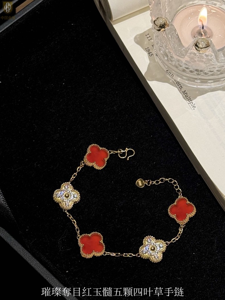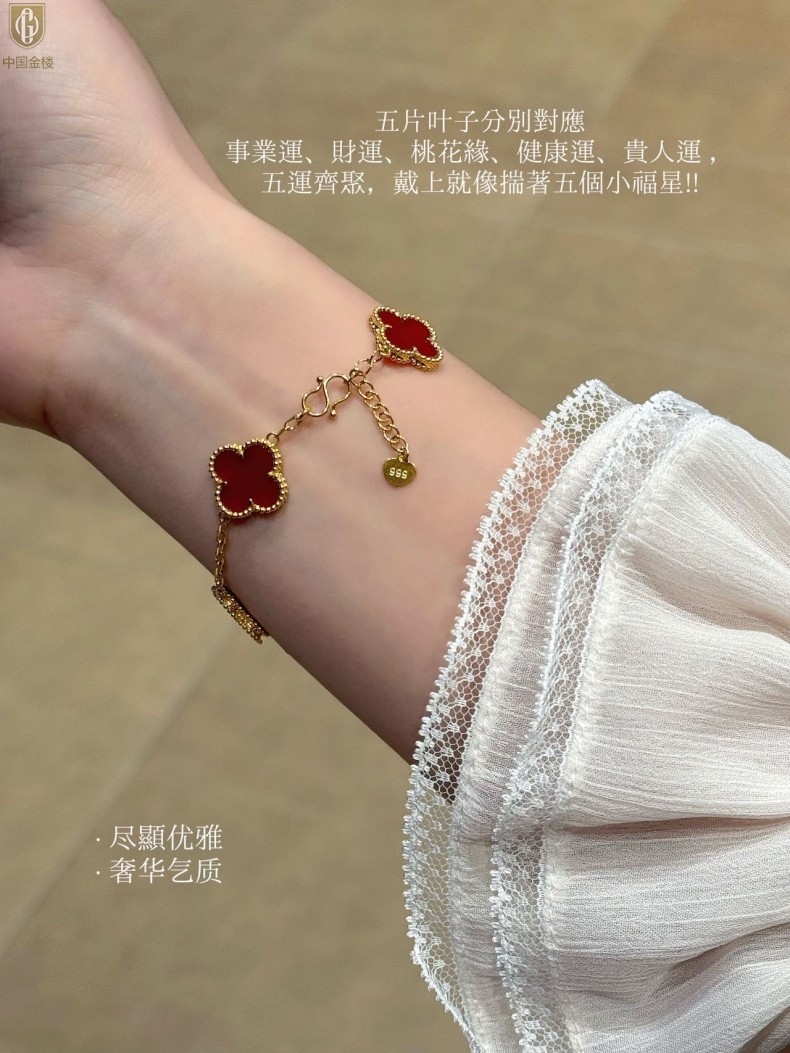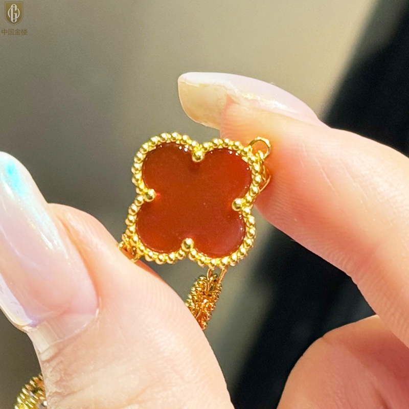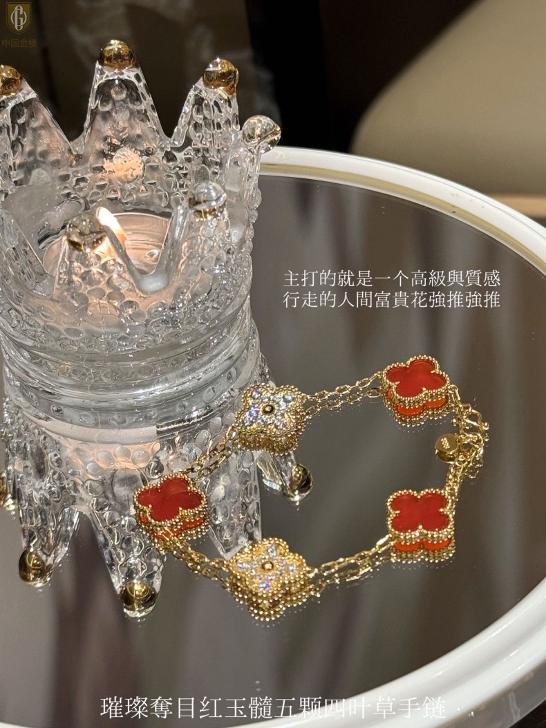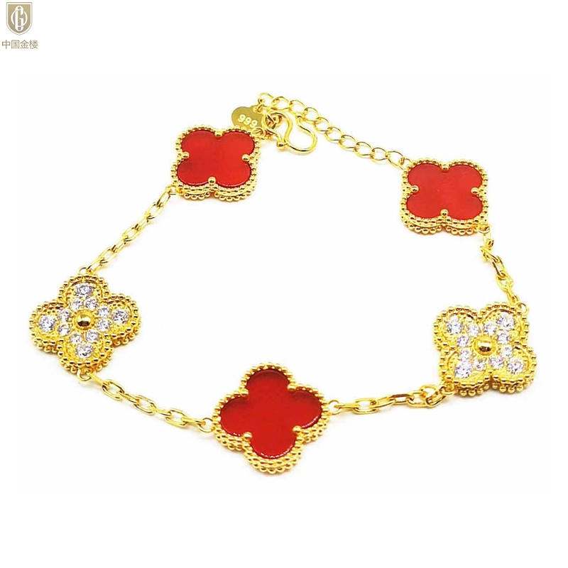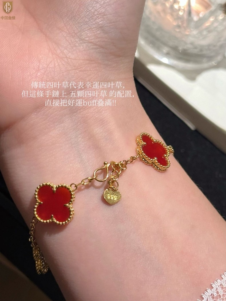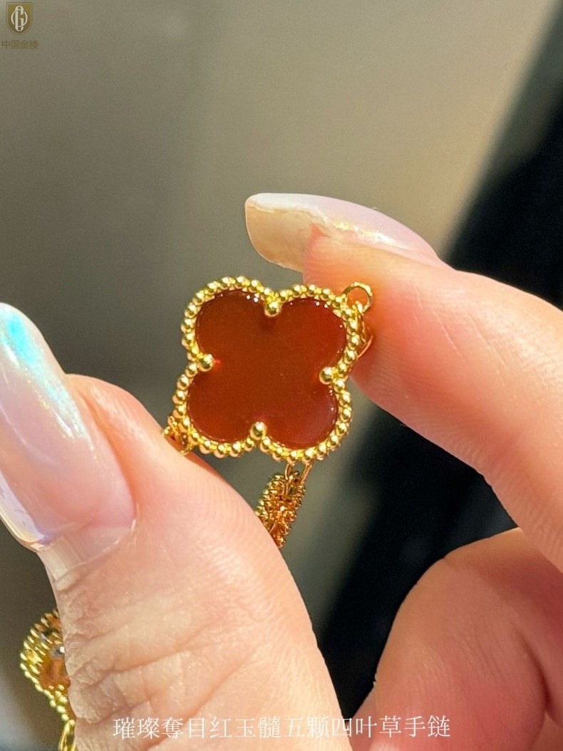 【品名】中国金楼璀璨夺目红玉髓五颗四叶草手链