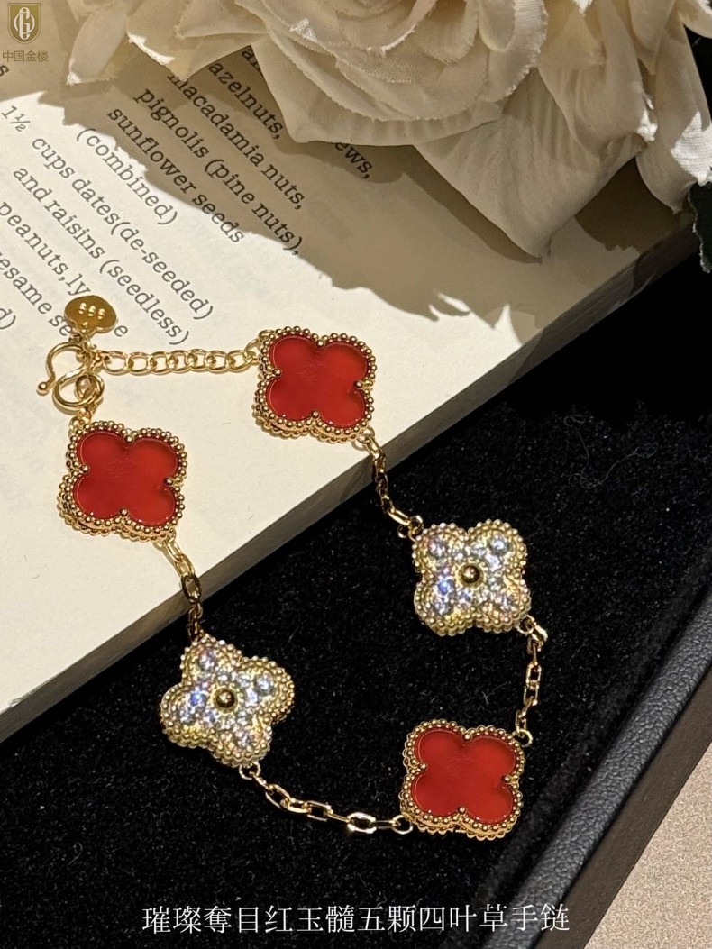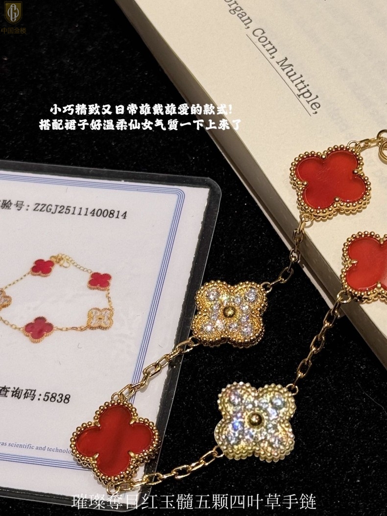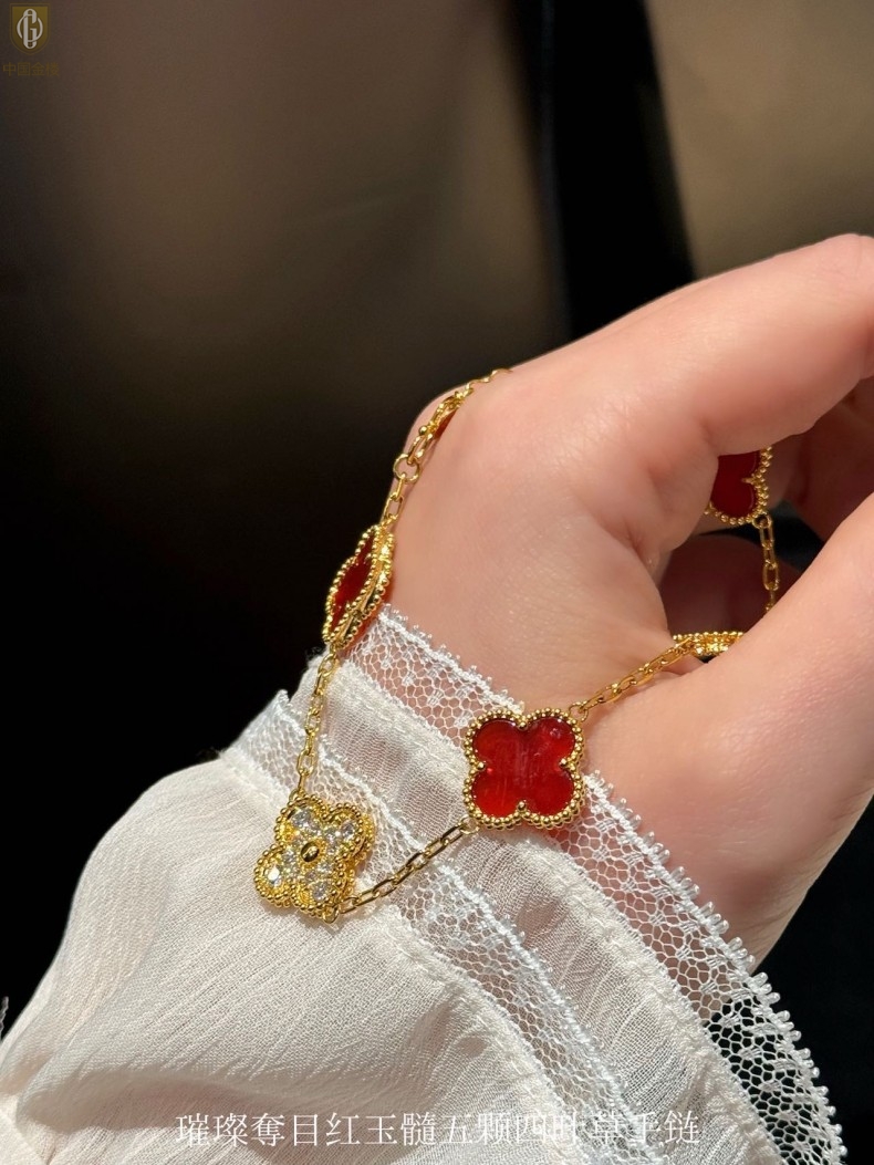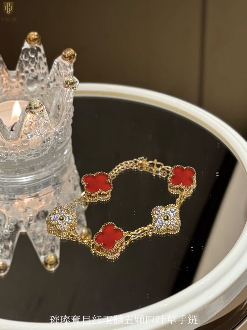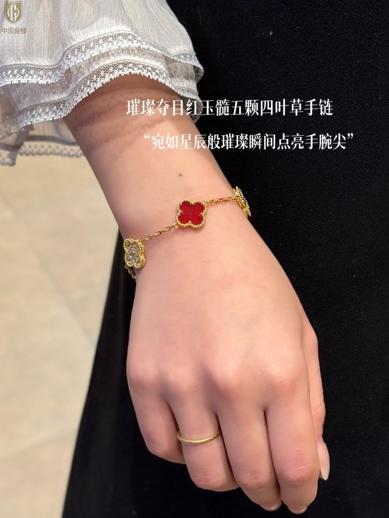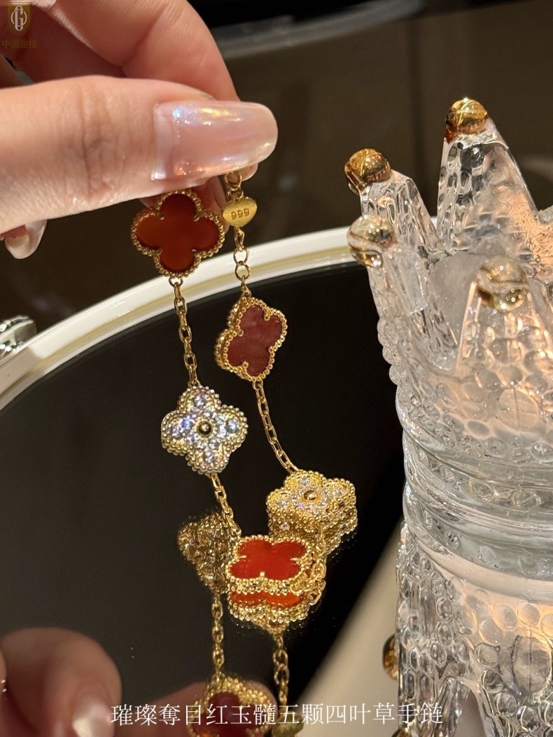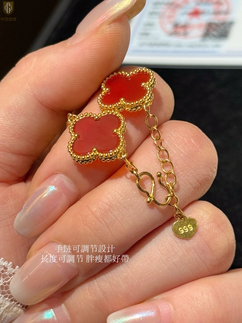 【品名】中国金楼璀璨夺目红玉髓五颗四叶草手链
