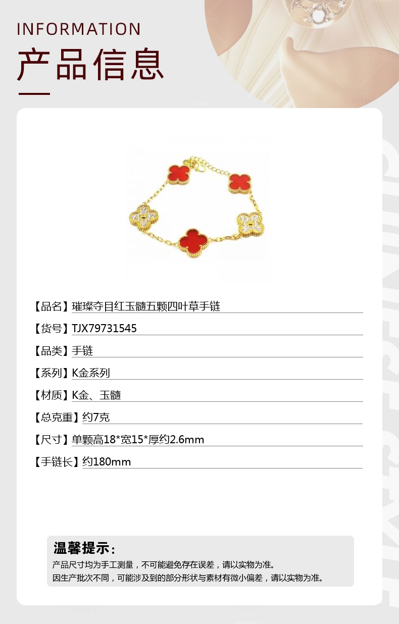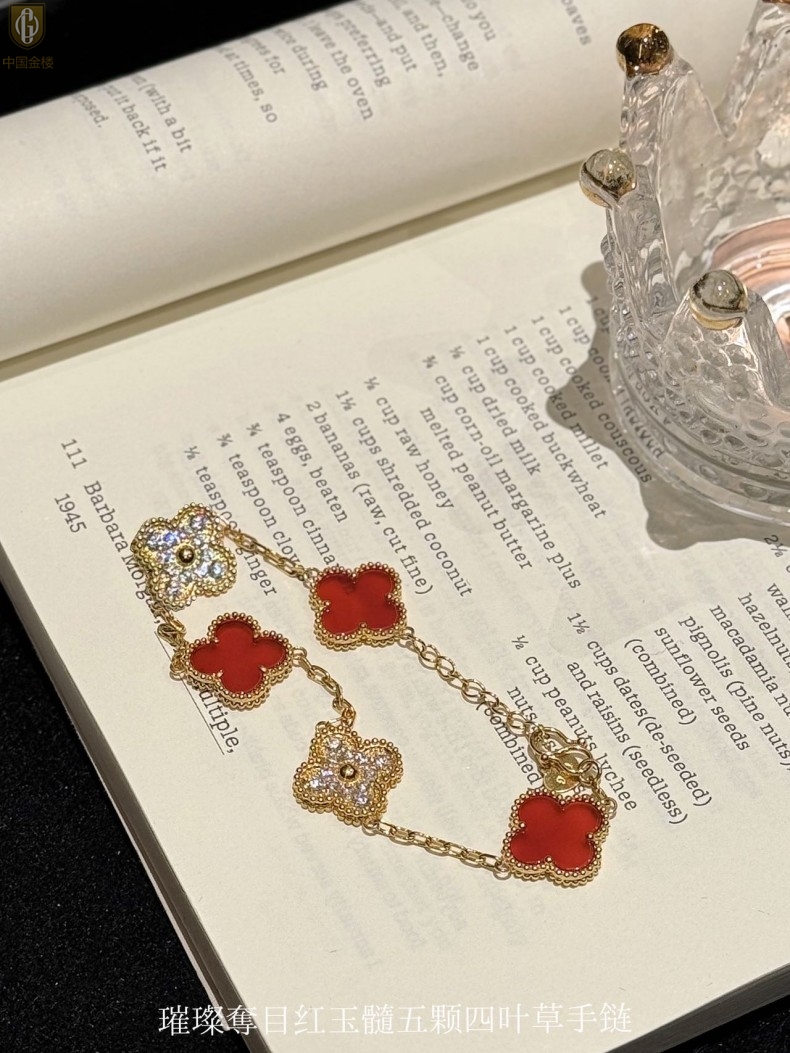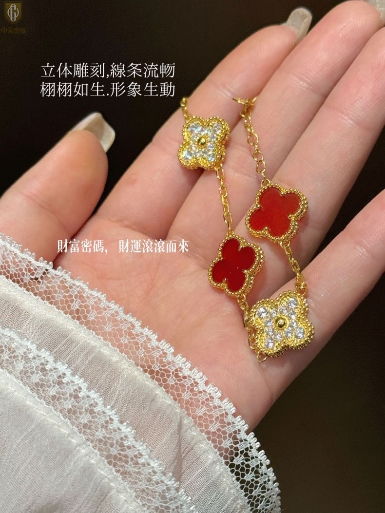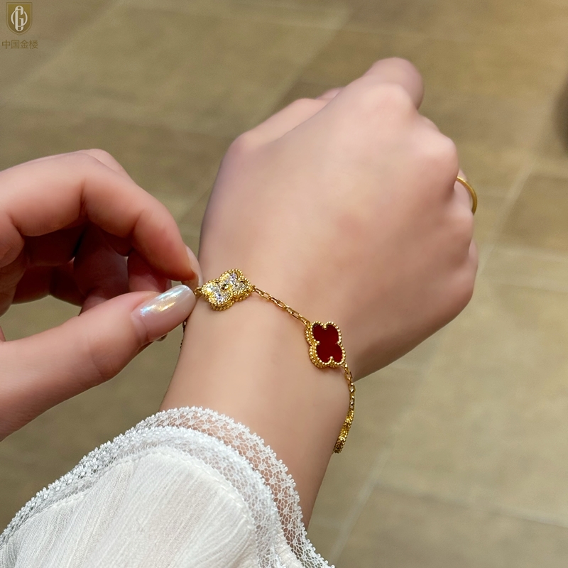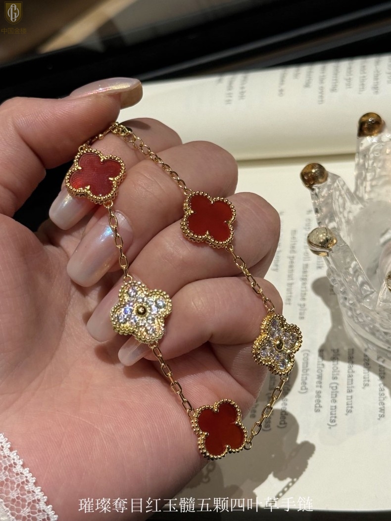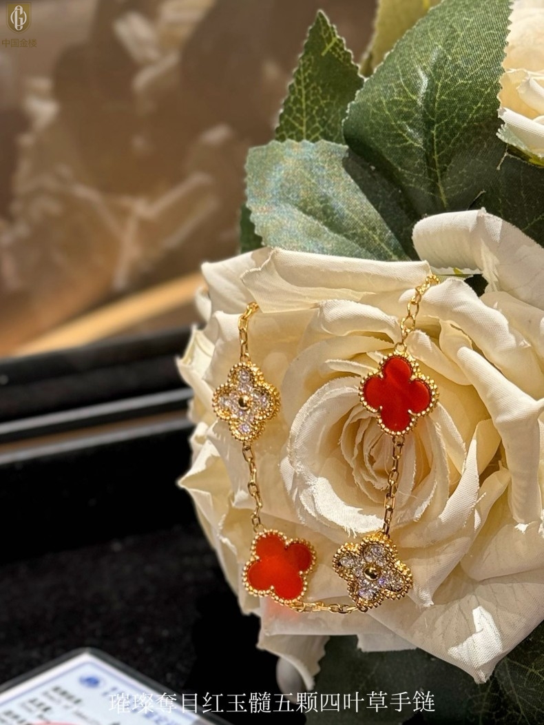 【品名】中国金楼璀璨夺目红玉髓五颗四叶草手链