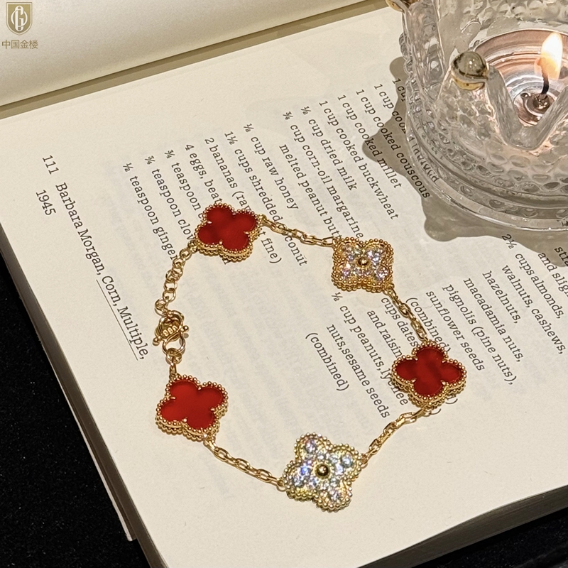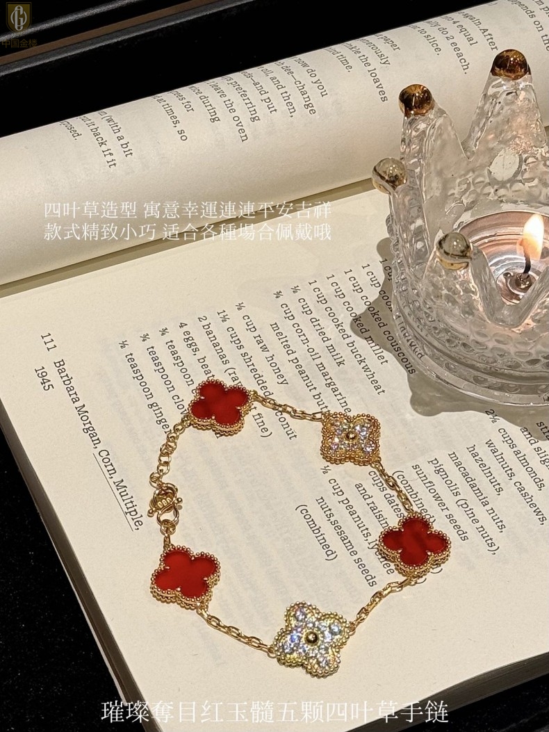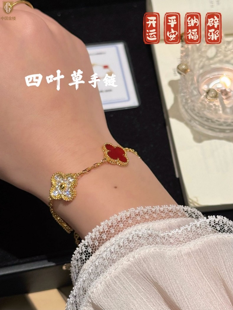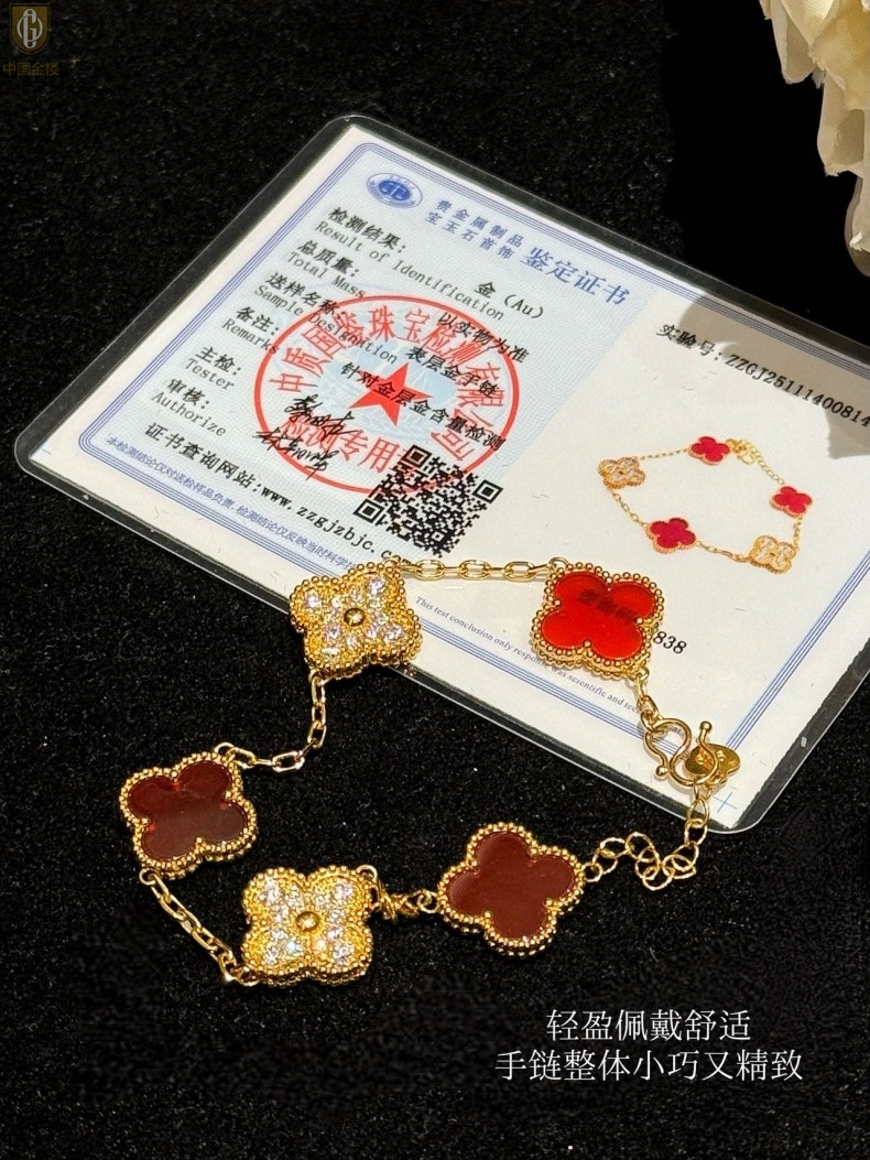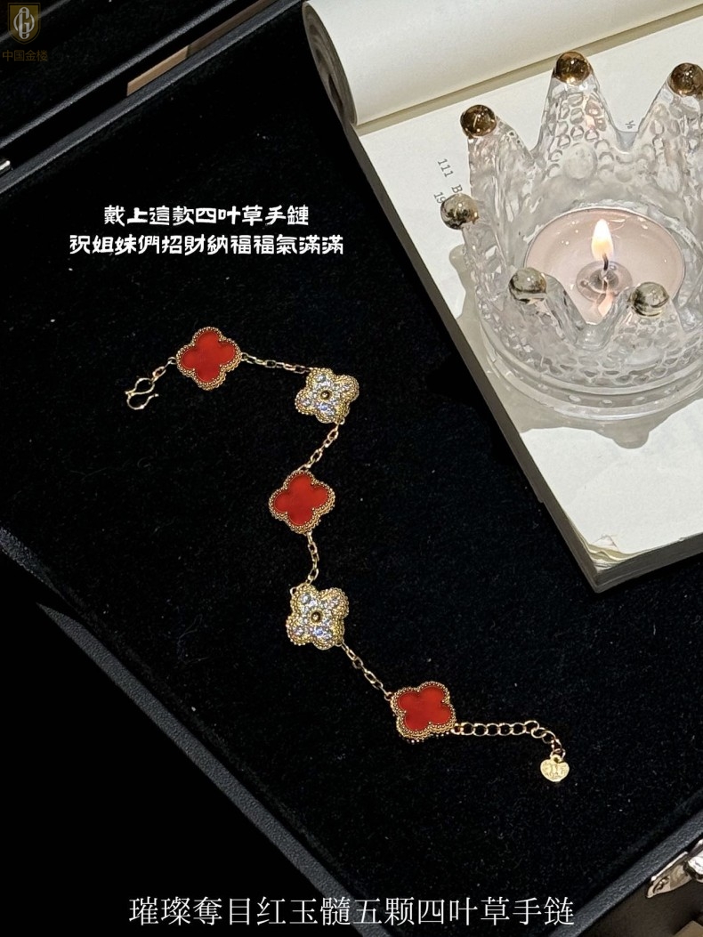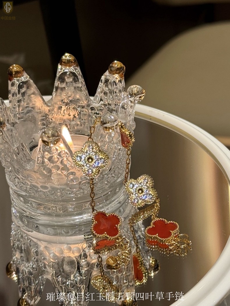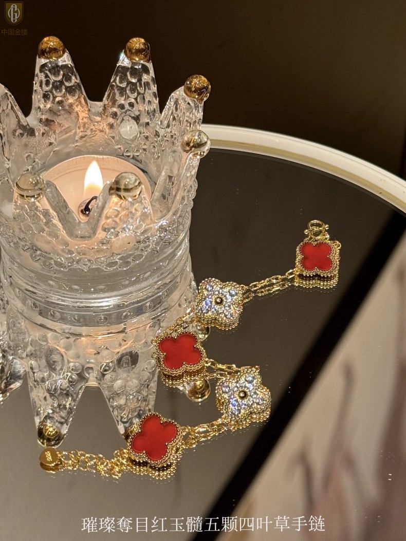 【品名】中国金楼璀璨夺目红玉髓五颗四叶草手链
