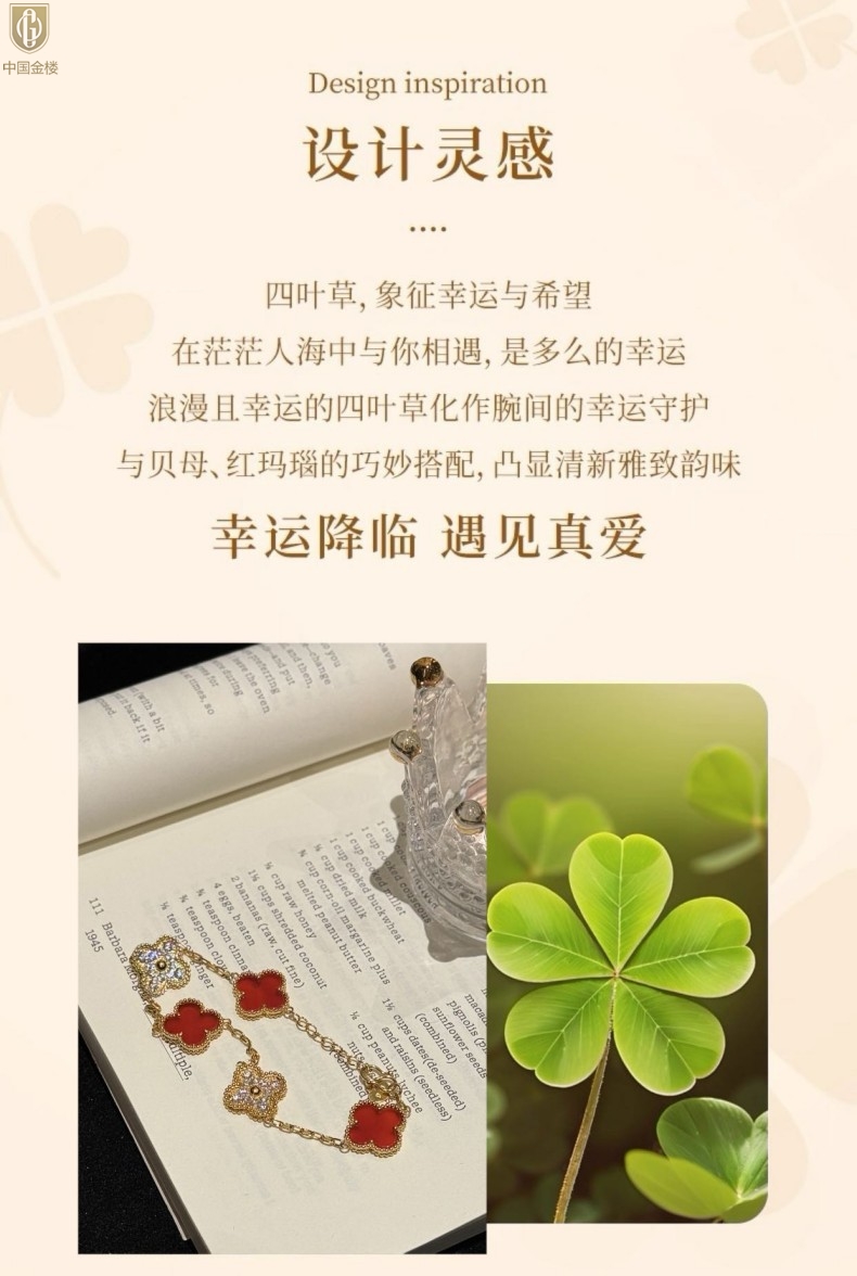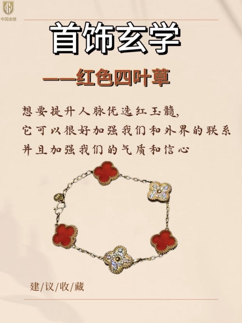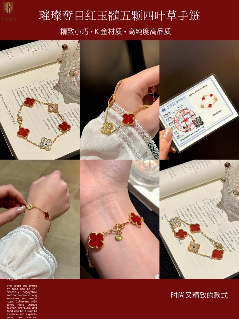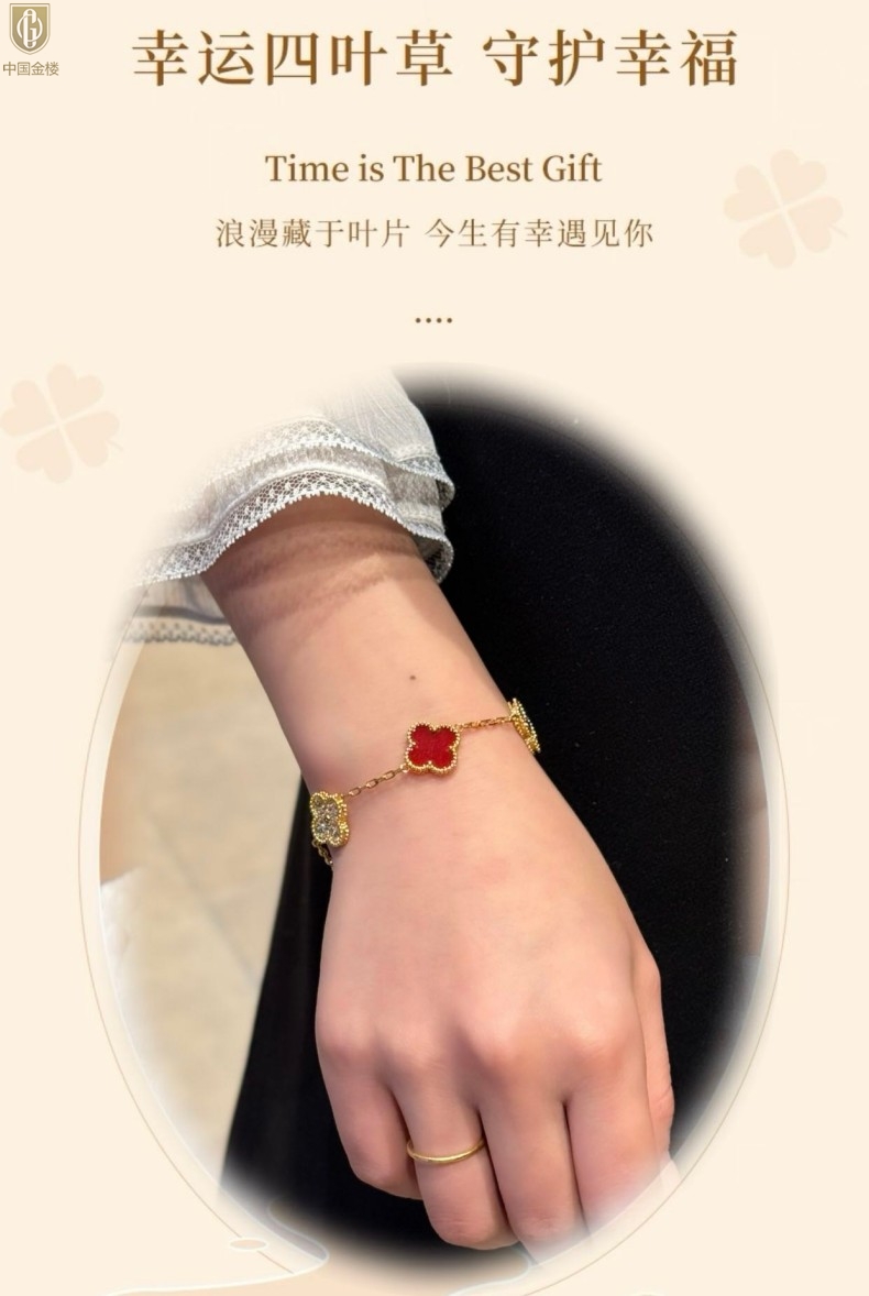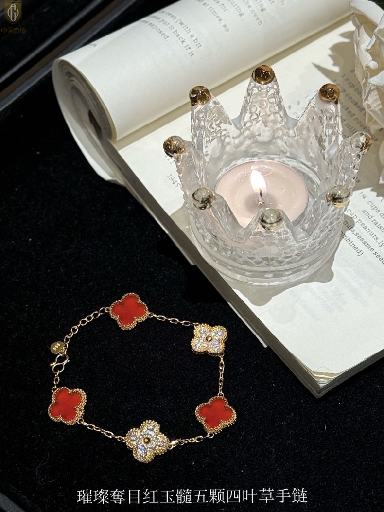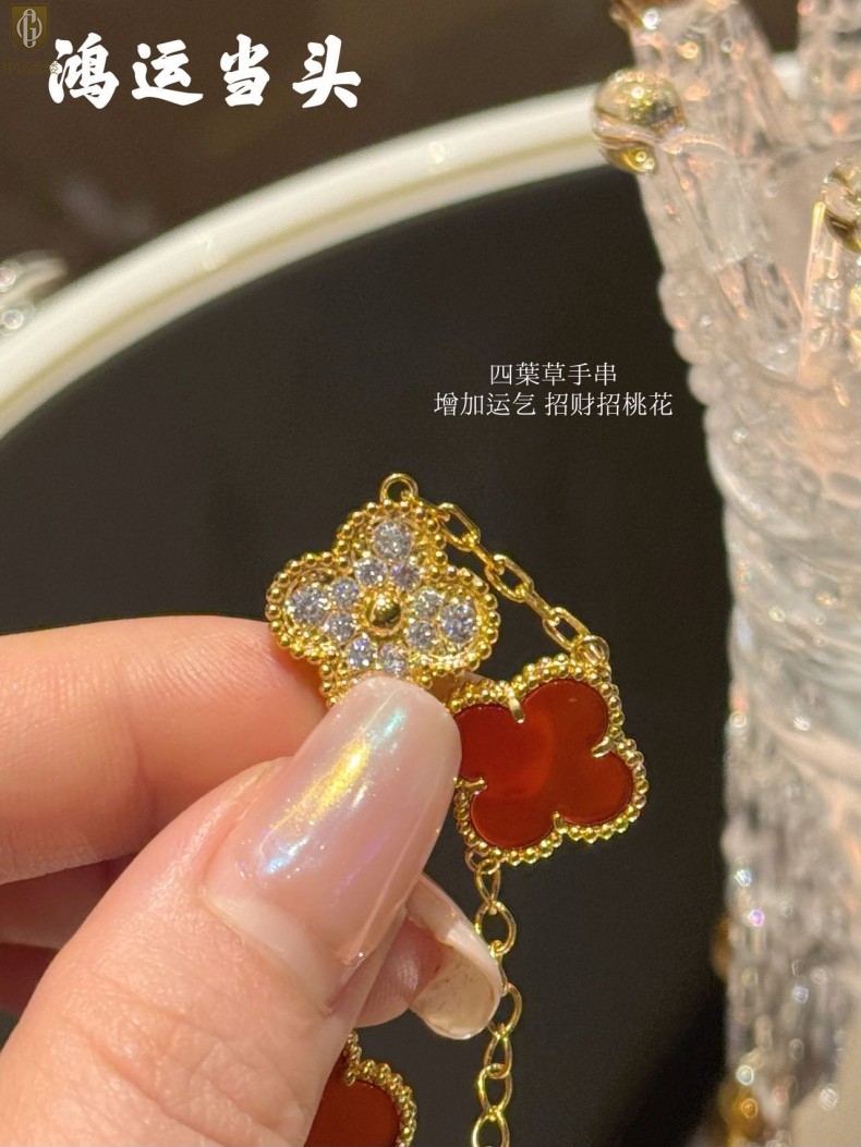 【品名】中国金楼璀璨夺目红玉髓五颗四叶草手链
