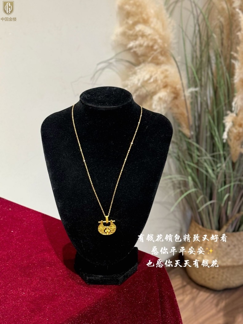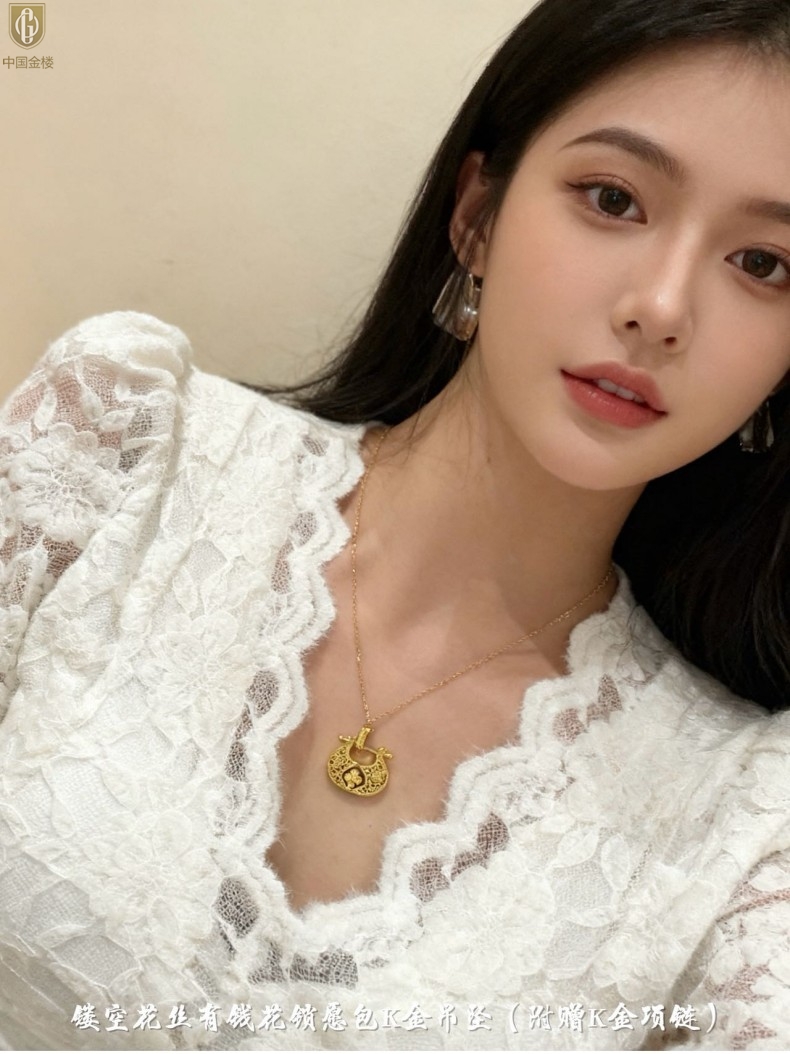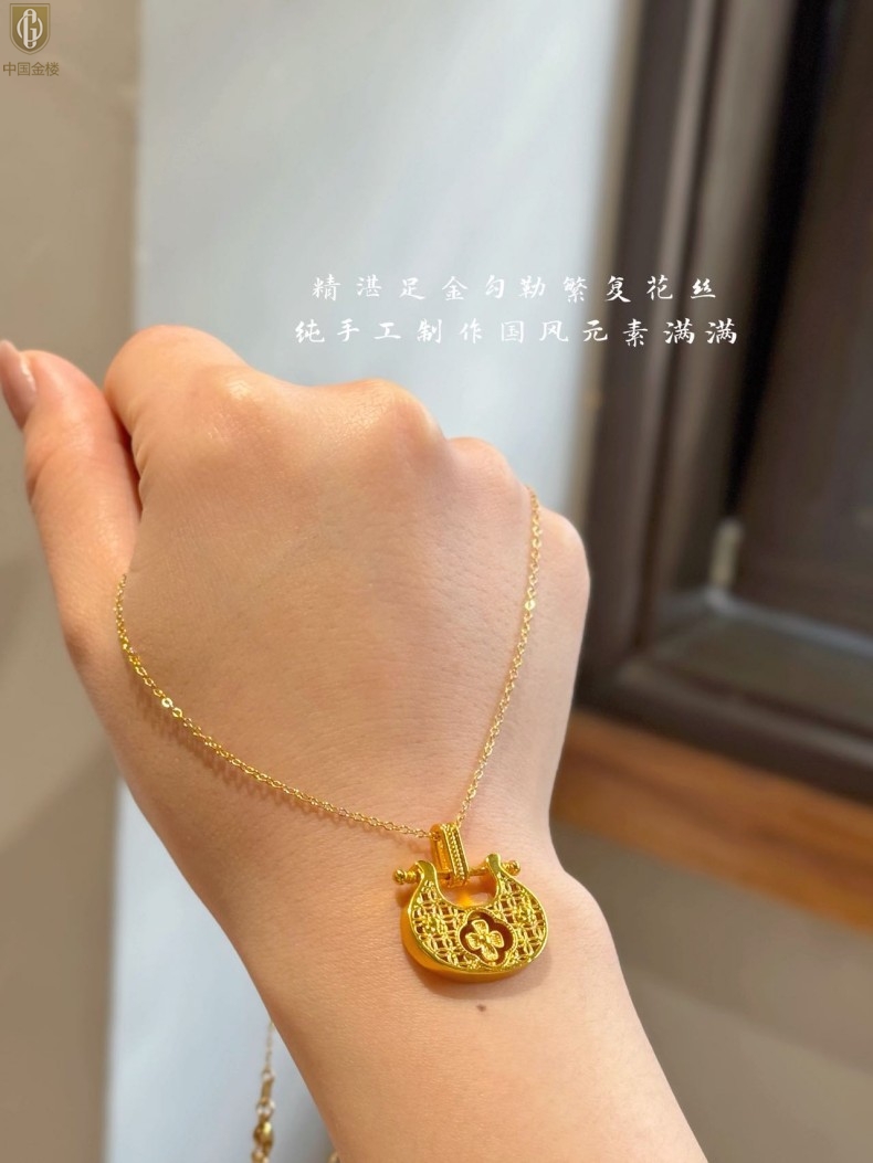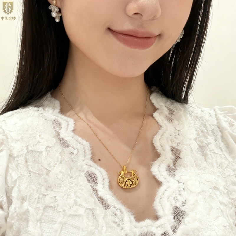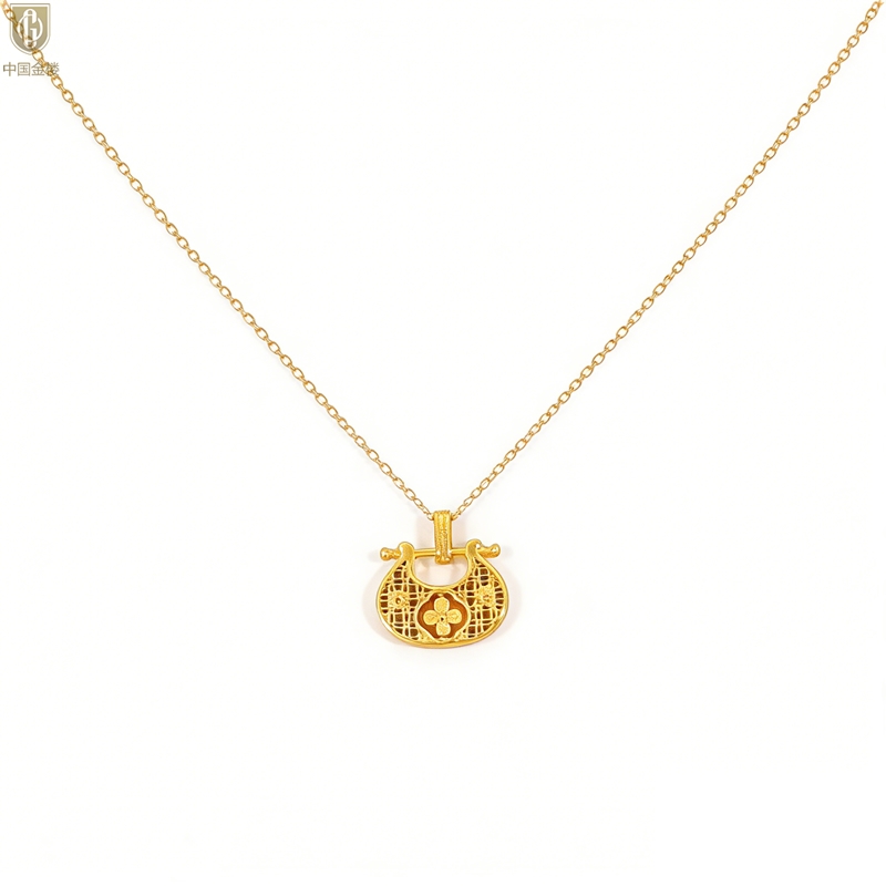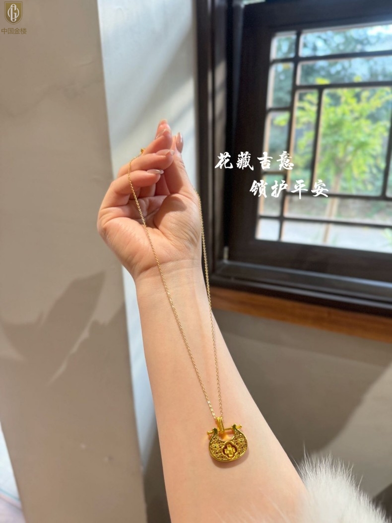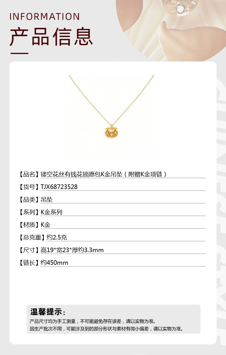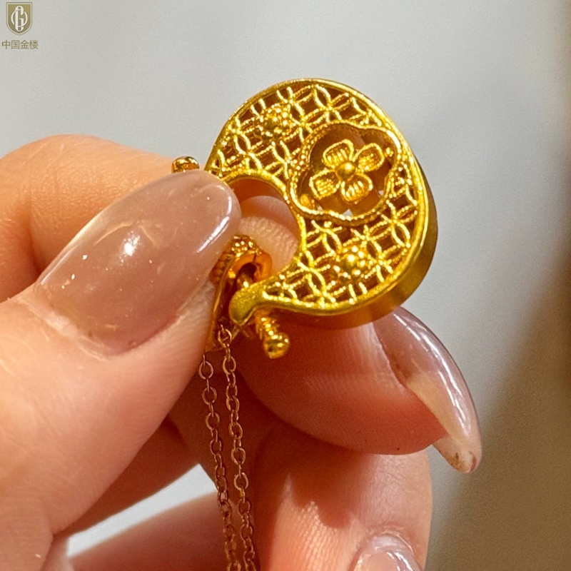 【品名】中国金楼镂空花丝有钱花锁愿包K金吊坠(附赠K金项链)