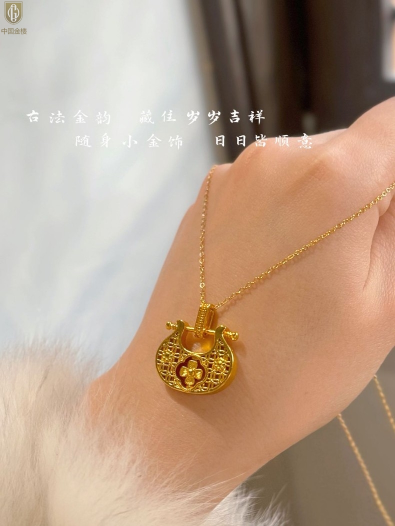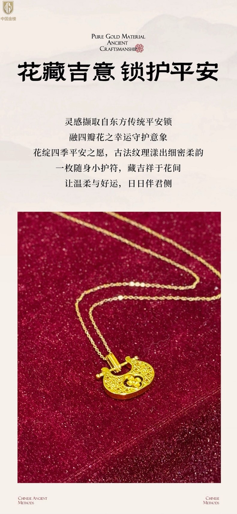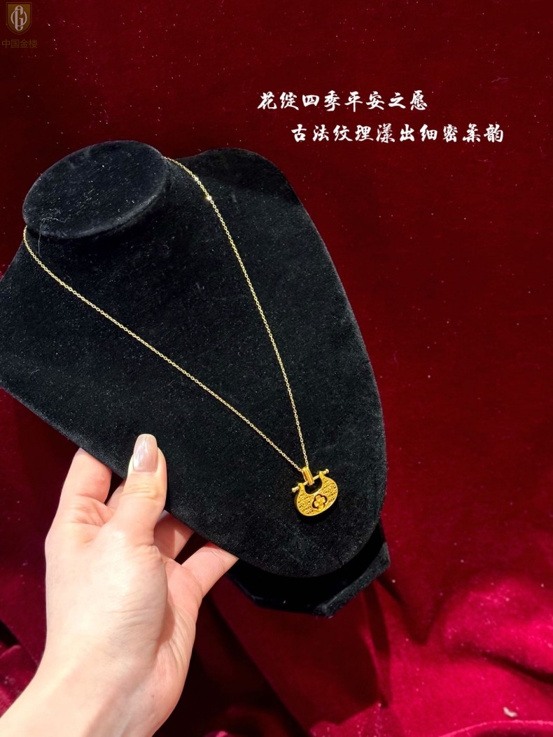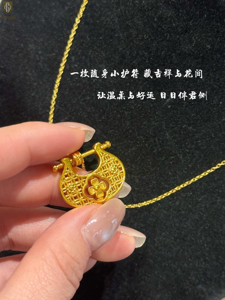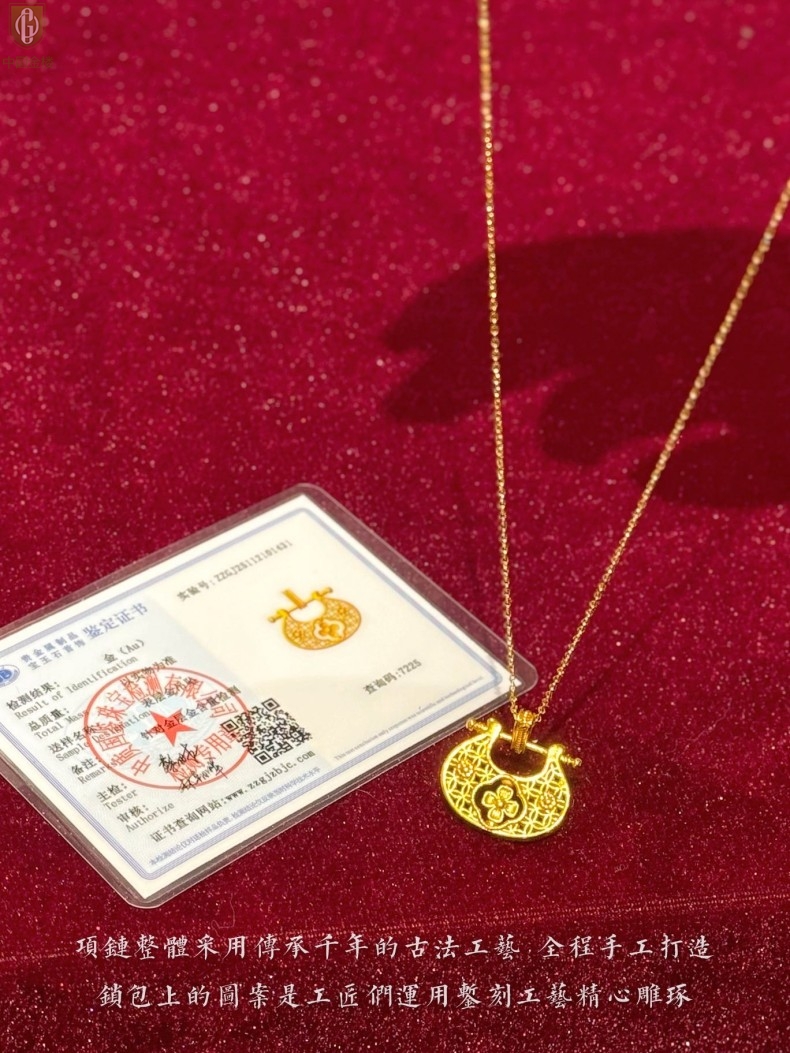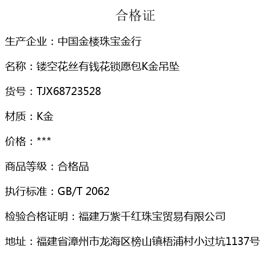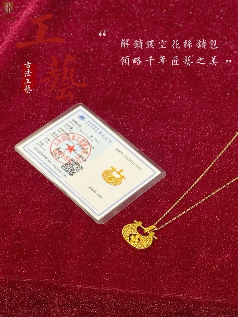 【品名】中国金楼镂空花丝有钱花锁愿包K金吊坠(附赠K金项链)