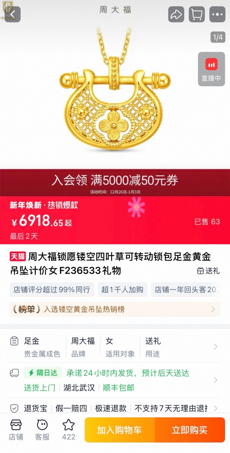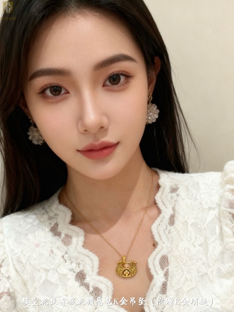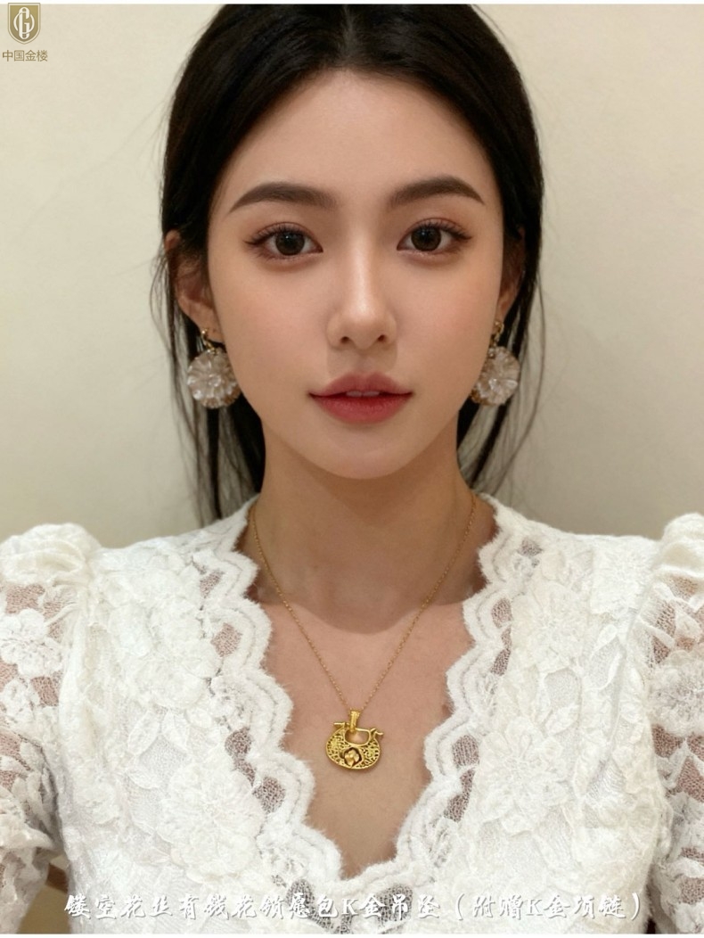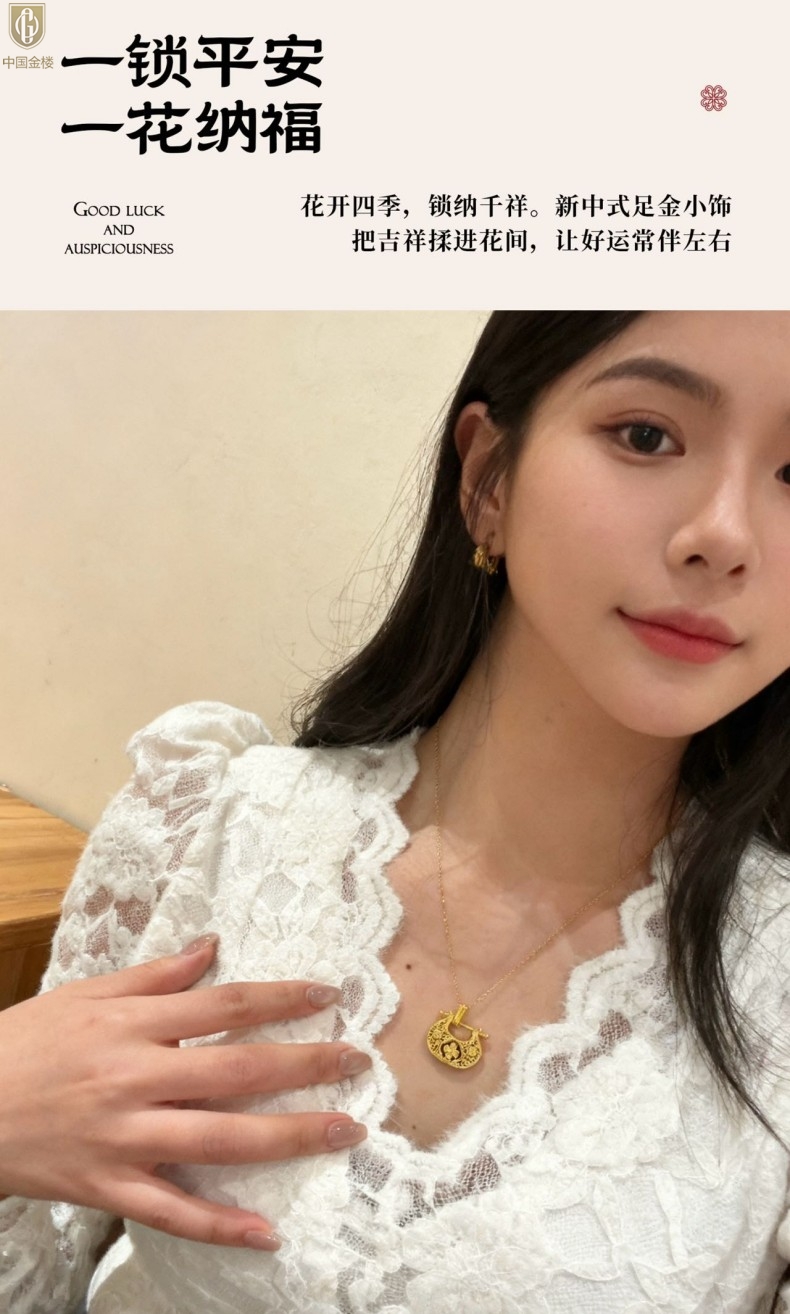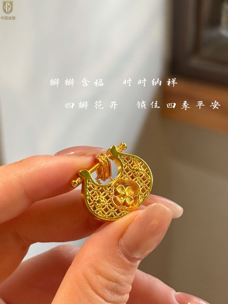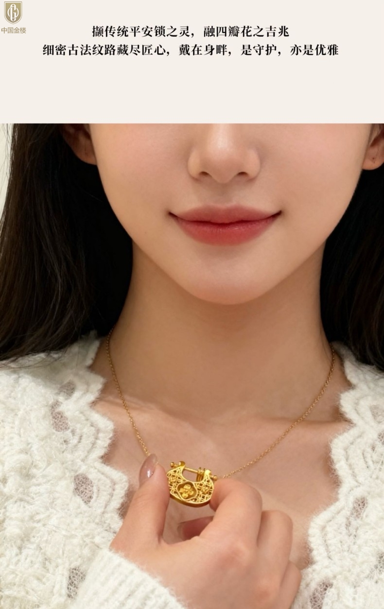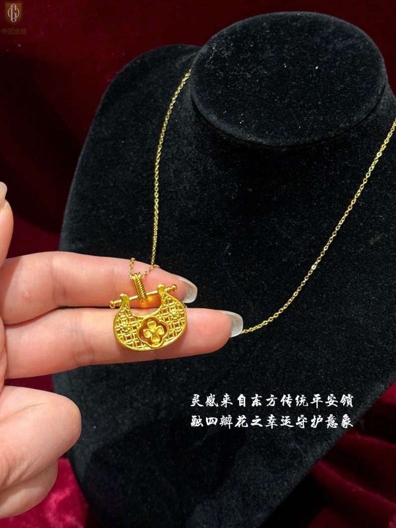 【品名】中国金楼镂空花丝有钱花锁愿包K金吊坠(附赠K金项链)