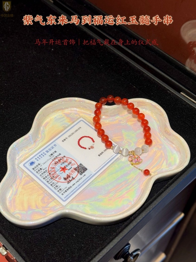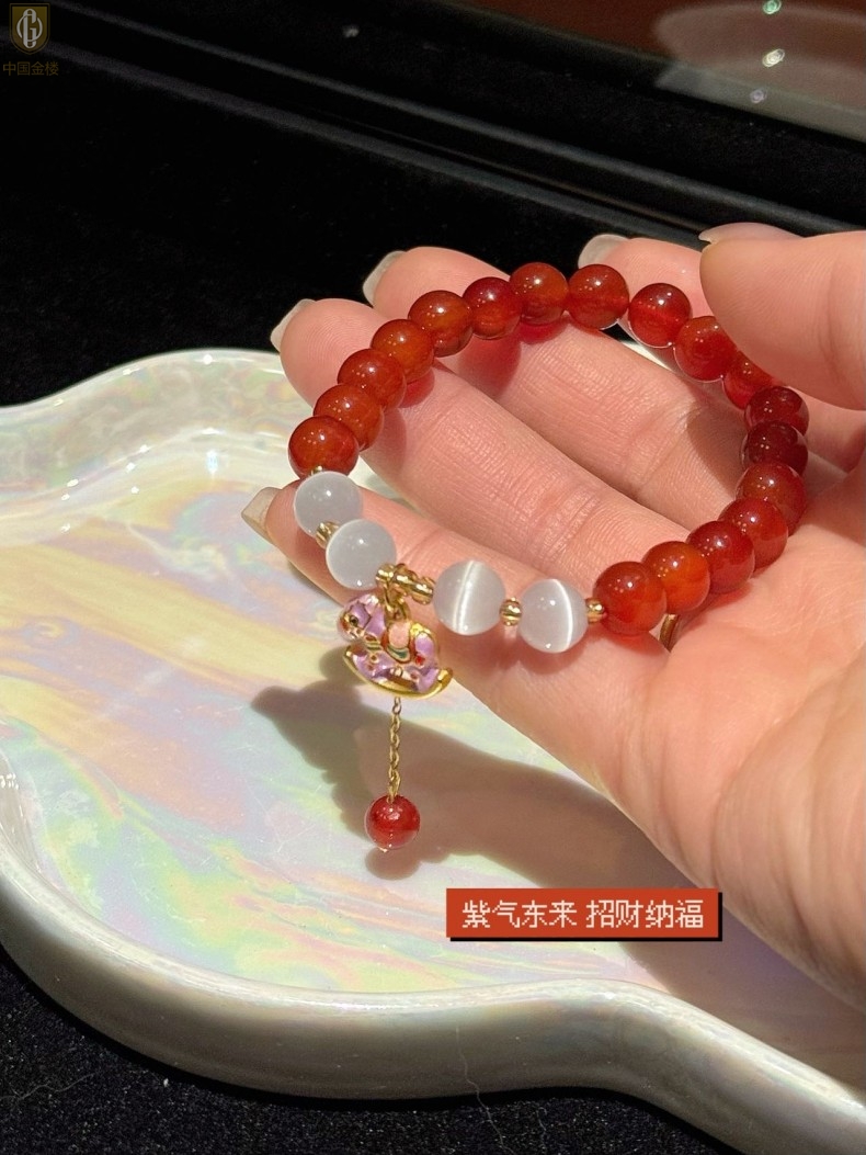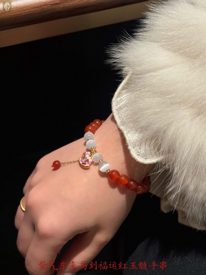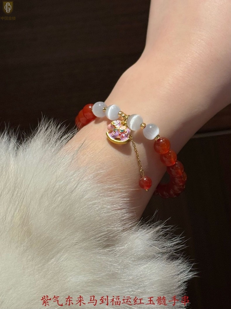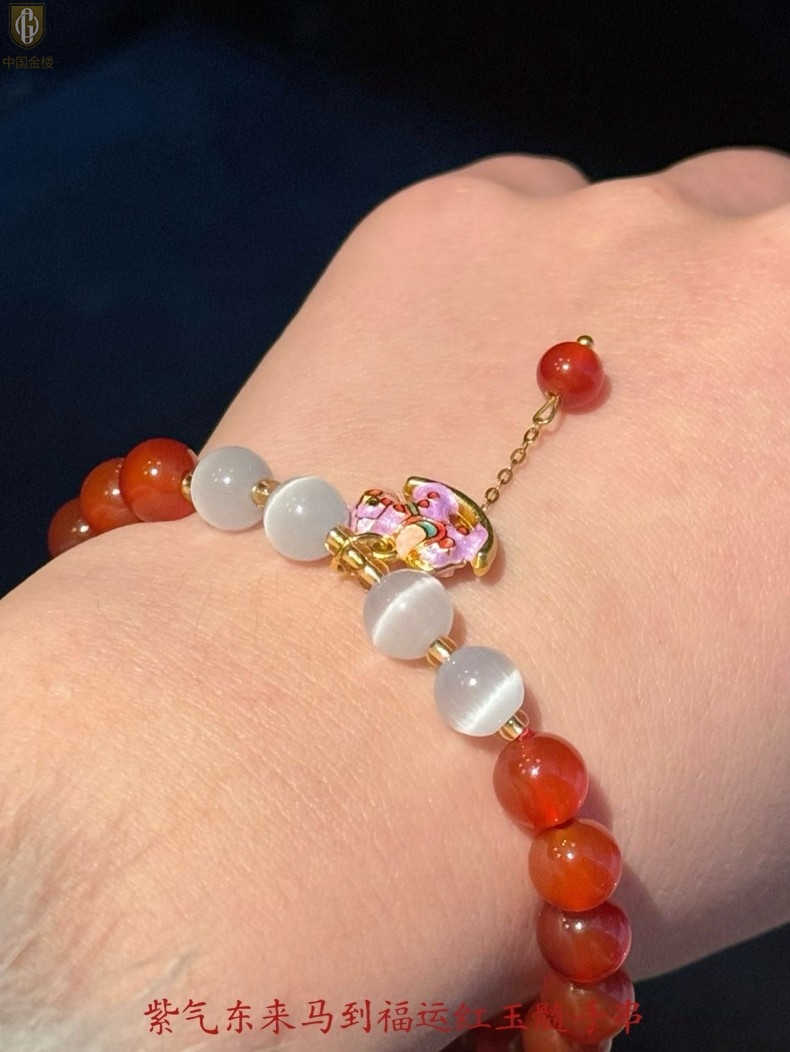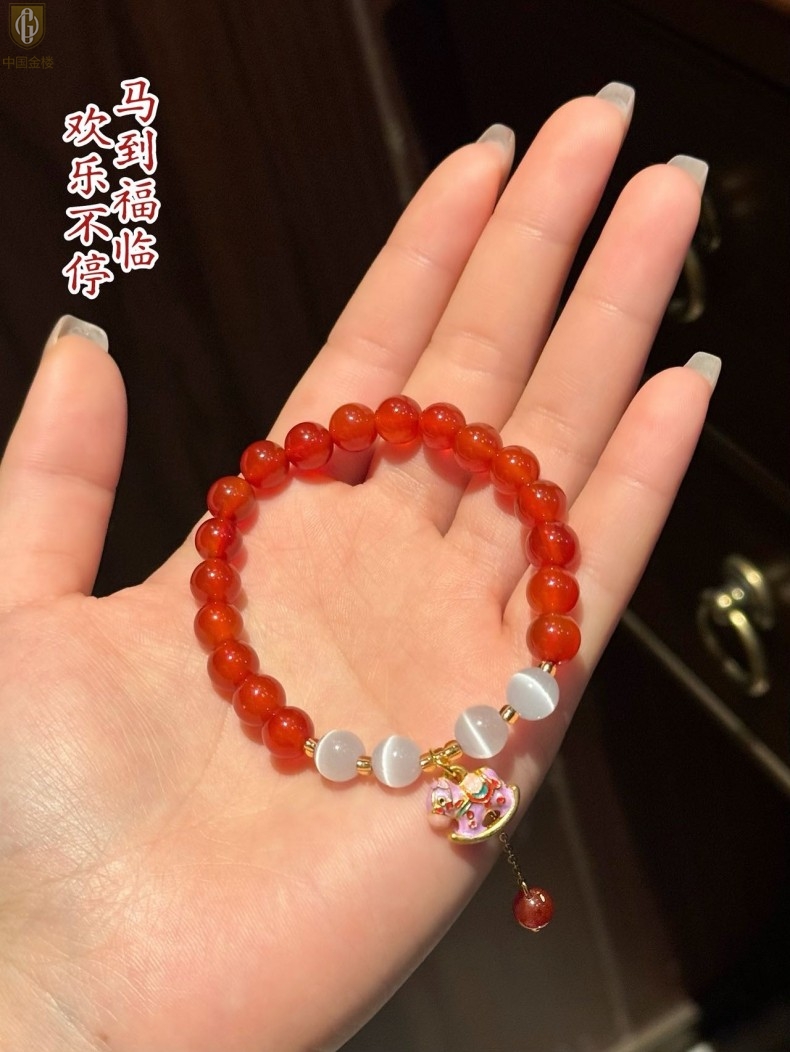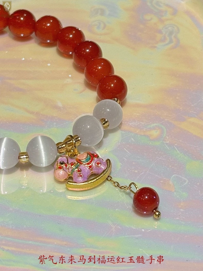 【品名】中国金楼紫气东来马到福运红玉髓手串