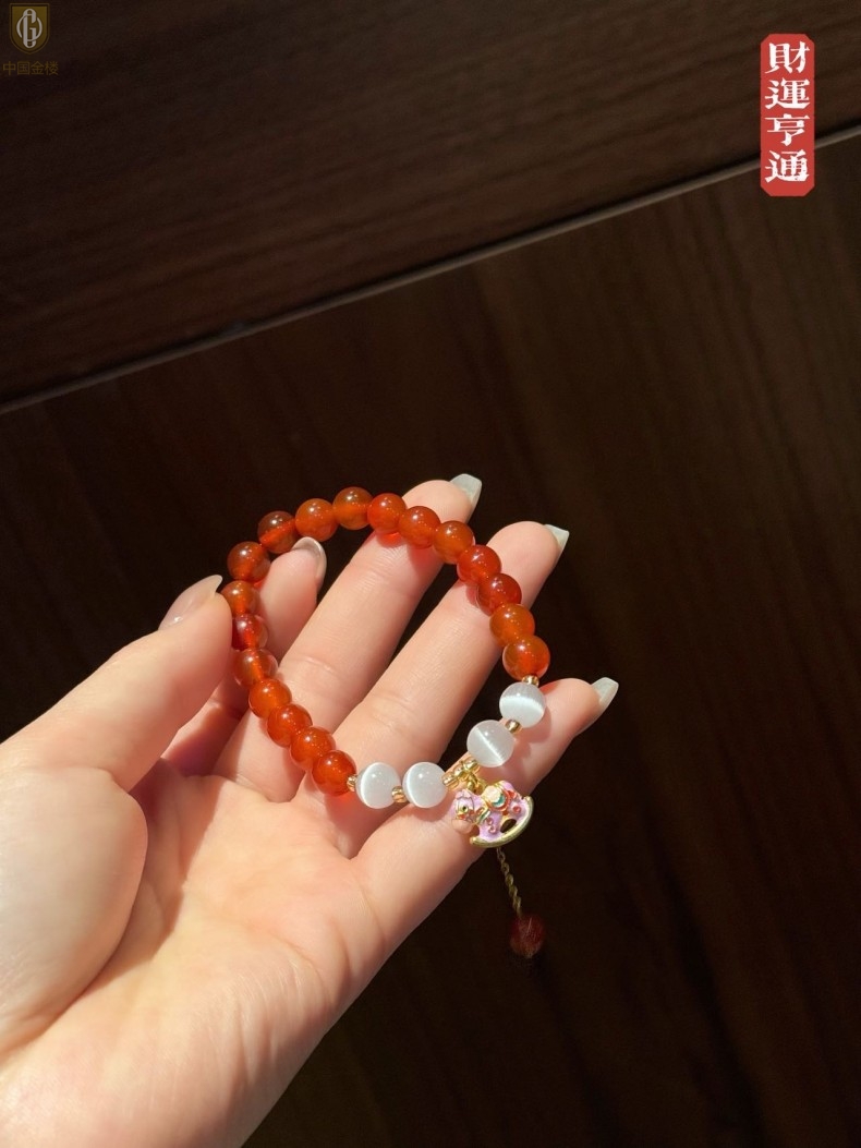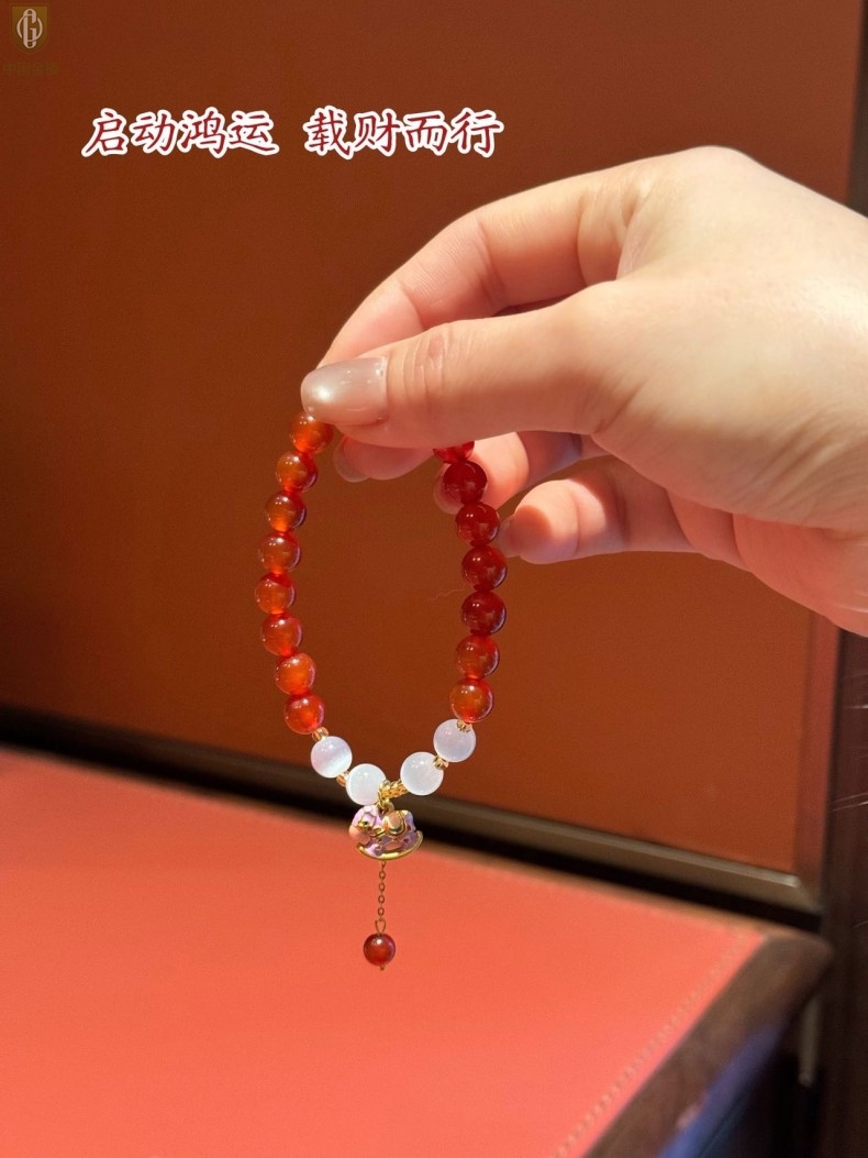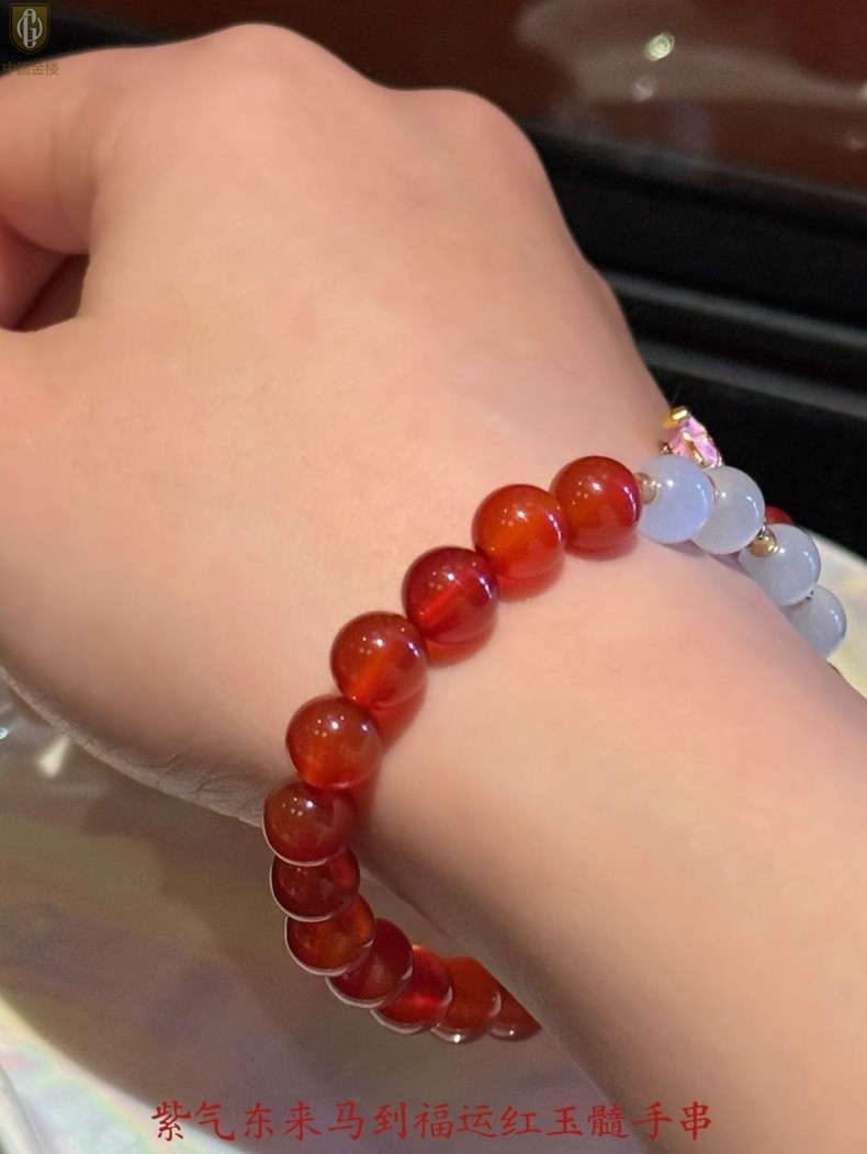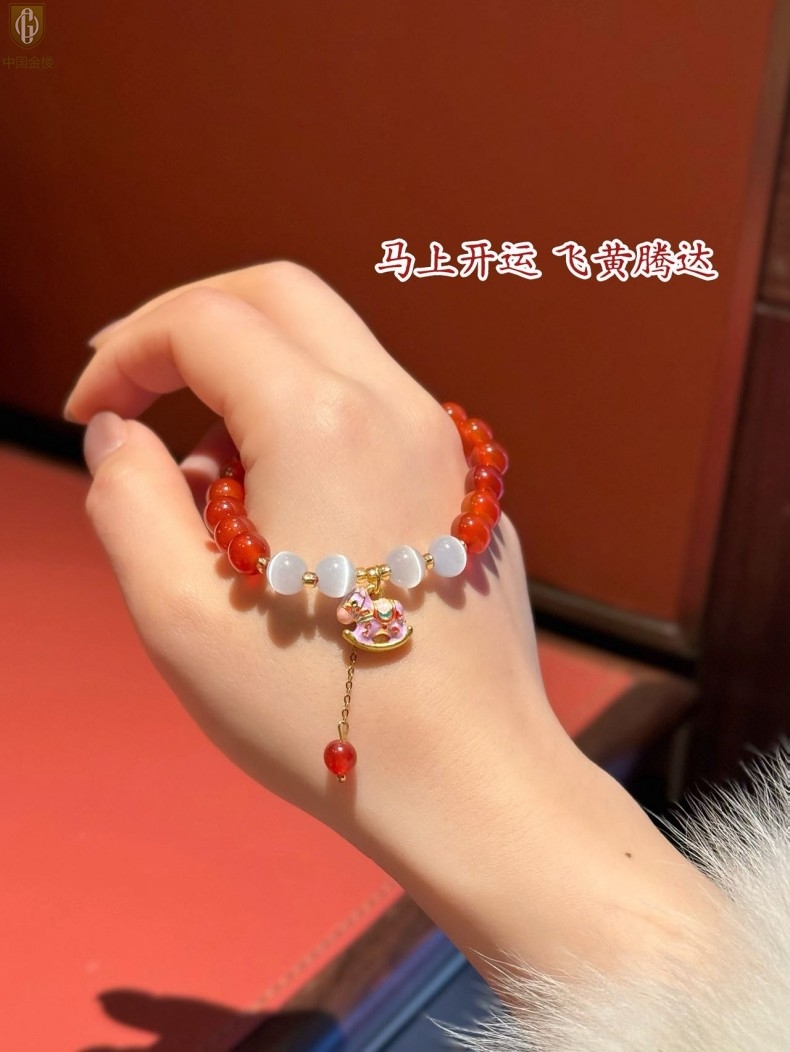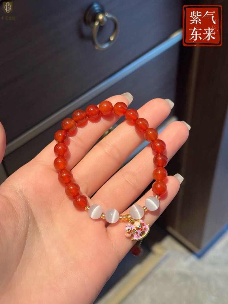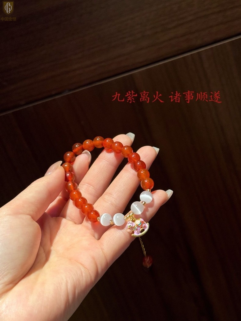 【品名】中国金楼紫气东来马到福运红玉髓手串