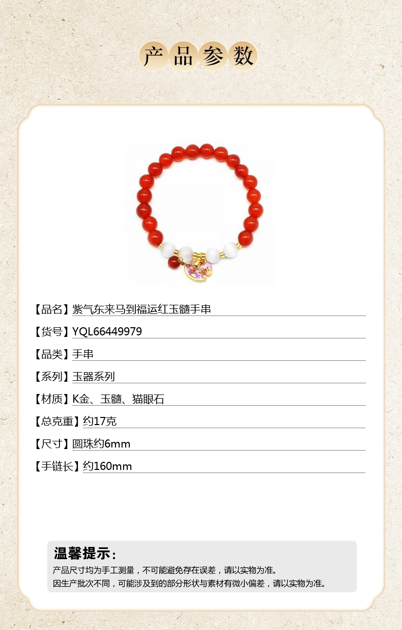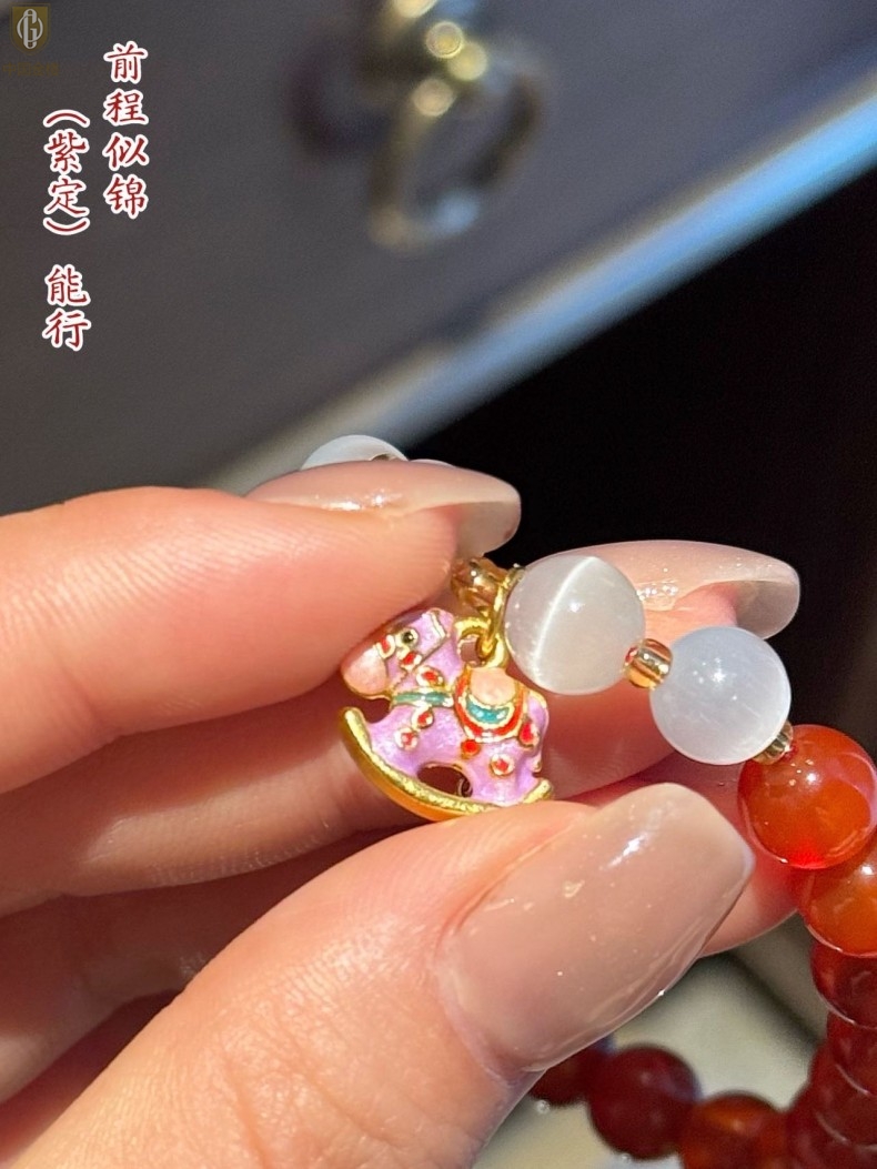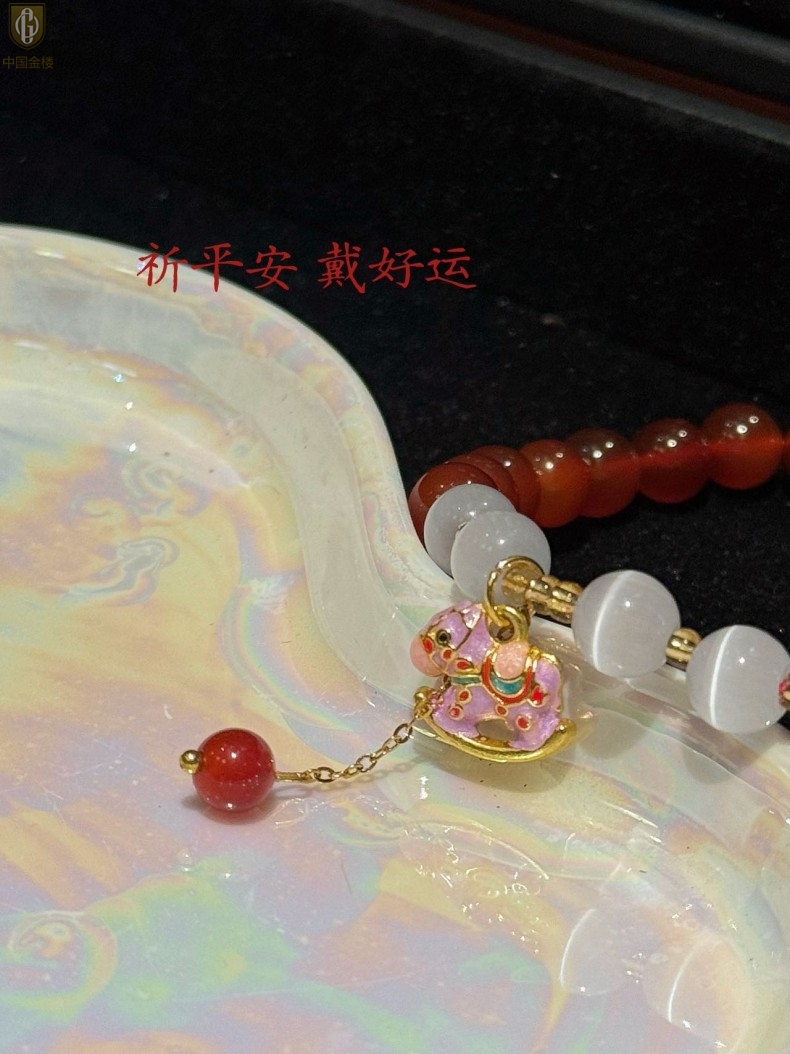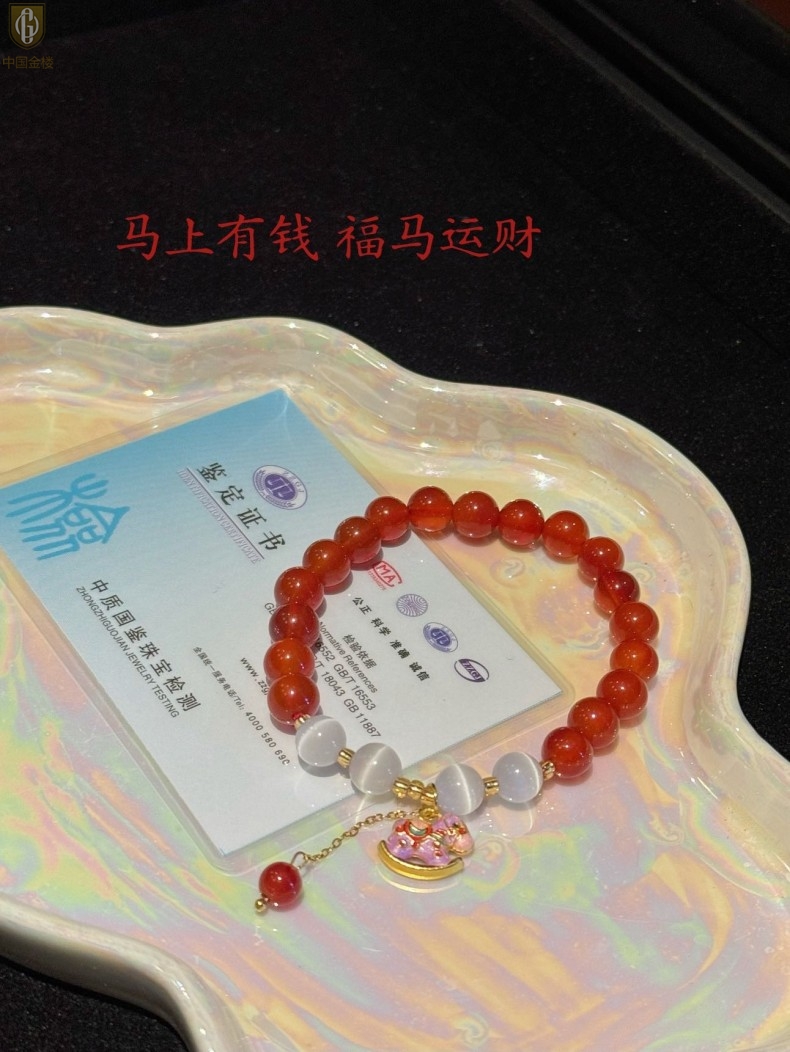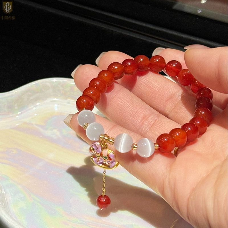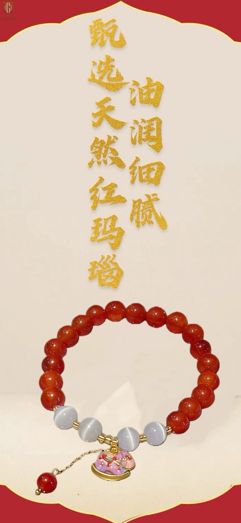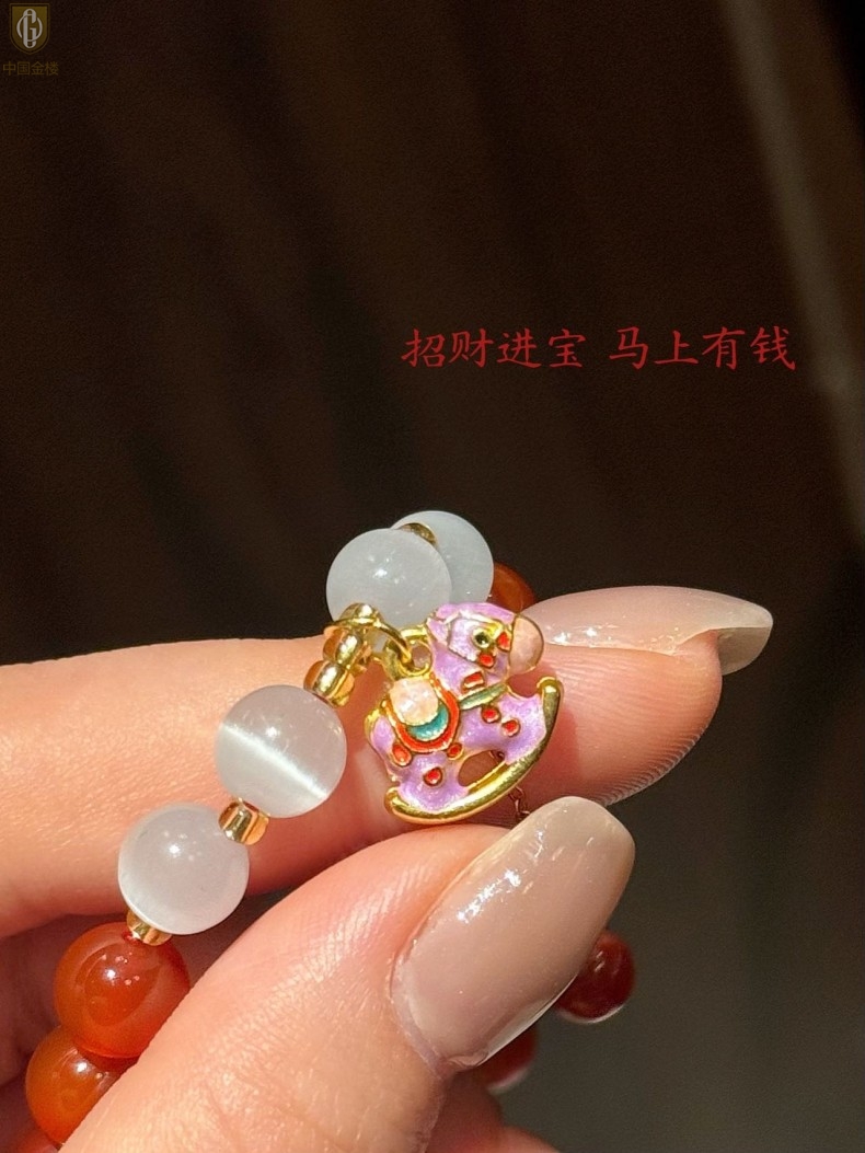 【品名】中国金楼紫气东来马到福运红玉髓手串